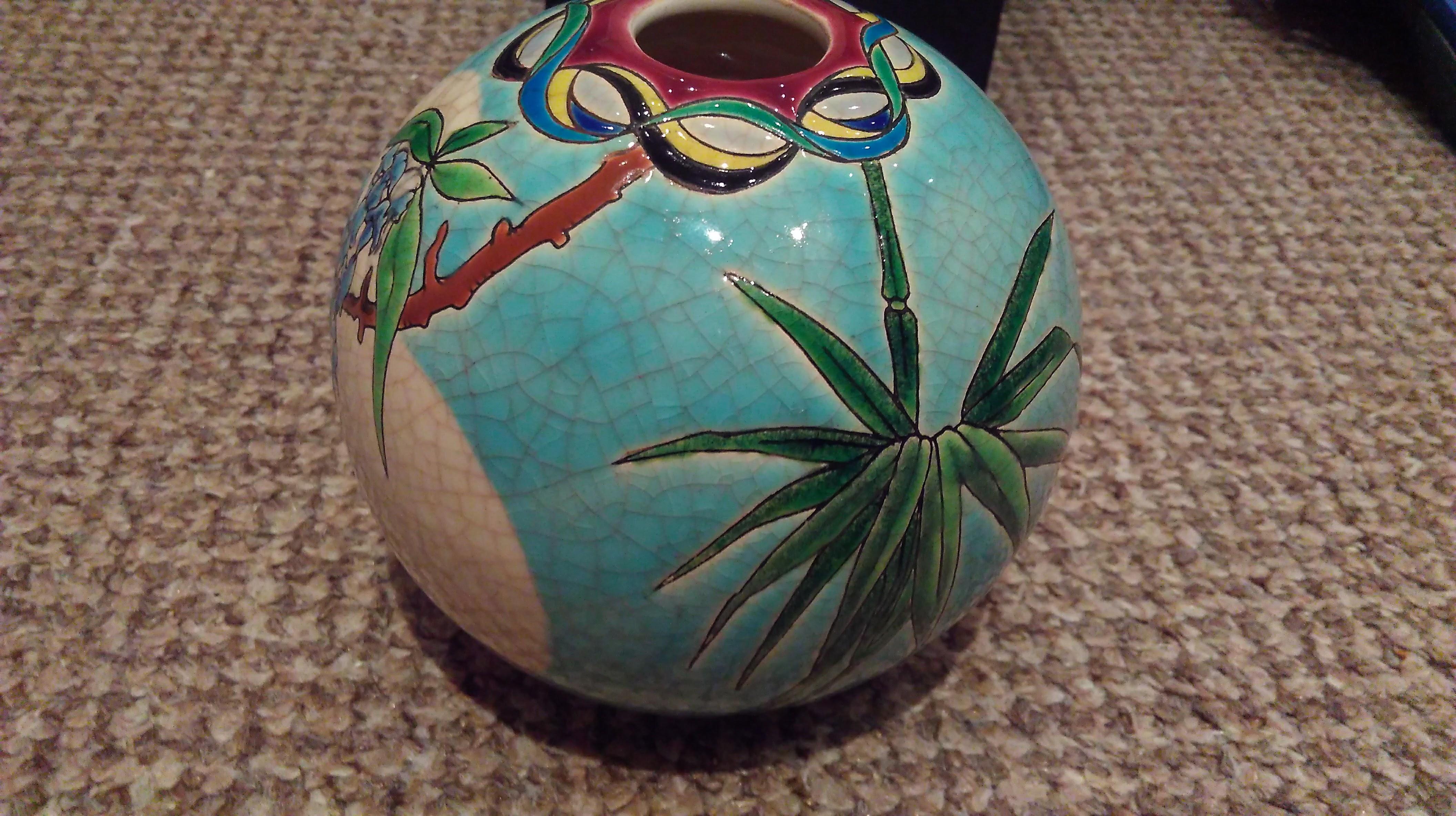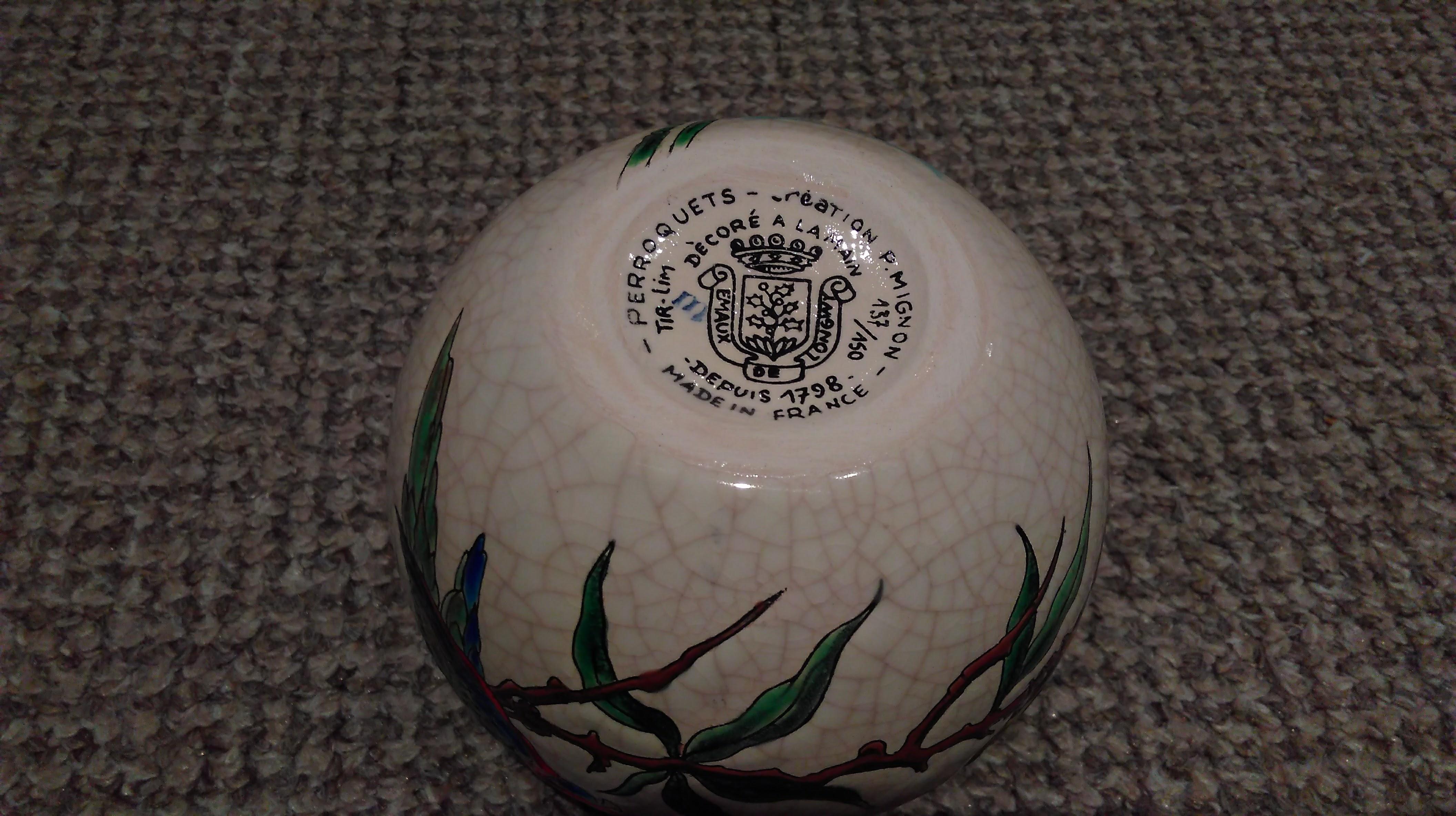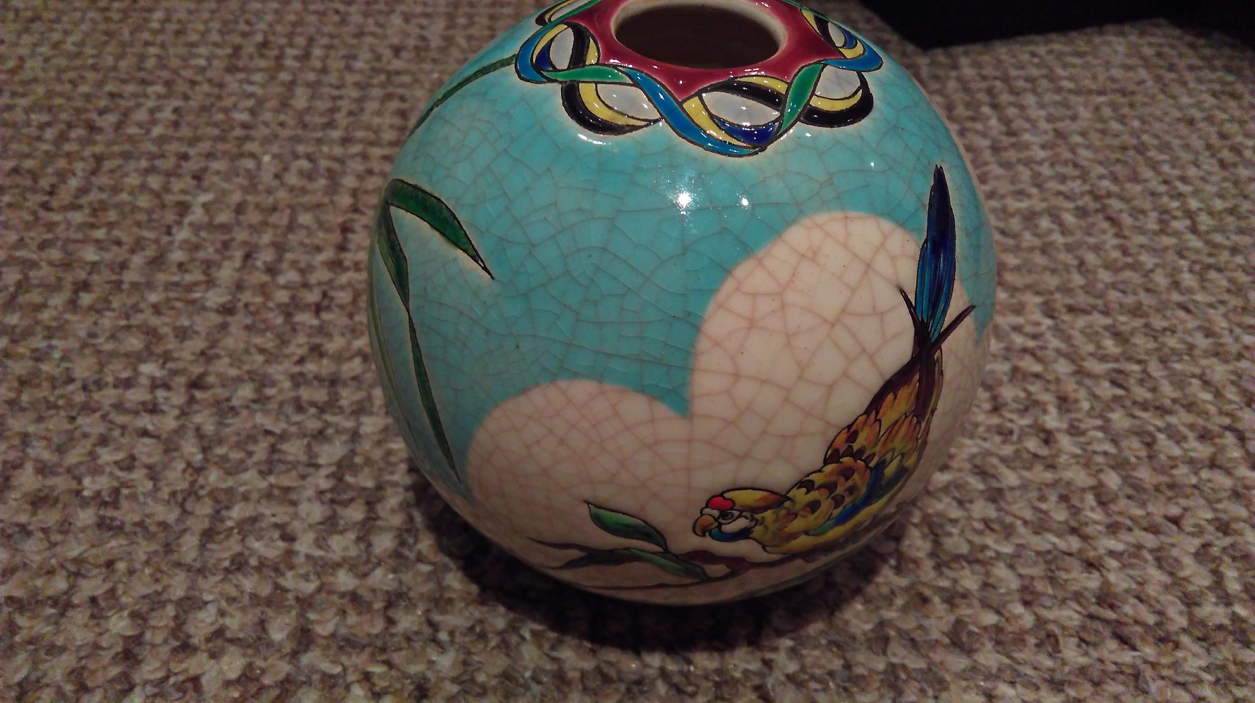 A round vase with Parrots, trees and clouds in the background, has a bit of a cracked pattern all around it, not sure if intentionaly or not. Bought in Metz, France about 20-25 years ago. Has the original box. Authour Paul Mignon. On the bottom says it's 137/150, so I assume there's a whole collection of these items, or 150 of them made in total, not sure. We're just curious if it's something or just a colourful piece.