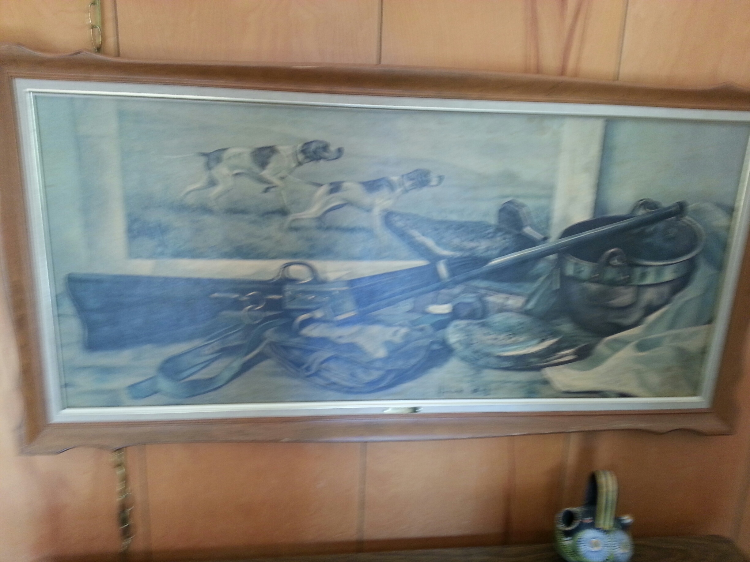 Print is of Hunting rifle and duck decoys with hunting dog portrait in background