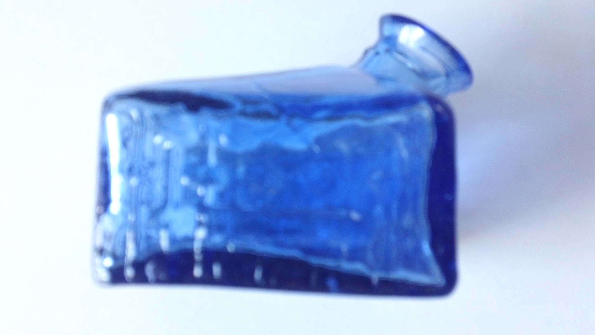 It is unmarked, with no pontil mark. Contains air bubbles and lots of 'erratic' marks and lines in the glass and on the surface of the glass.