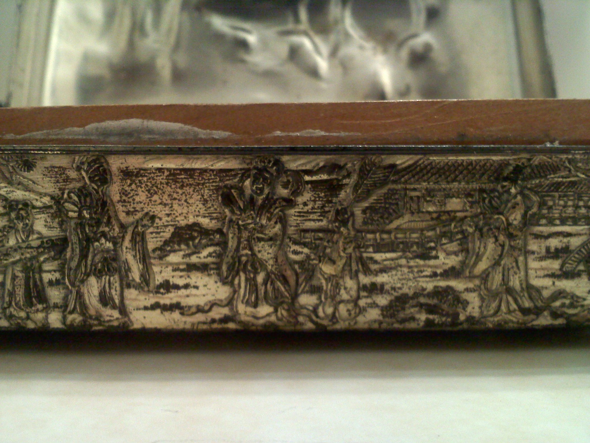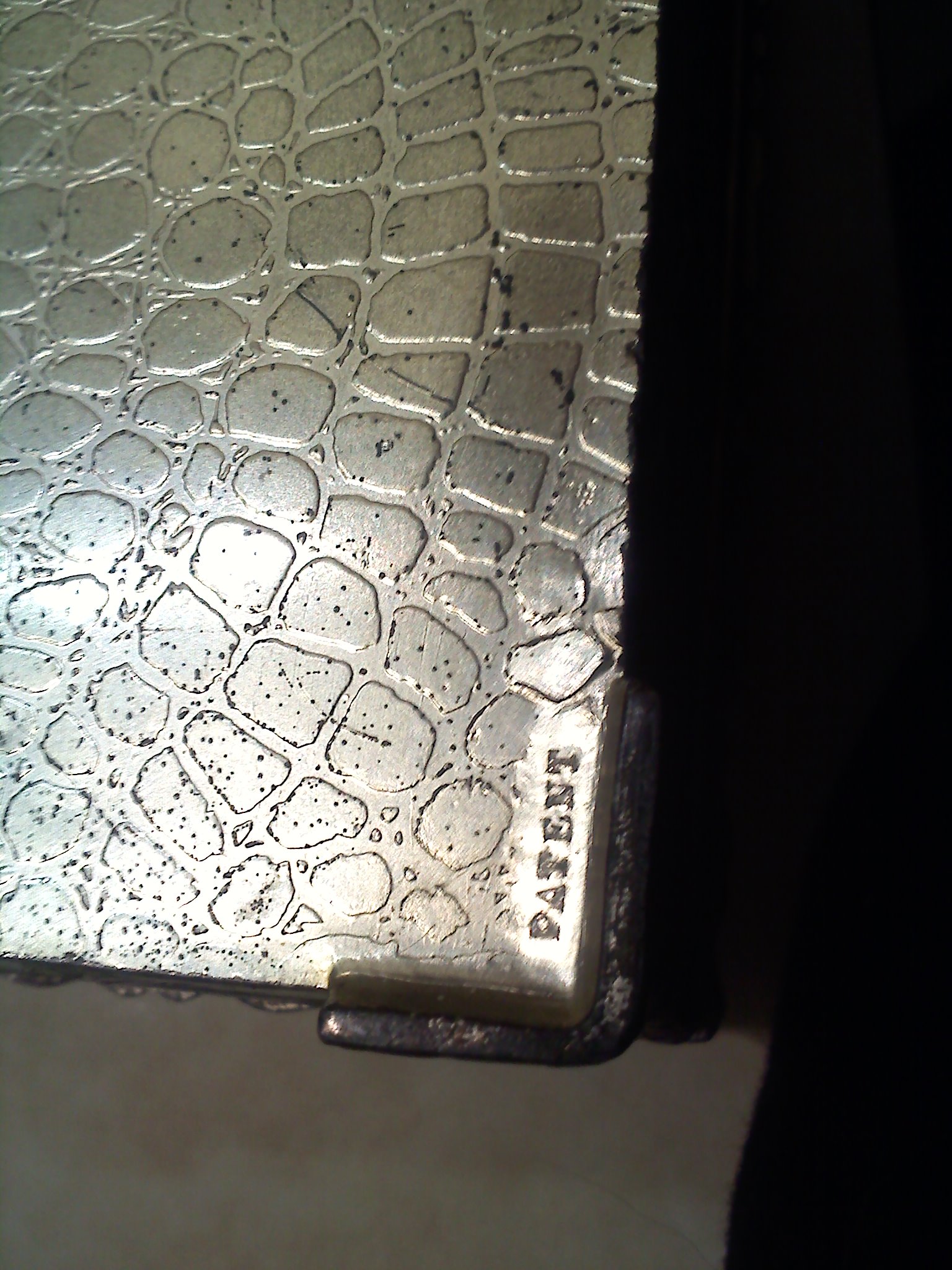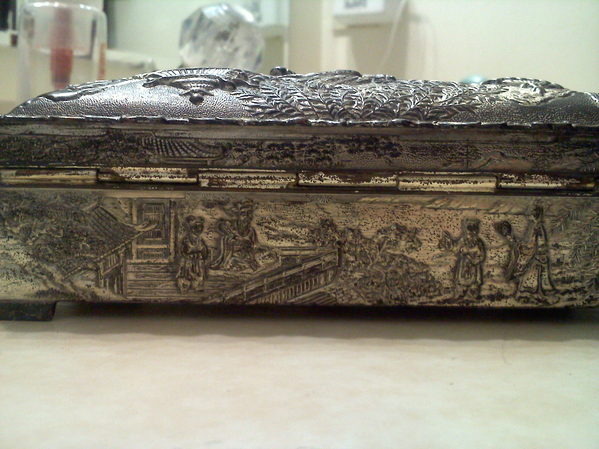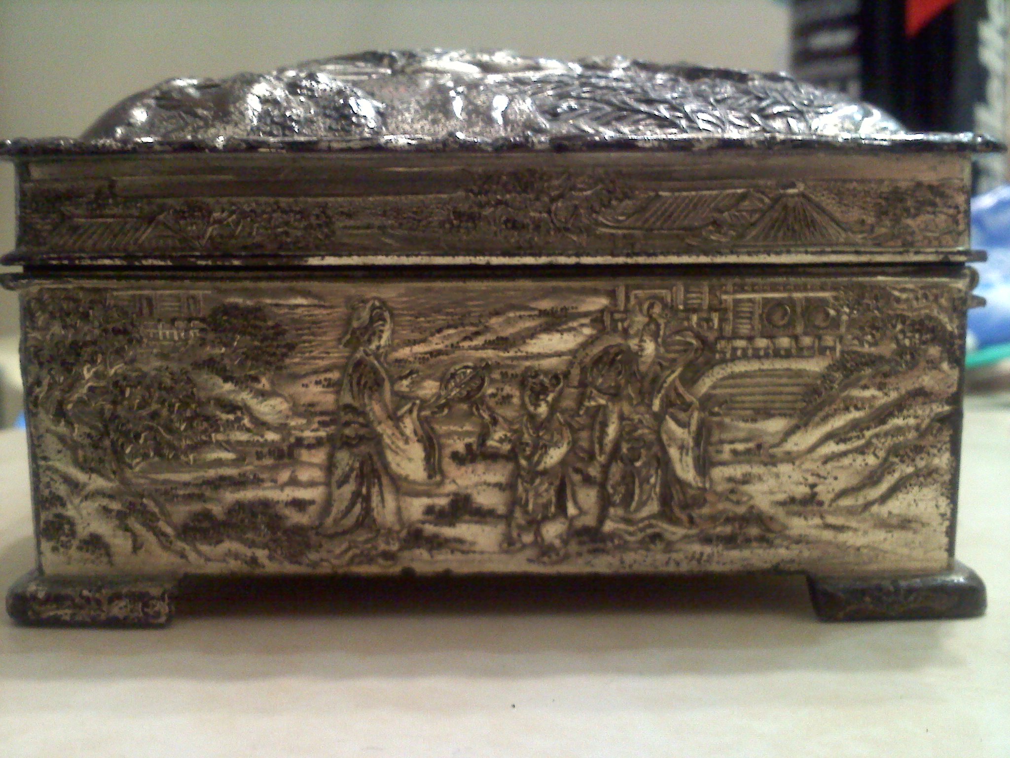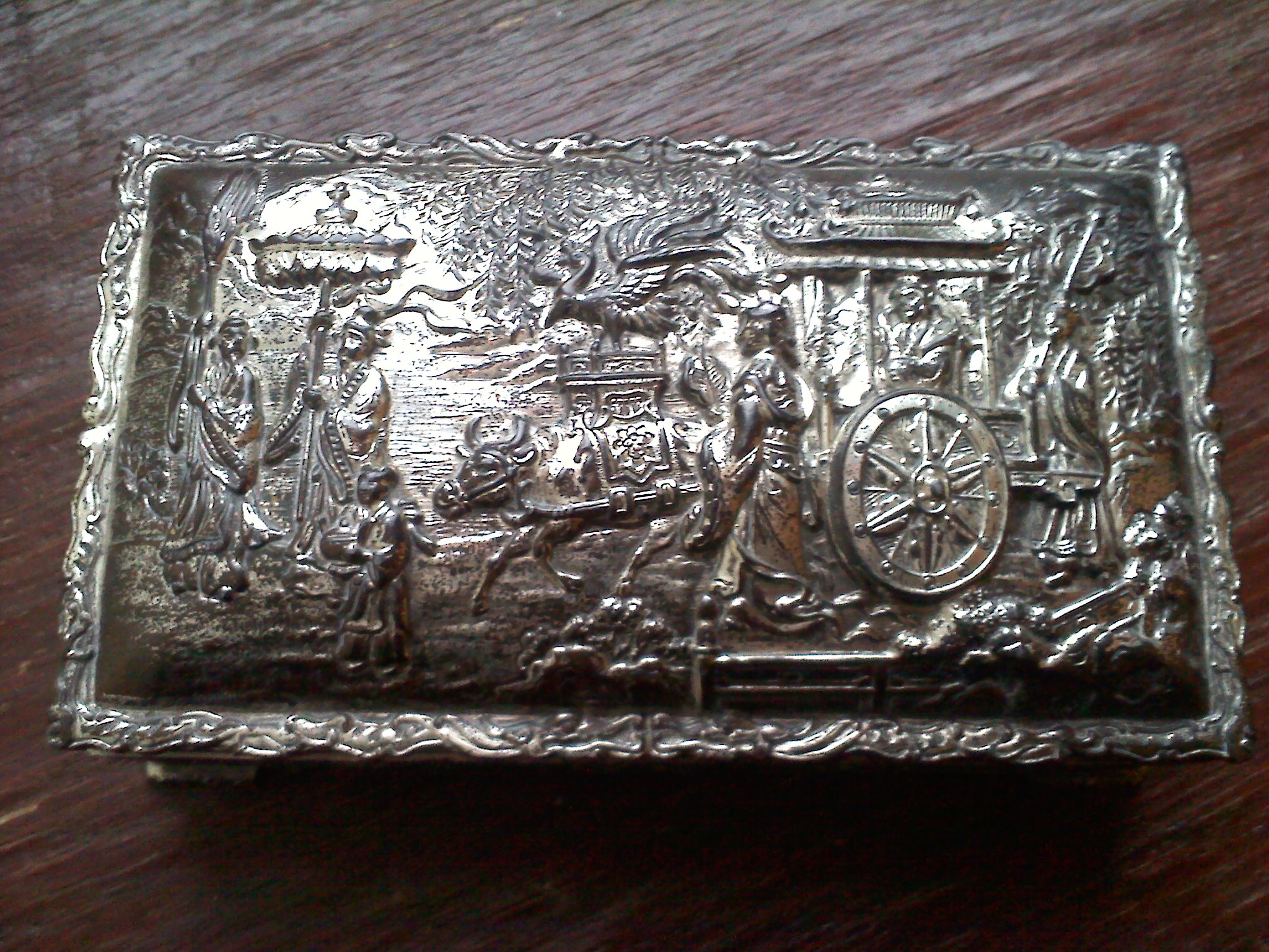 I don't know much about this item, or where it even came from exactly. It looks a bit oxidized, a bit blackened around some areas. The inside is wood, but the inside lid is the same silver as the outside. It has a scene of an oriental carriage being pulled, and other images, possibly of royalty around the sides. It has the word 'Patent' pressed on the bottom. It also has somewhat of a scaley texture on the bottom, along the lines of snake skin, also in the silver metal.