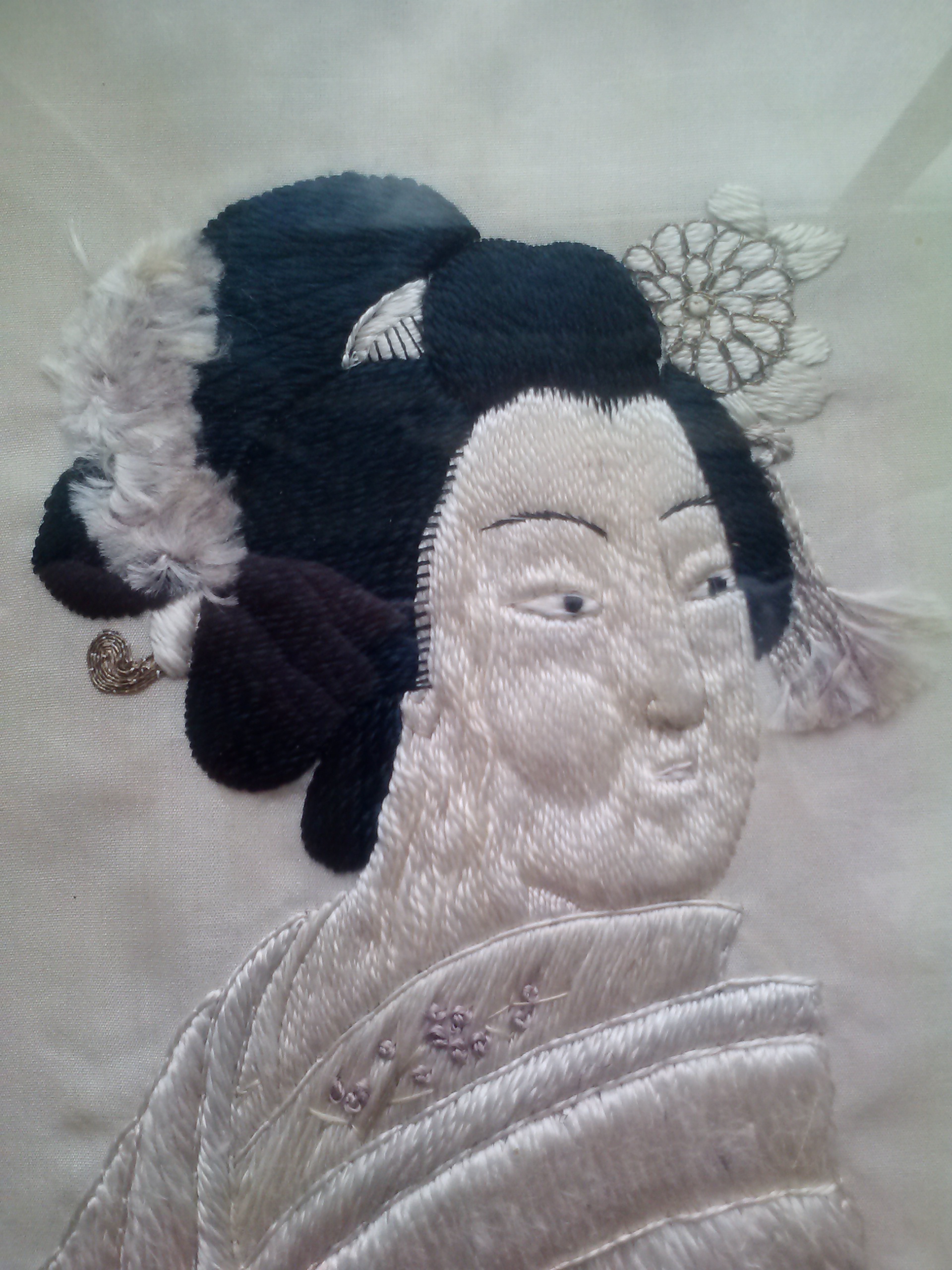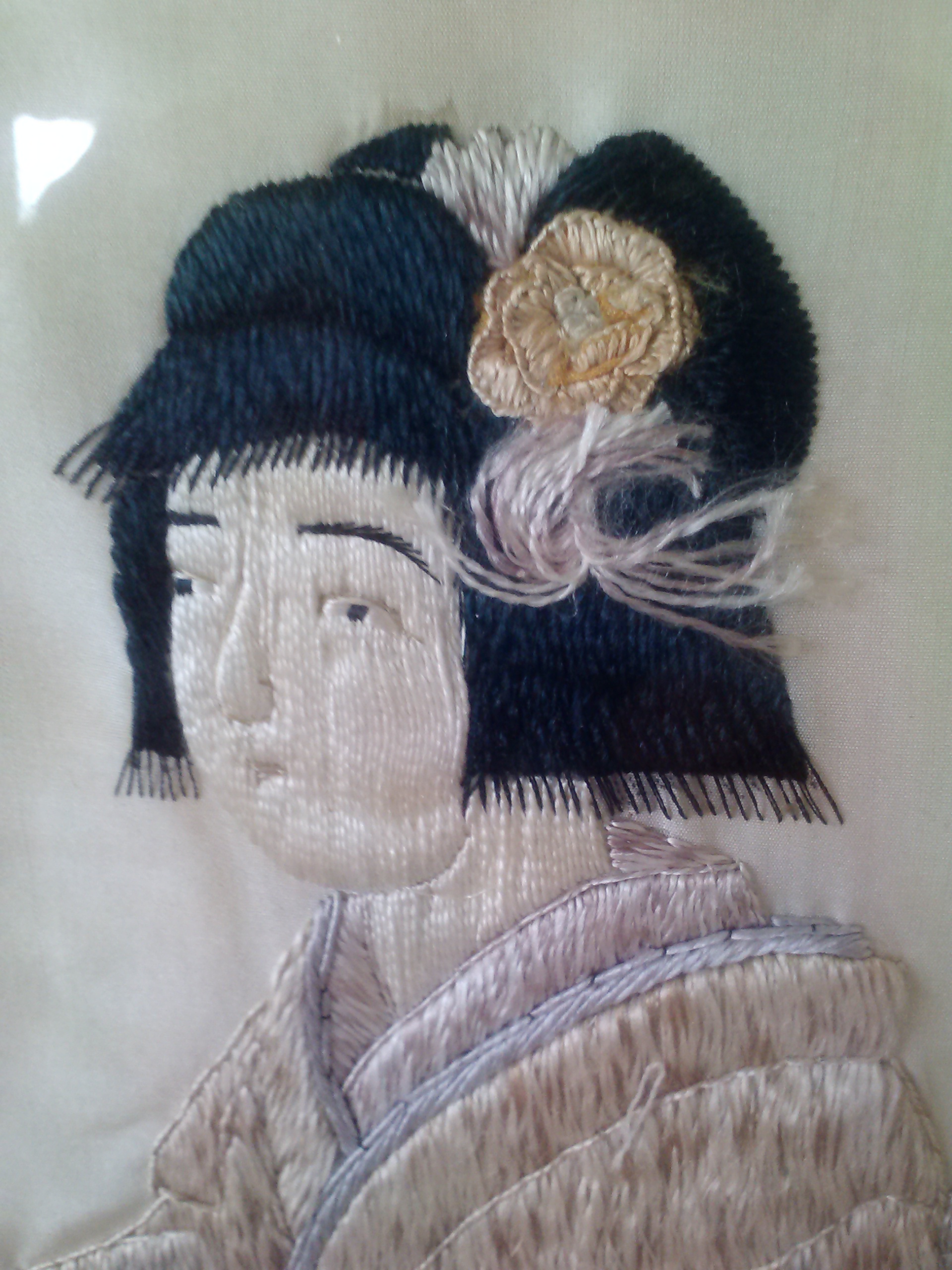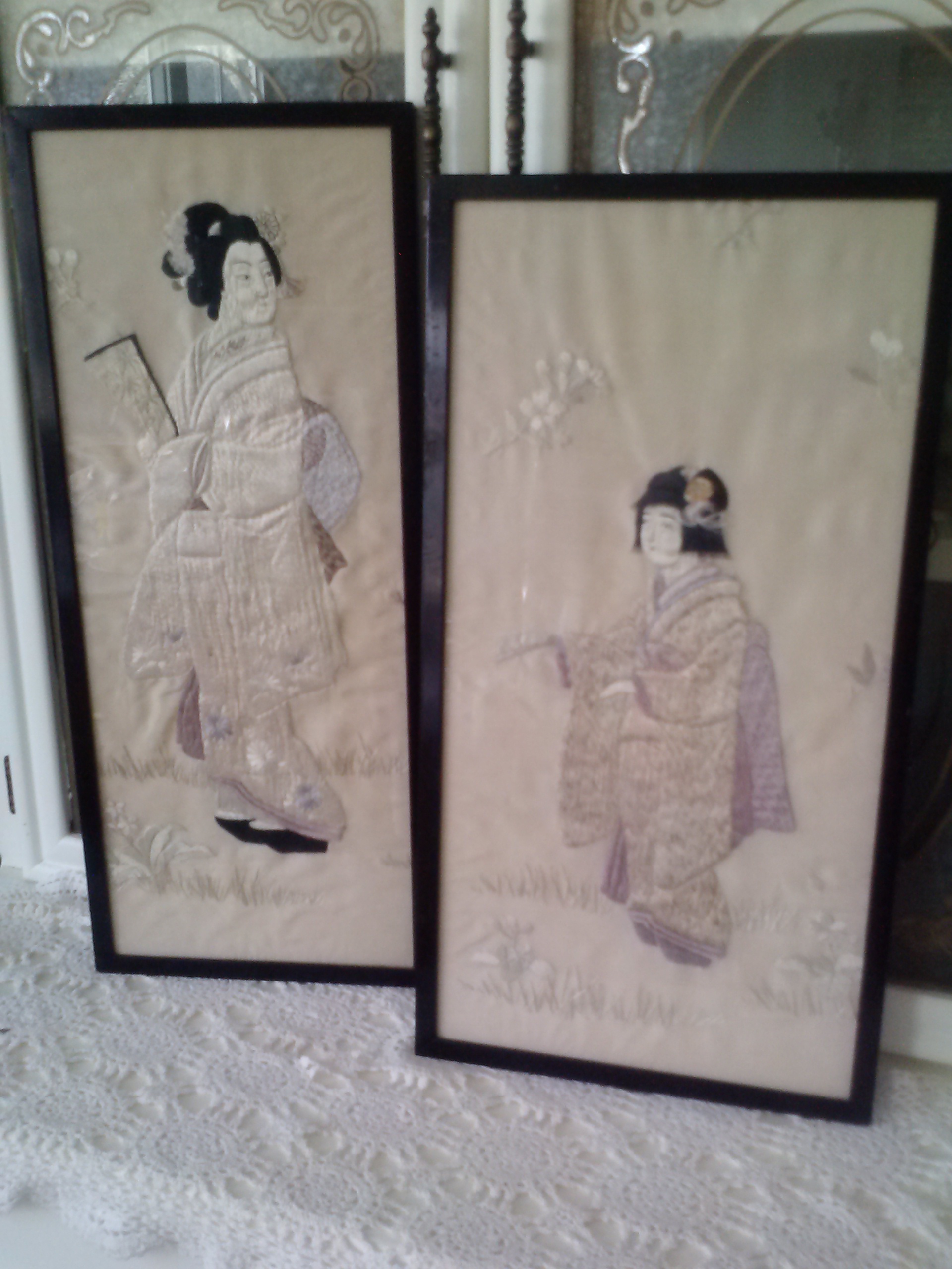 These appear to be embroidered on silk and are framed in black wood frames. The name on the sticker on the back is Francis Hendricks Art Dealer. This company was based in Syracuse, NY late 1800's to early 1900's. I think they must have been framed during that time period. There are no stains on the fabric and the stitching is very even. Hard to believe it could have been done by hand.