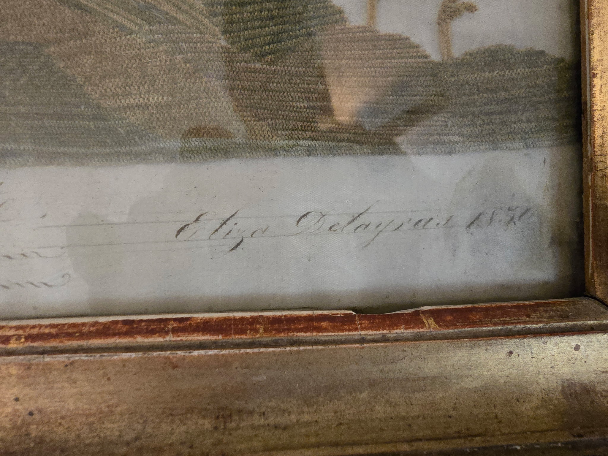 The work is signed and dated “Eliza Delayaras 1850” in fine script in the lower right corner. It is mounted in a period gilt wood frame with signs of age and patina consistent with the artwork’s vintage.
