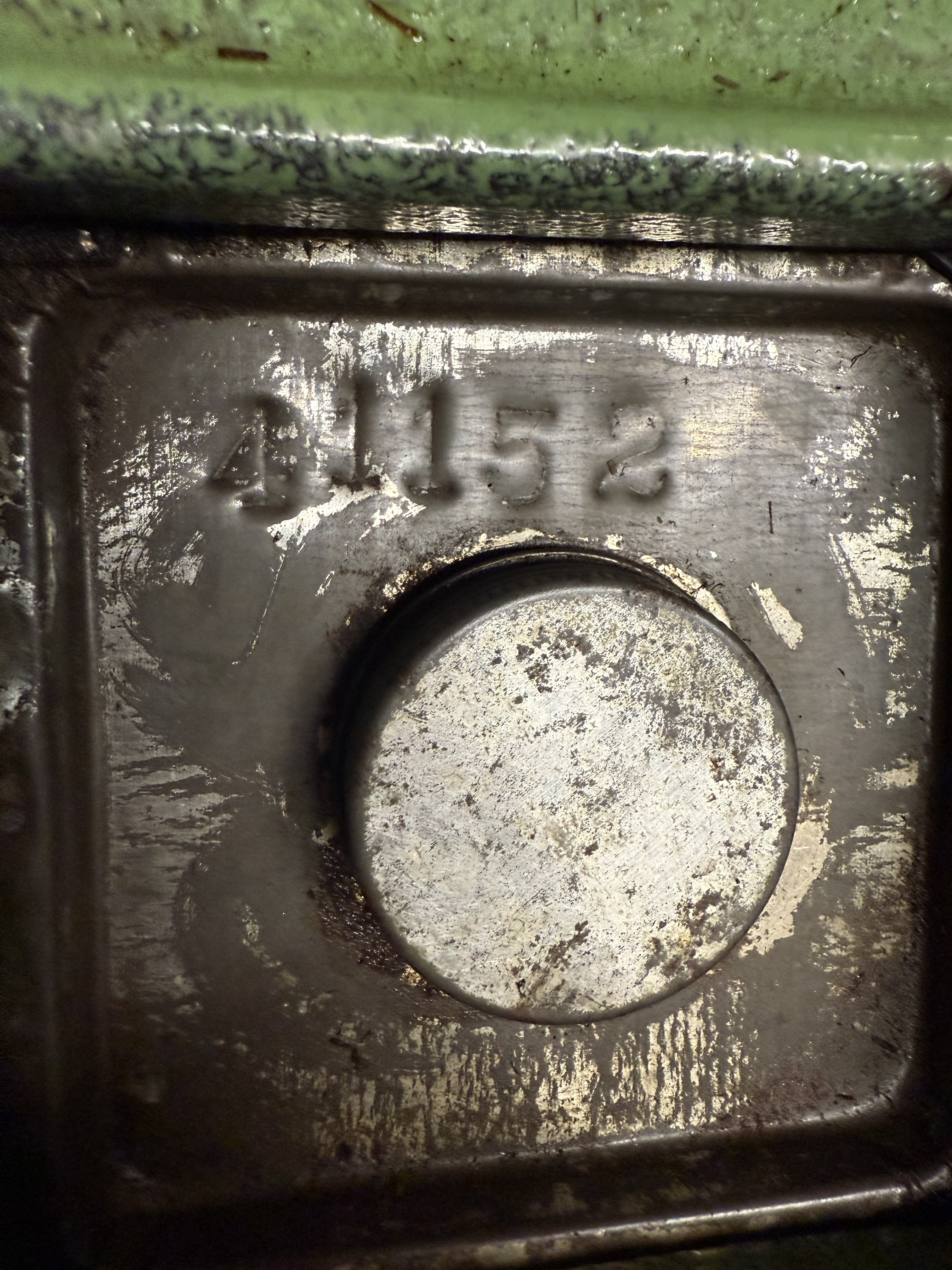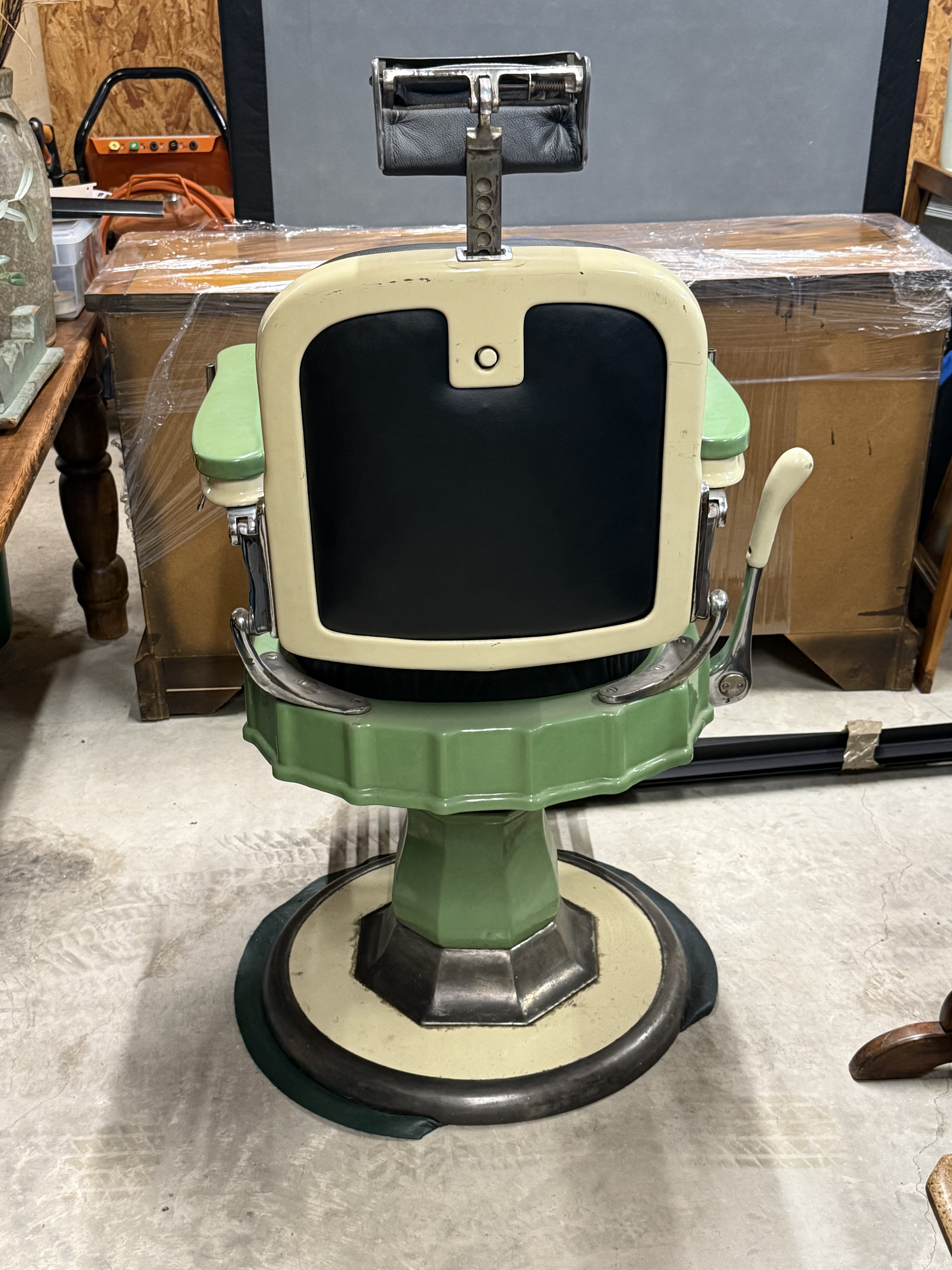 This Emil Paidar barber chair features a robust construction utilizing porcelain, steel, and leather. The chair is fully operational with an adjustable headrest and a stamped number under the seat (4 1152). The black leather upholstery appears to be original, while the chair's base is painted in green and cream colors, showcasing the classic design of the era. The dimensions are full-sized, though specific measurements are not provided. The chair is notably heavy, indicative of its sturdy build.