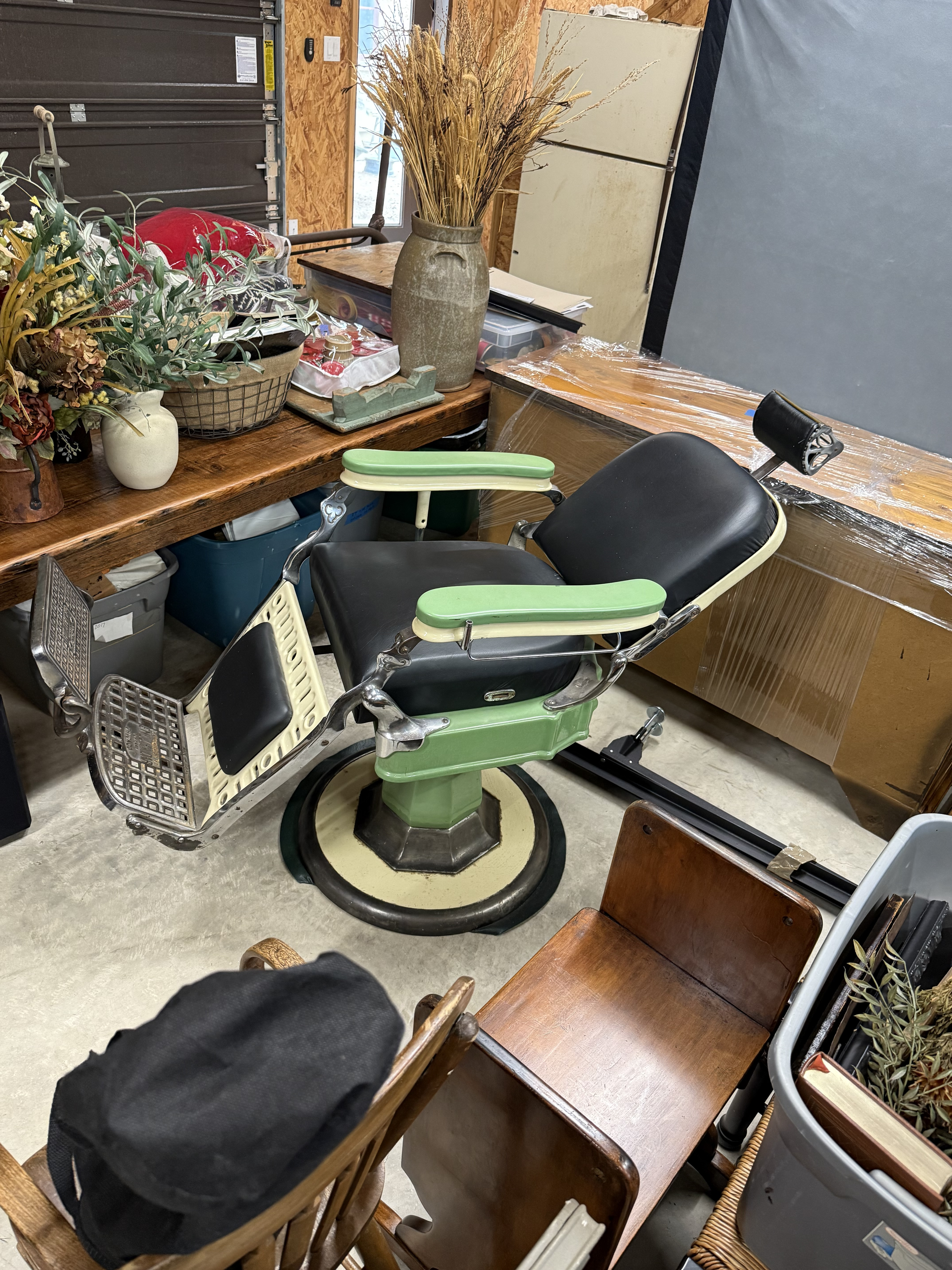 Emil Paidar barber chair, fully operational. Adjustable headrest. Stamp number under seat 4 1152. All hydraulics work. Black leather appears original.