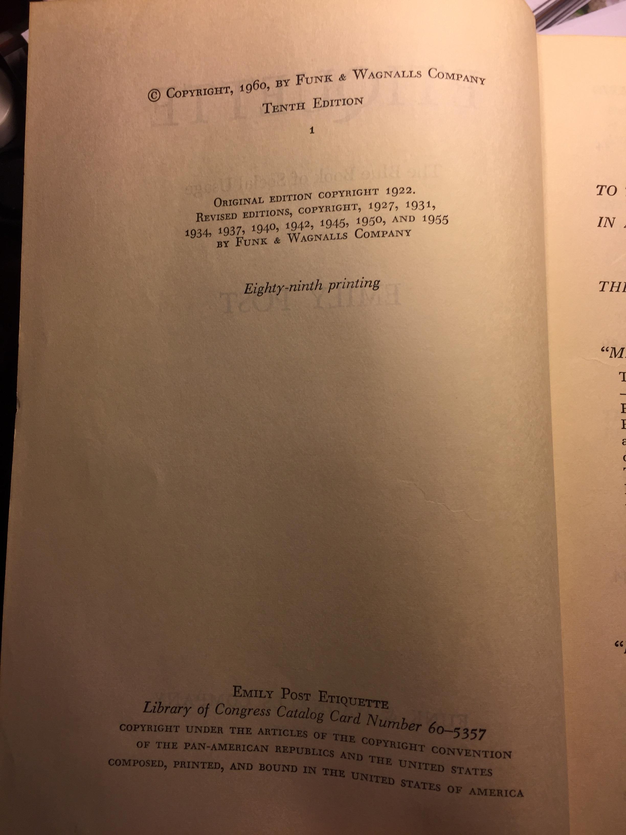 Re: Emily Post's Etiquette copyright 1960
