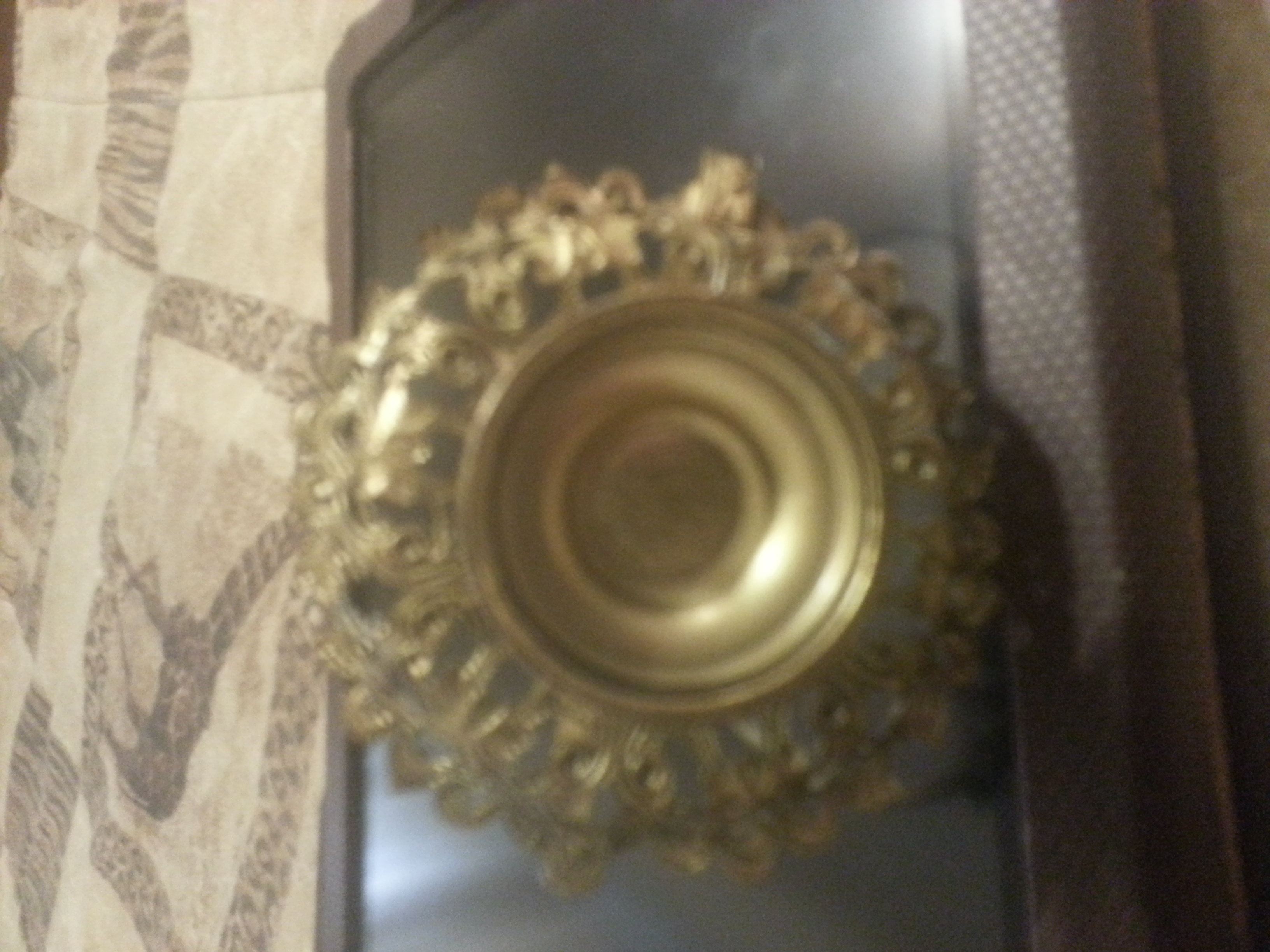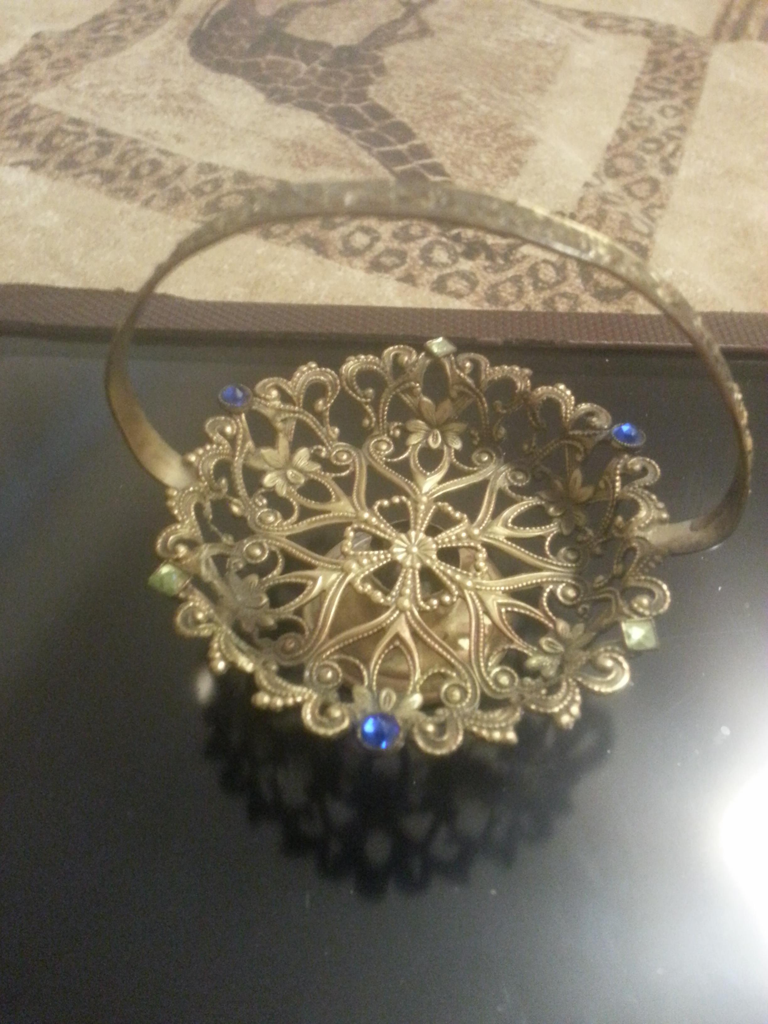 Description Filigree basket with blue and light green jewels on basket rim. It stands approximately 5 inches tall. Handle is detailed. Bought it at a garage sale for 10 cents.