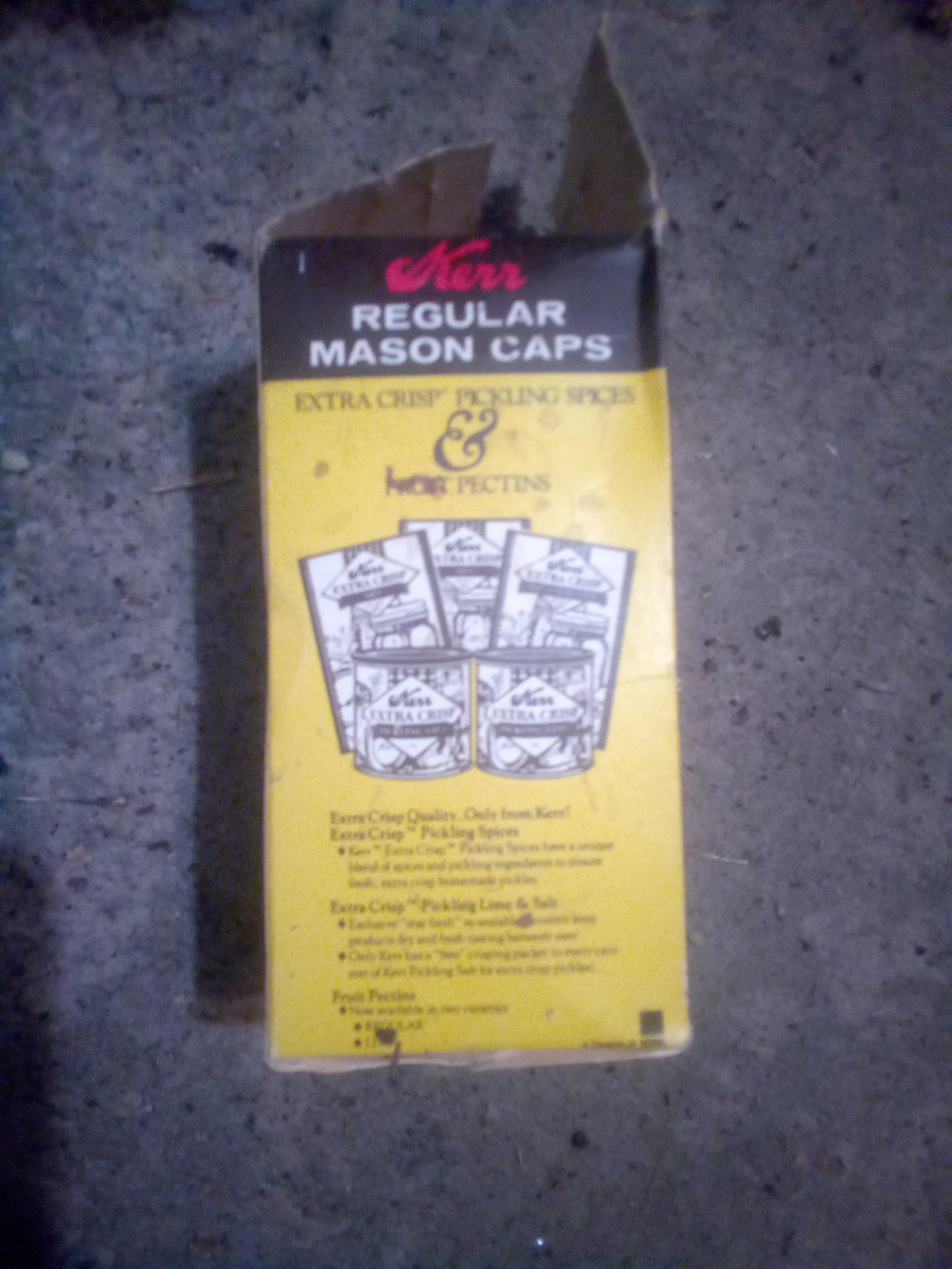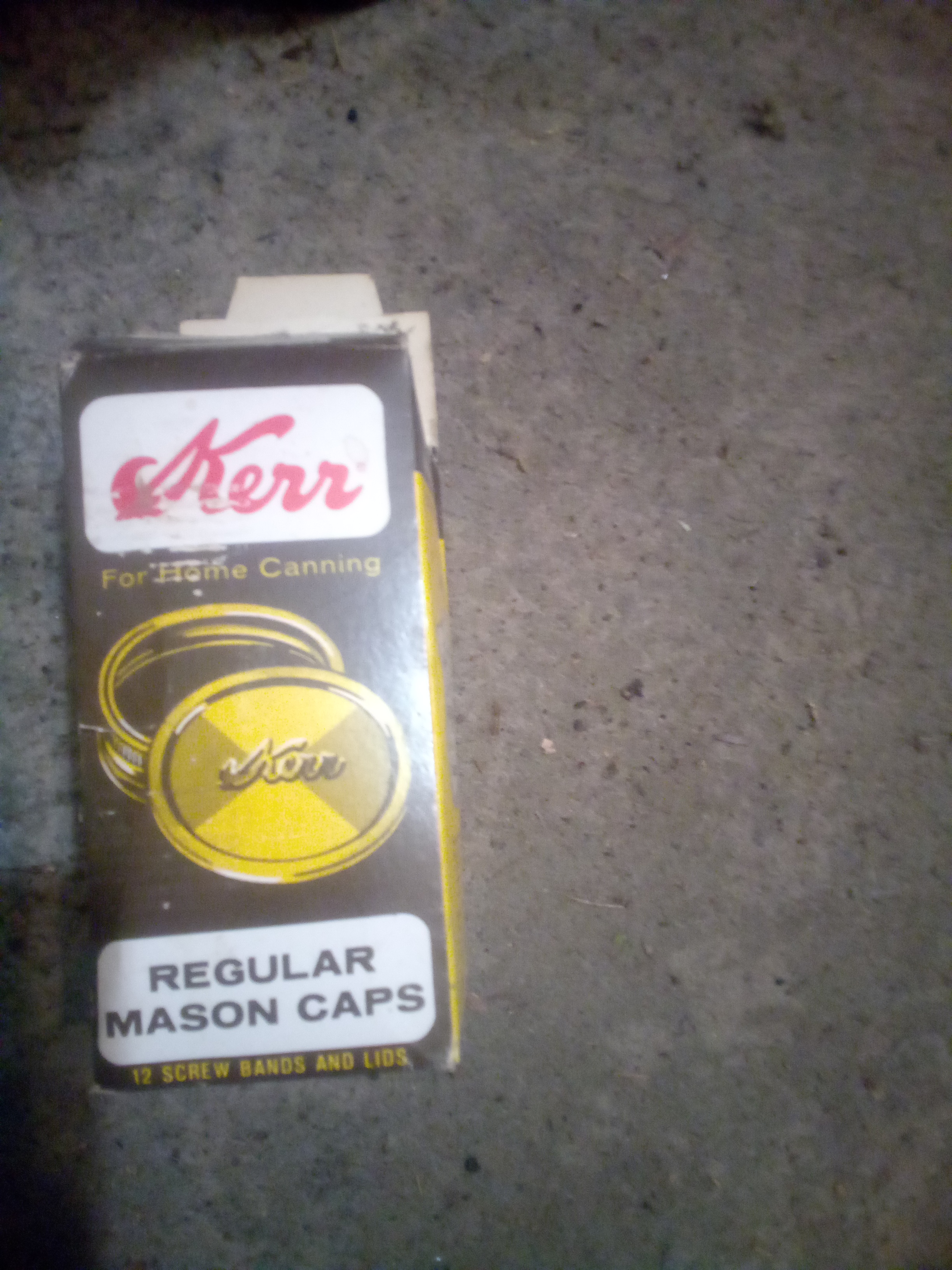 Physical Description: This is an empty Kerr box designed for home canning. The box is made of paper and measures approximately 4 inches tall and 2 inches wide. The front features the Kerr logo in red with the text "For Home Canning" and includes details about the contents (12 screw bands and lids). The box is predominantly yellow and black, characteristic of the packaging style from the 1970s to 1980s. No distinguishing marks were noted.