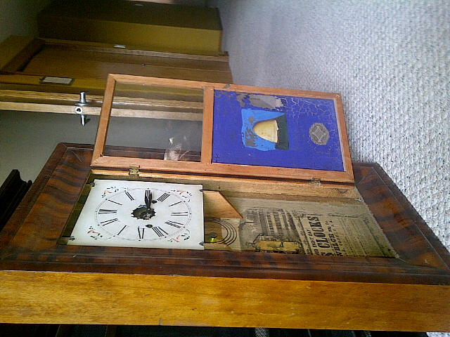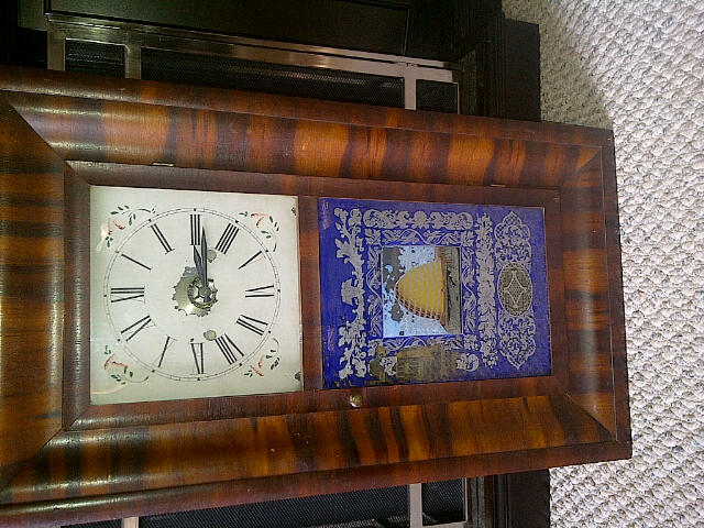 Well, this was originally what's called an "OG" clock, after the type of molding used in its construction. They are in the American Empire style, most like this post date 1830 and were made into the 1850's. Sadly this one no longer has it's original works and is now a decorator piece rather than an antique, value , about $150.00.