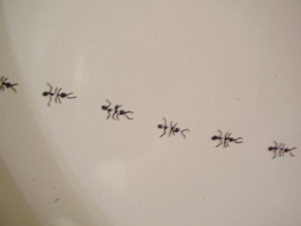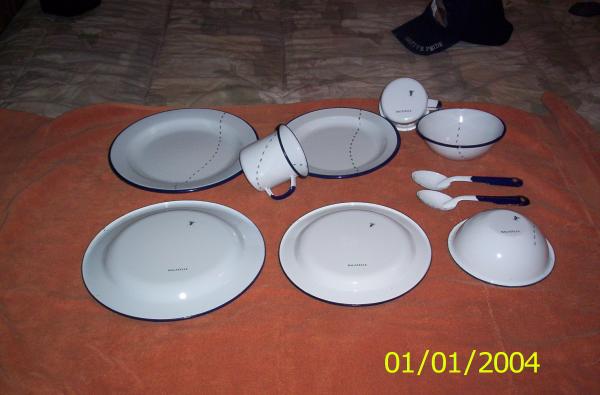23 dinner plates, 27 salad plates, 27 bowls, 27 coffee cups, 27 large spoons all are white with cobalt blue trim. The design is a line of ants crossing the top of each piece and the bottom has the word BAGATELLE with a fly up and right of the center.