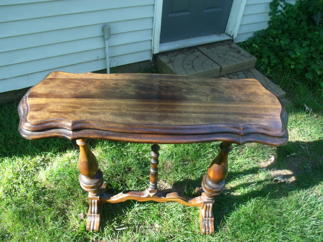 This table was in a house purchased in 1947 ffrom a woman who lived there for the previous 30 years. We judge the piece to have been made in the 20s or 30s, or possibly earlier. After the style of the time, the rich mahogany was painted over black. We had the item stripped to reveal the rich grain pattern.