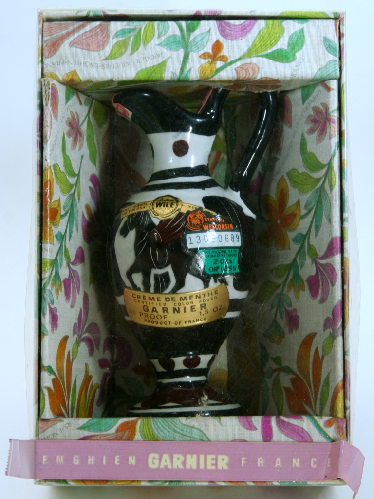 On the front of the vase thingy is a Julius Wile sticker and a State of Wisconsin tax sticker...the other sticker says"creme de menthe - certified color added - granier - 60 proof 1.5oz - product of France"