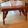 It is a very nice solid wood table, maybe Mahogany or walnut not sure, we believe it is an antique replica. Possibly Cabriole legs ornate with ball and claw feet, carvings of (acanthus?)leaves and flowers. The chairs are padded (removable)and have a tan flowered material on them. may be Chippendale style. the top of the table comes unscrewed from the base.