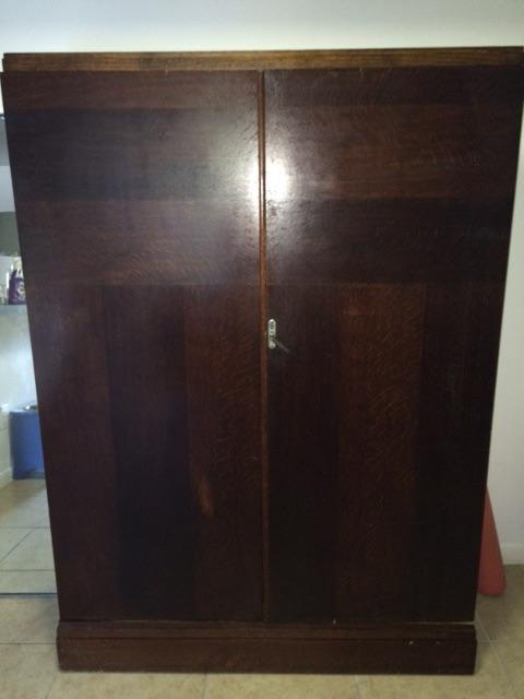 Old English gentle men's wardrobe. I am not sure when but it has label on inside with patent information.  All parts are labeled inside ie opera hats, dress vests, handk & gloves, collars, requisites...dimensions are 68" H, 48" W, 20" D.