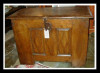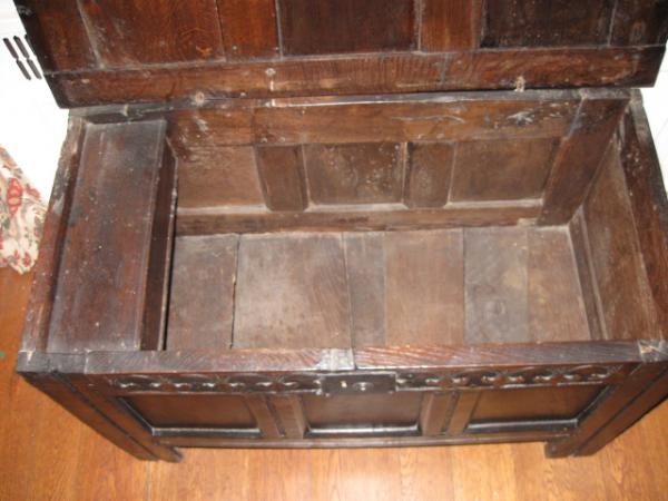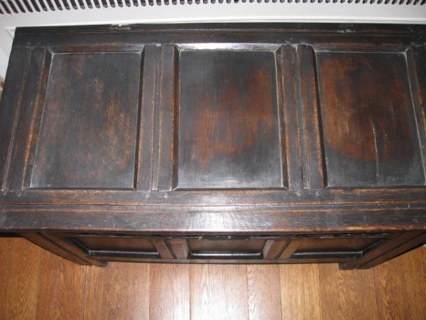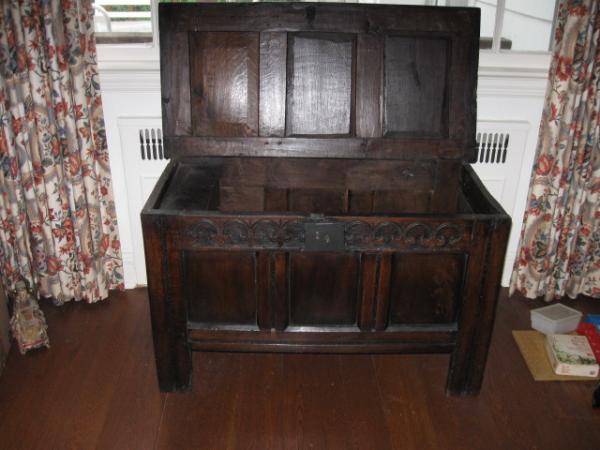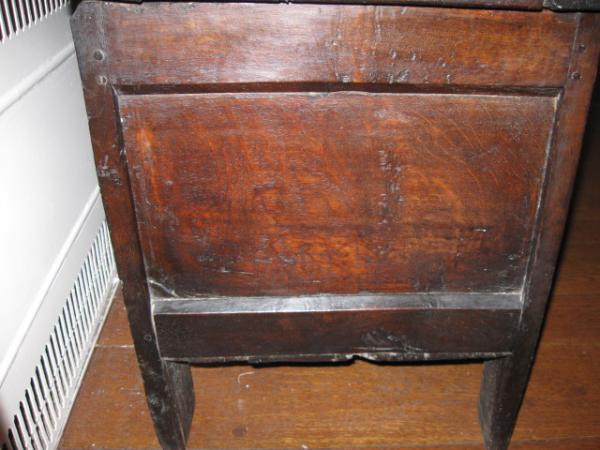 Small English oak coffer, c. 1680. Chip-carved three-panel front and three-panel lid with molded lip. Large staple hinges. Candle box inside. Old lock, may or may not be original.