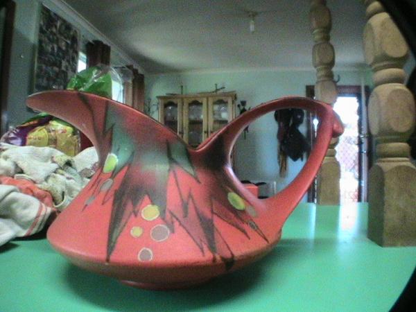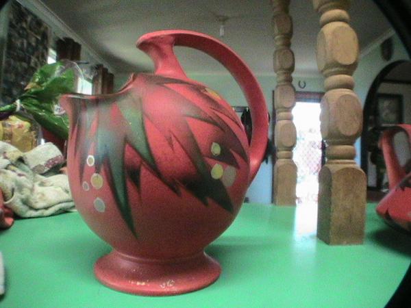 Brillant reddish orange,geometrical patterns and all marks on the bottom(see pics)Their unusual names Alladin and Scuttle jug. They are obviously a pair and made by the same potter.Hand painted.