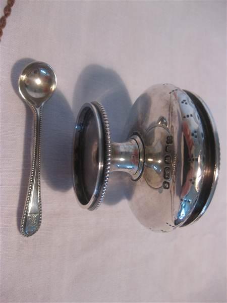 Silver salt cellar from Sheffield I think. Seller said it was made in 1864. There is a tiny matching spoon with the same marks. The cellar feels quite solid. I paid 95 $ and would like to know if I paid to much for the item. There is no scratches and minimal wear.