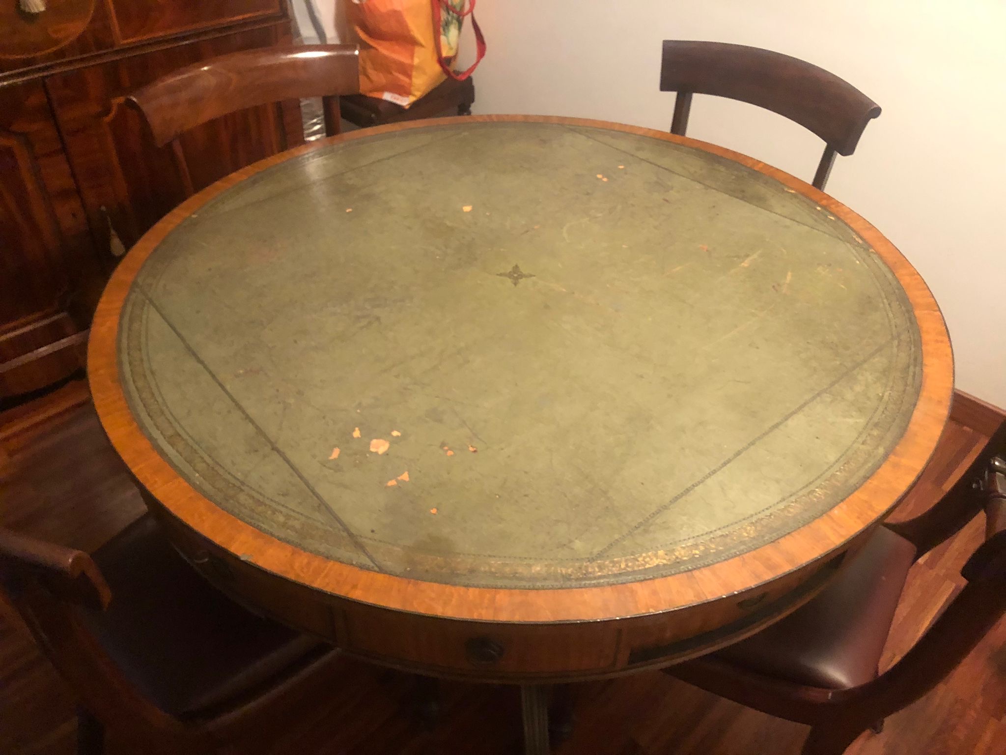 Condition Notes: The table shows significant wear on the leather surface, with scratches and some peeling. The wood has minor scratches but is structurally sound. The chairs are in good condition, with some wear on the upholstery. Overall, the condition affects the value, as restoration could enhance its appeal.