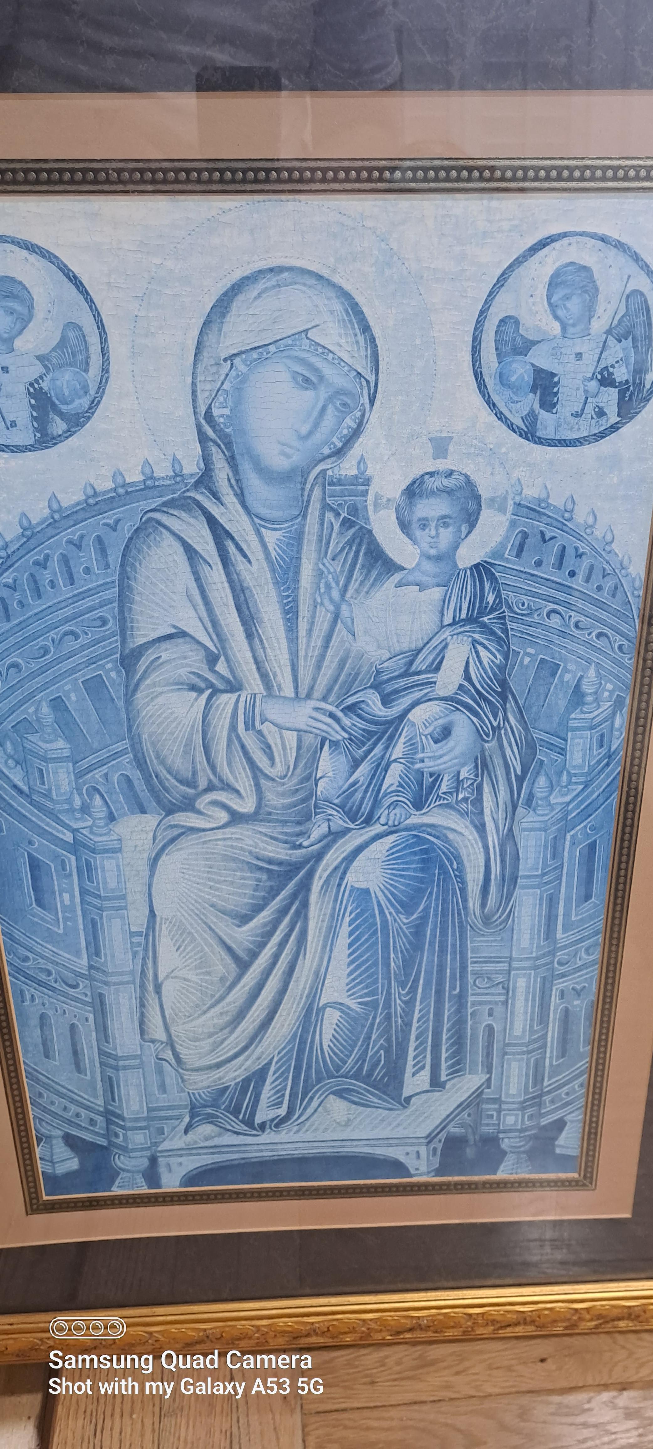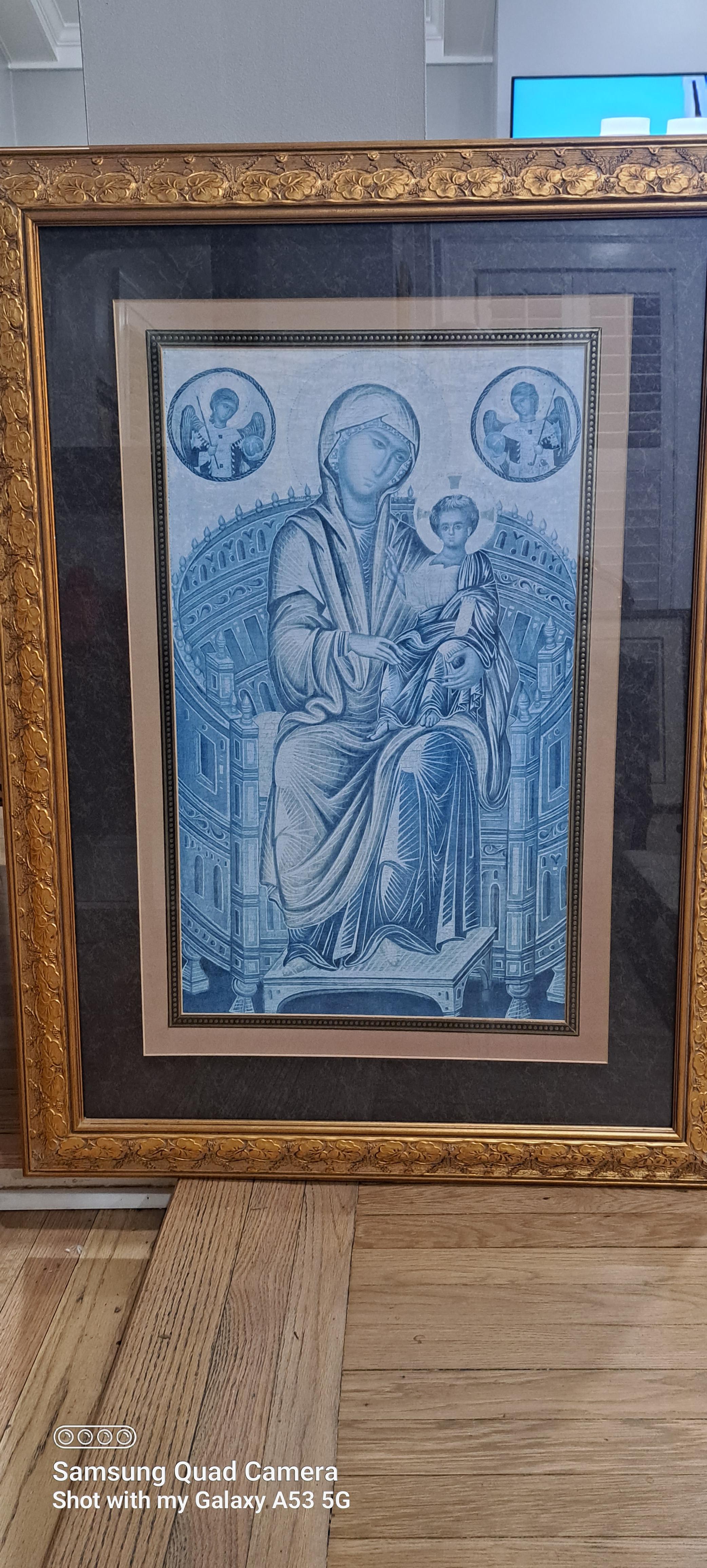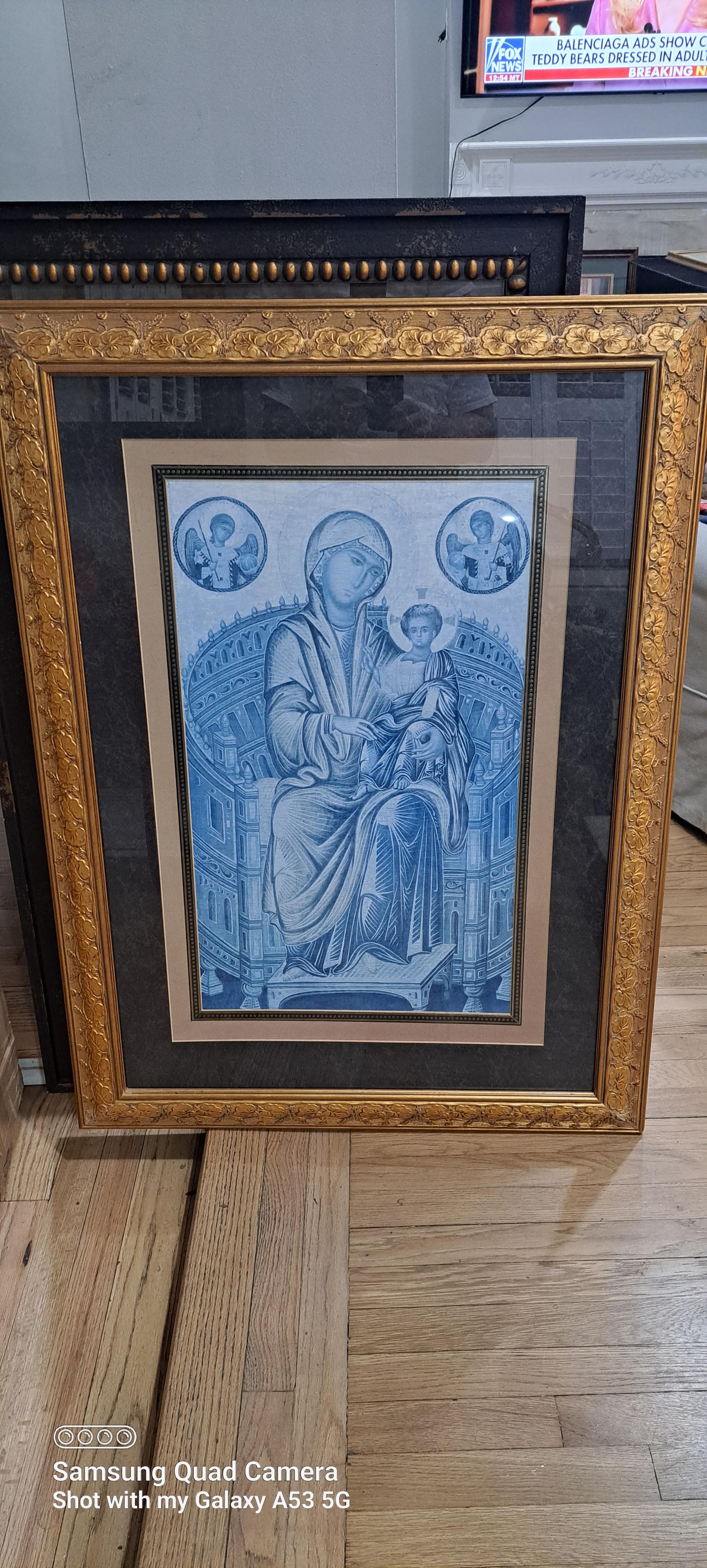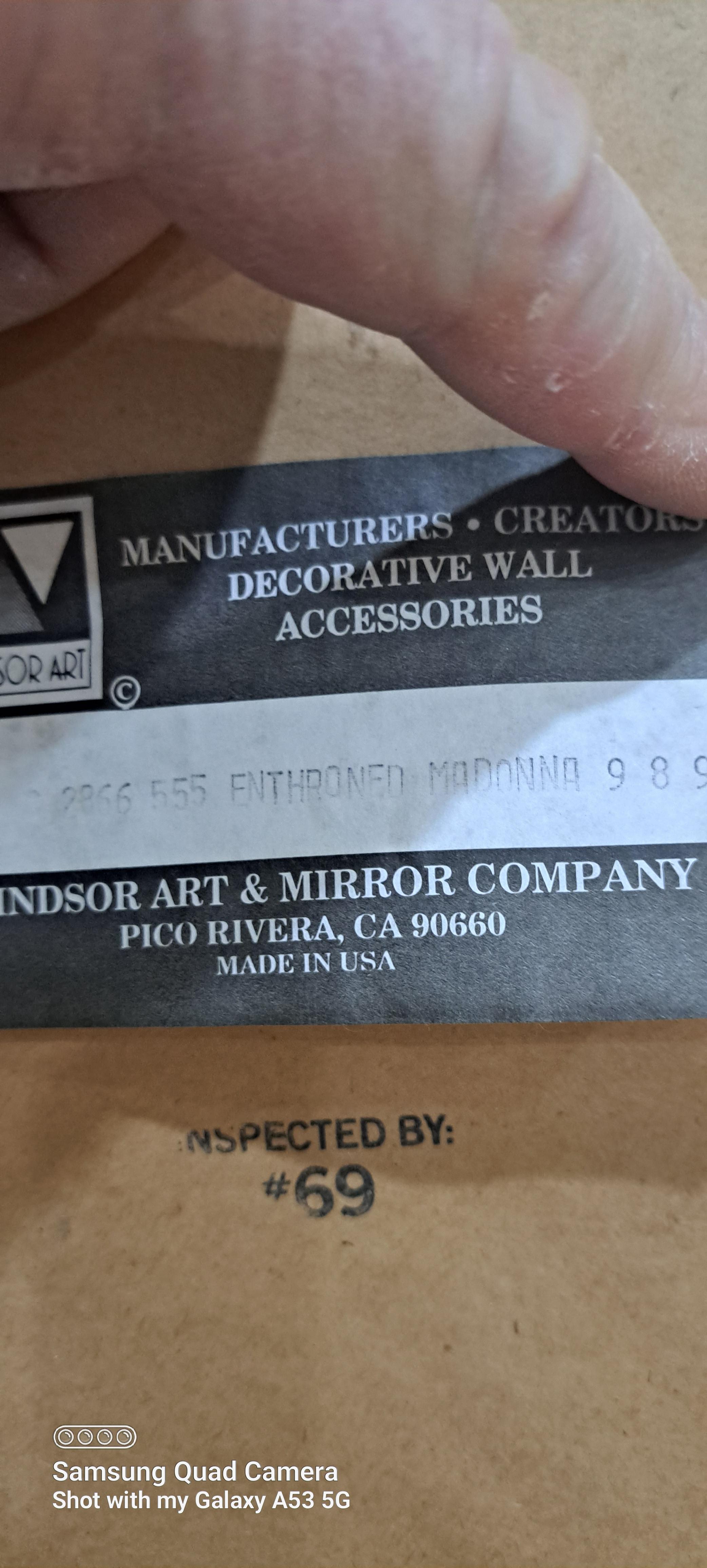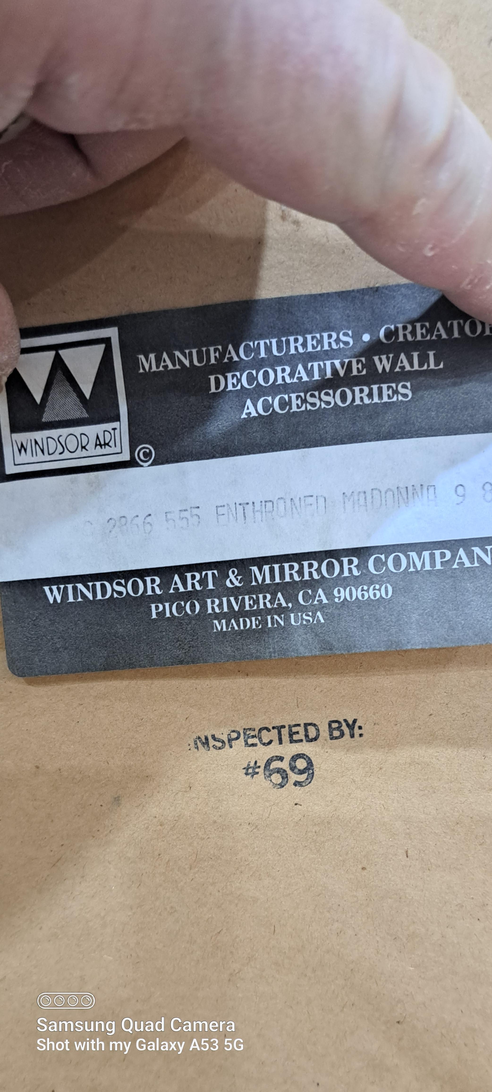This item came from the Windsor Art & Mirror Company and says on the back of the beautifully framed piece of art it says, "2866 555 ENTHRONED MADONNA 9 8 95" which I believe are numbers that can be used to look up the value or at least what it sold for at one time.