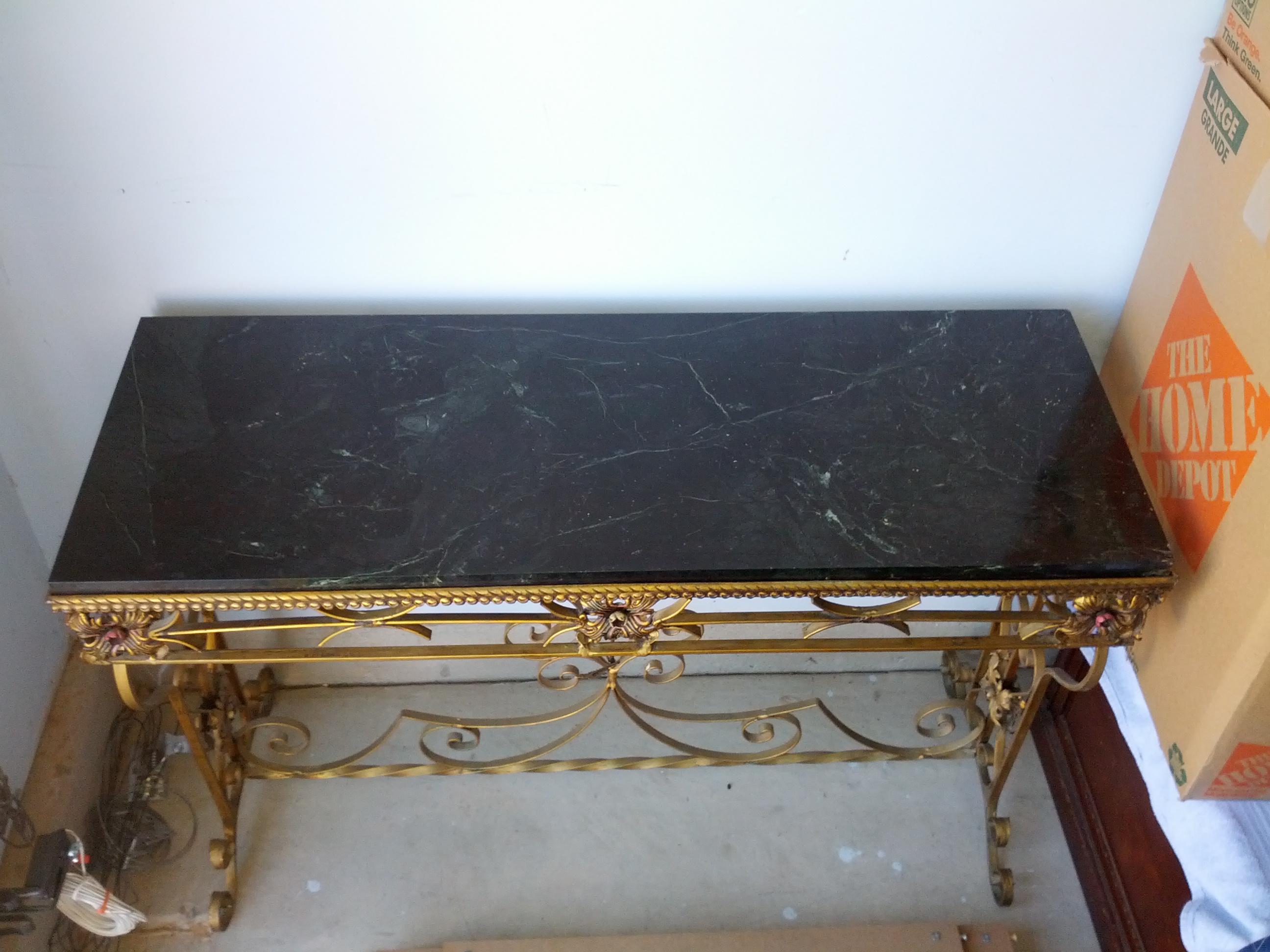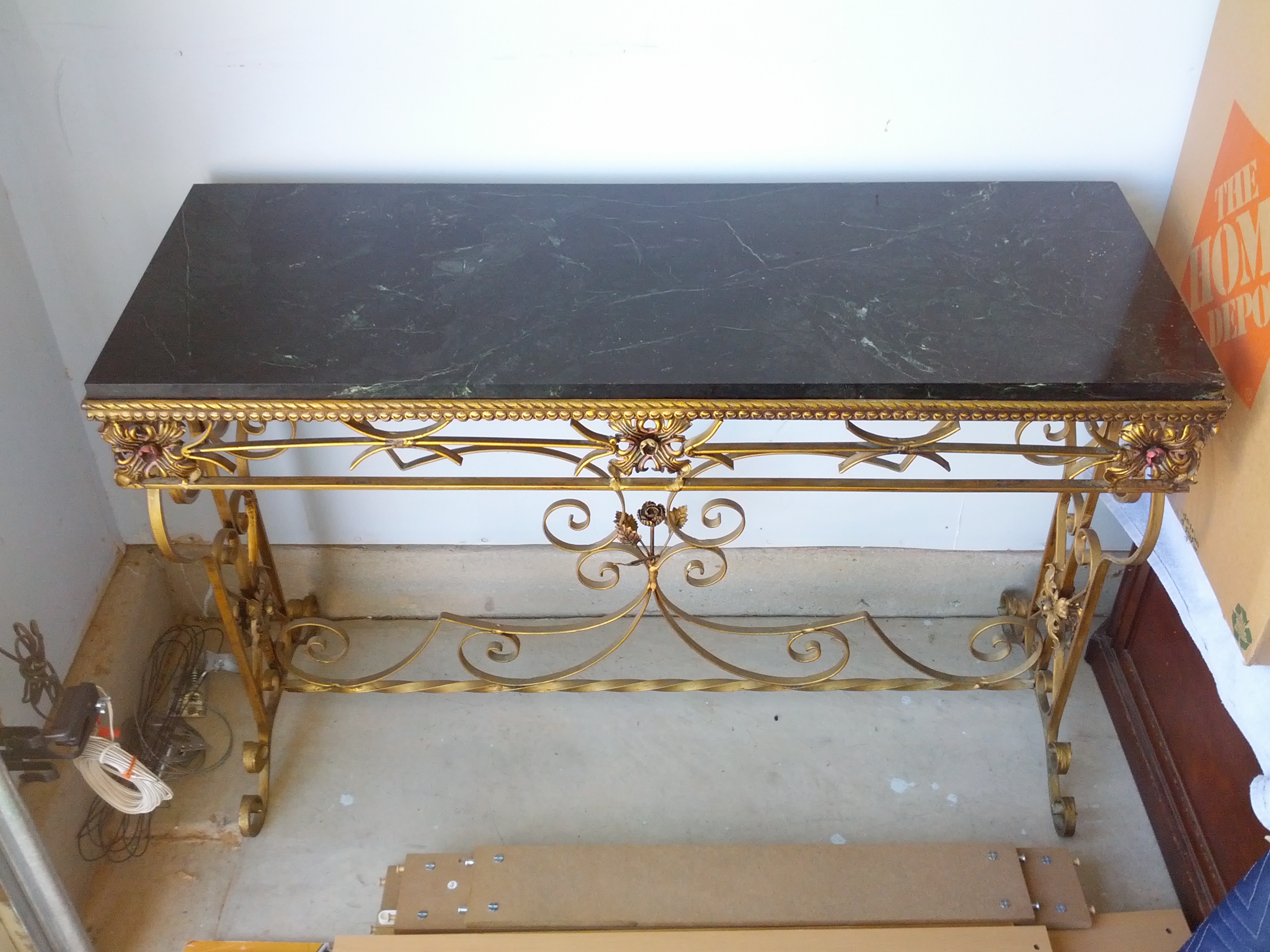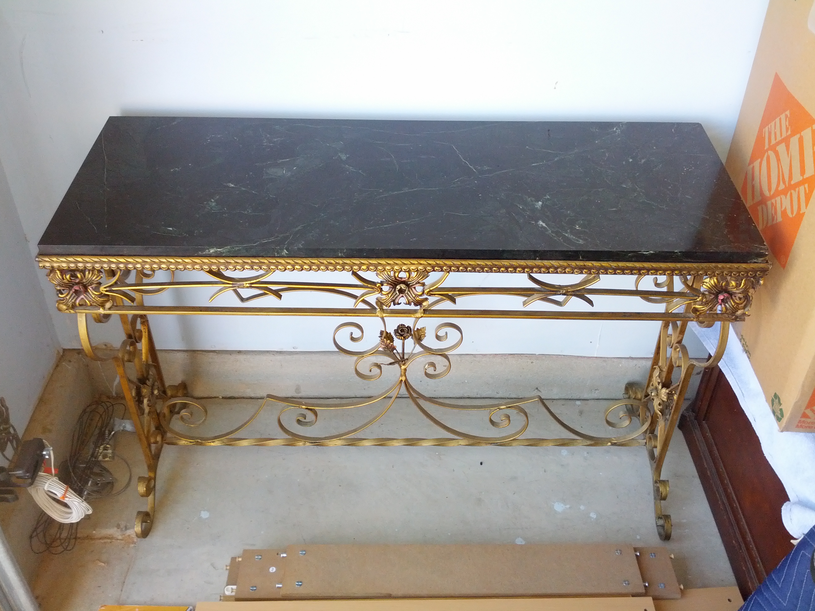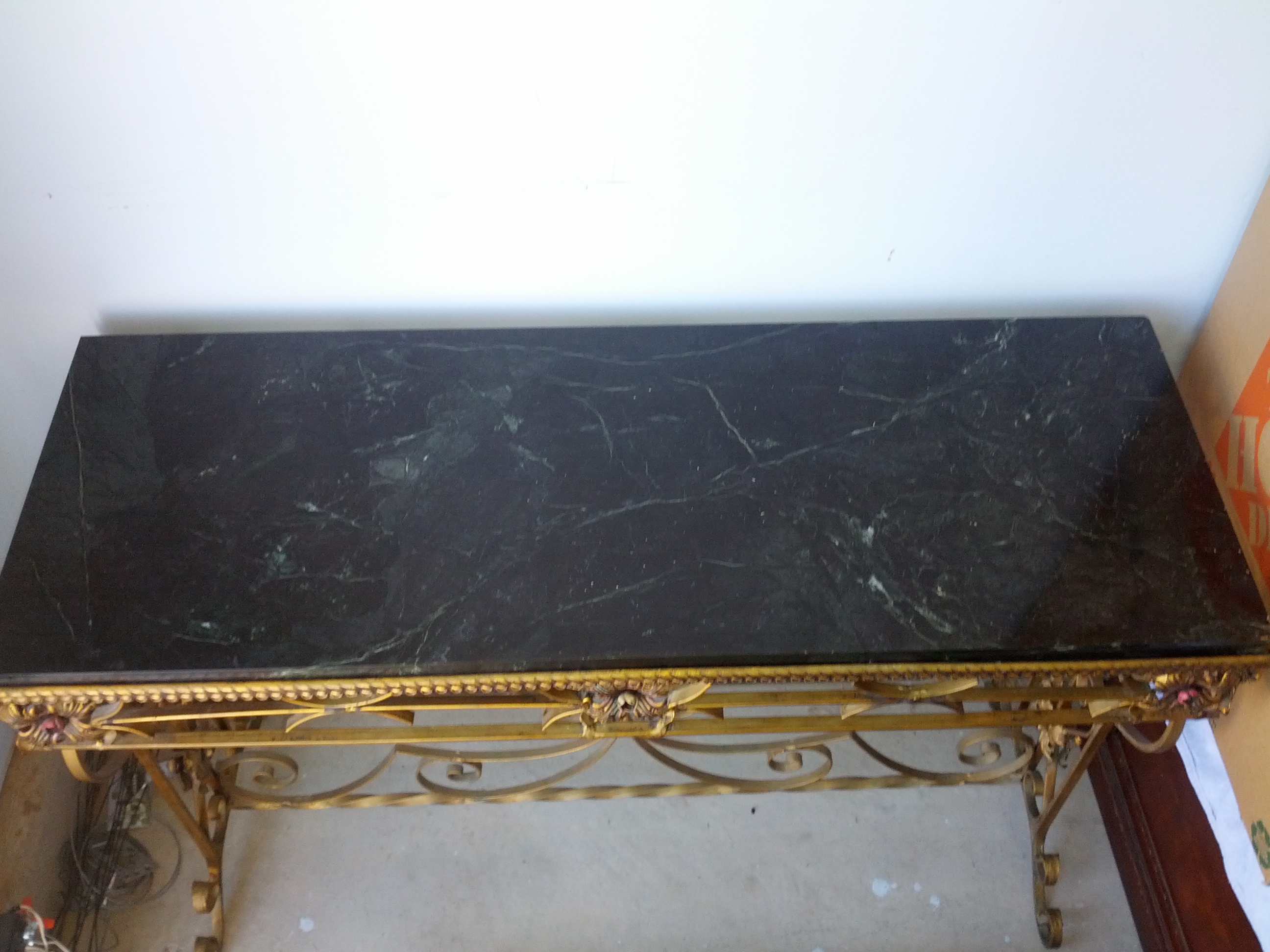 I have a rectangular shape table. The top of the table is a solid piece of marble. Black and white/gray in color. The base is wrought iorn with leaf detail. It was purchased in the 50's to 60's from a hotel in Chicago that was closing. I do not have any further information on the table. I am wondering if it is an antique or not, and how much value it would have if any.