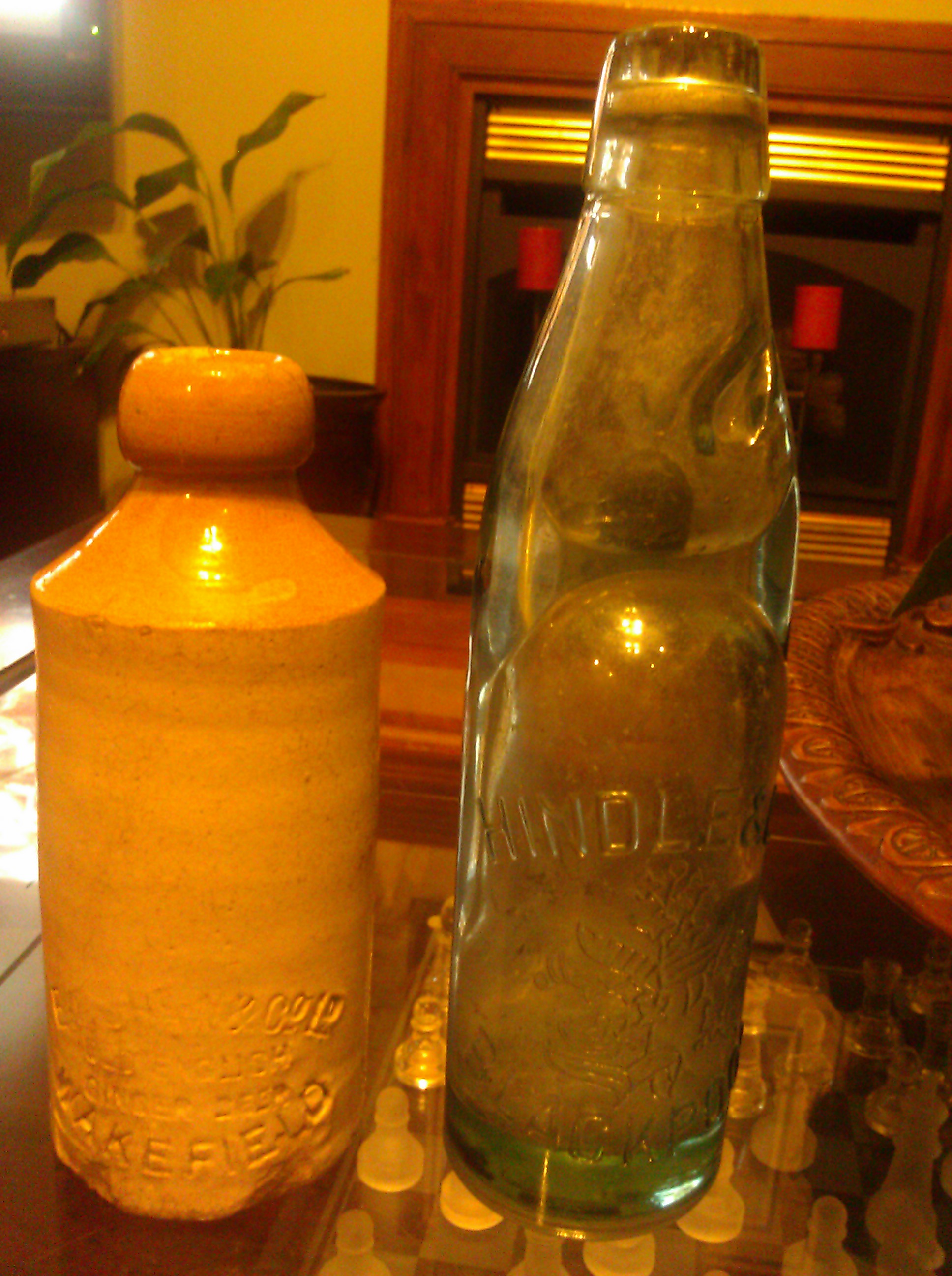 I HAVE 2 BOTTLES I WOULD LIKE YOU TO LOOK AT.. I HAVE NO IDEA ABOUT THE BOTTLES OTHER THAN A LITTLE RESEARCH I'VE DONE TODAY. THE TAN BOTTLE IS A: EP SHAW & CO. LD OLD ENGLISH GINGER BEER WAKEFIELD BOTTLE AND APPEARS TO BE MADE FROM CLAY WITH THE LETTERS SCRATCHED INTO THE SURFACE//THE GREENISH BOTTLE IS A : HINDLE & CO. BLACKPOOL WITH 10 OZ AND 11B2 ON THE BOTTOM.
