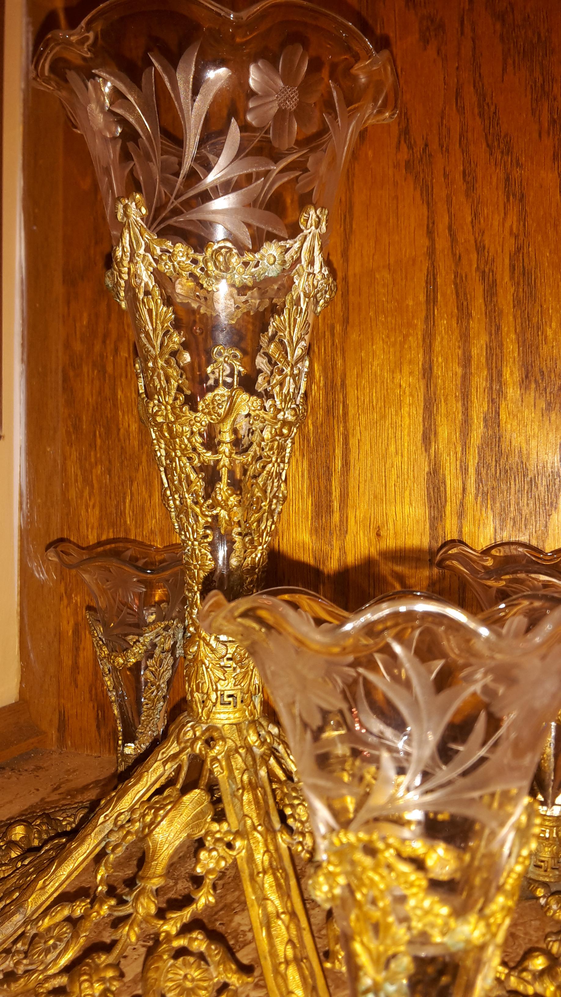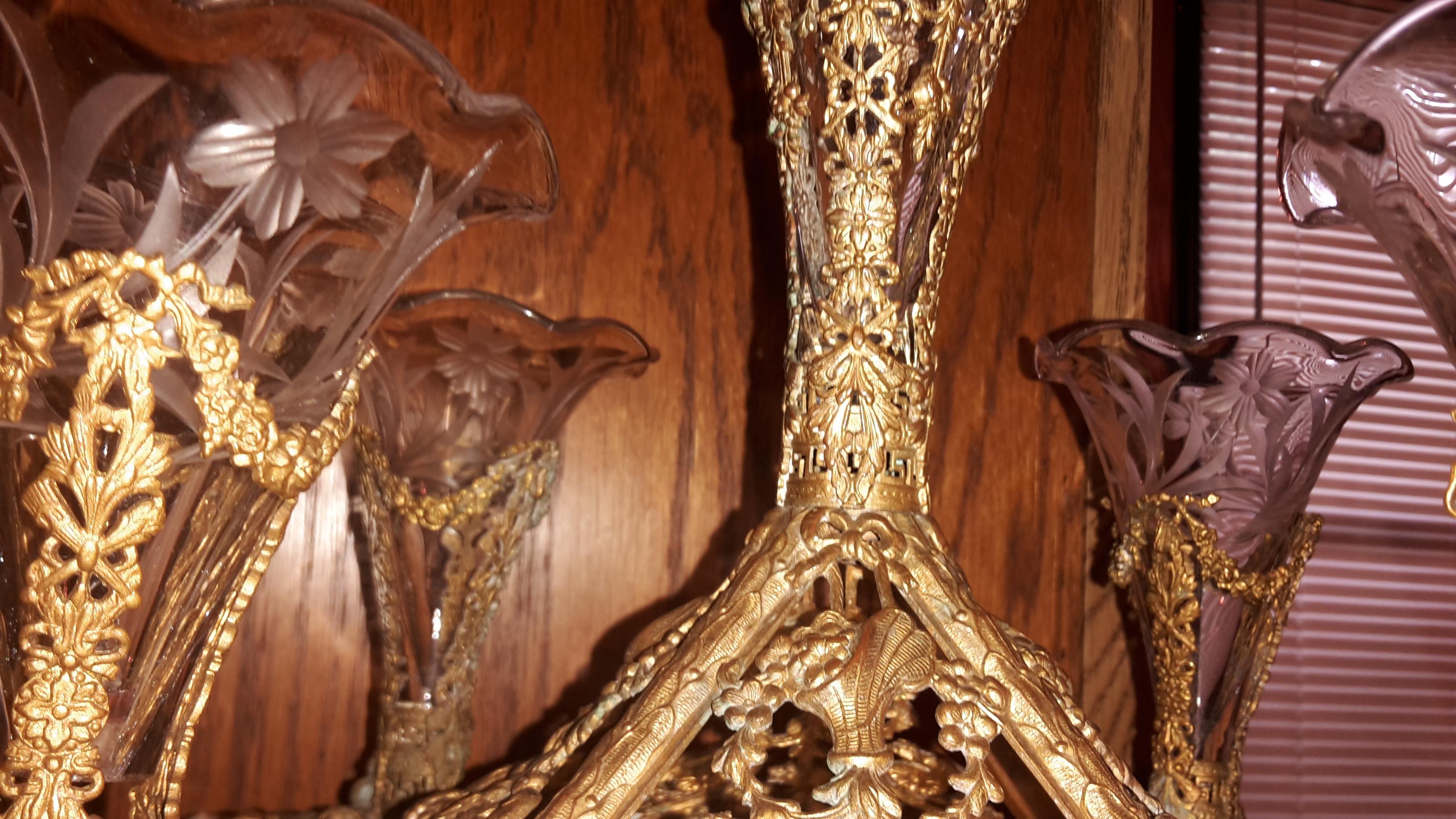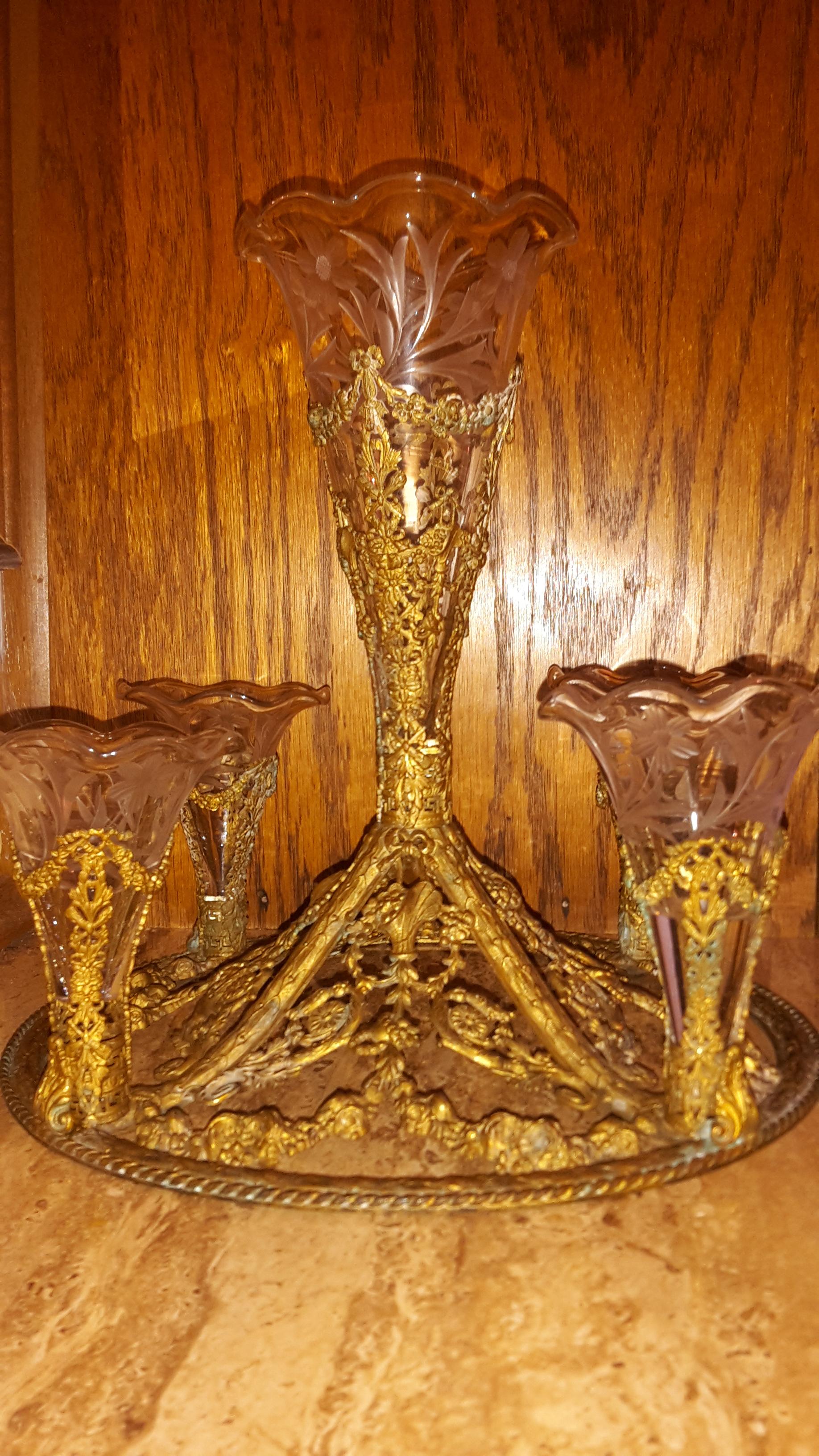 Re: Epergne Brass and Etched glass flower vases