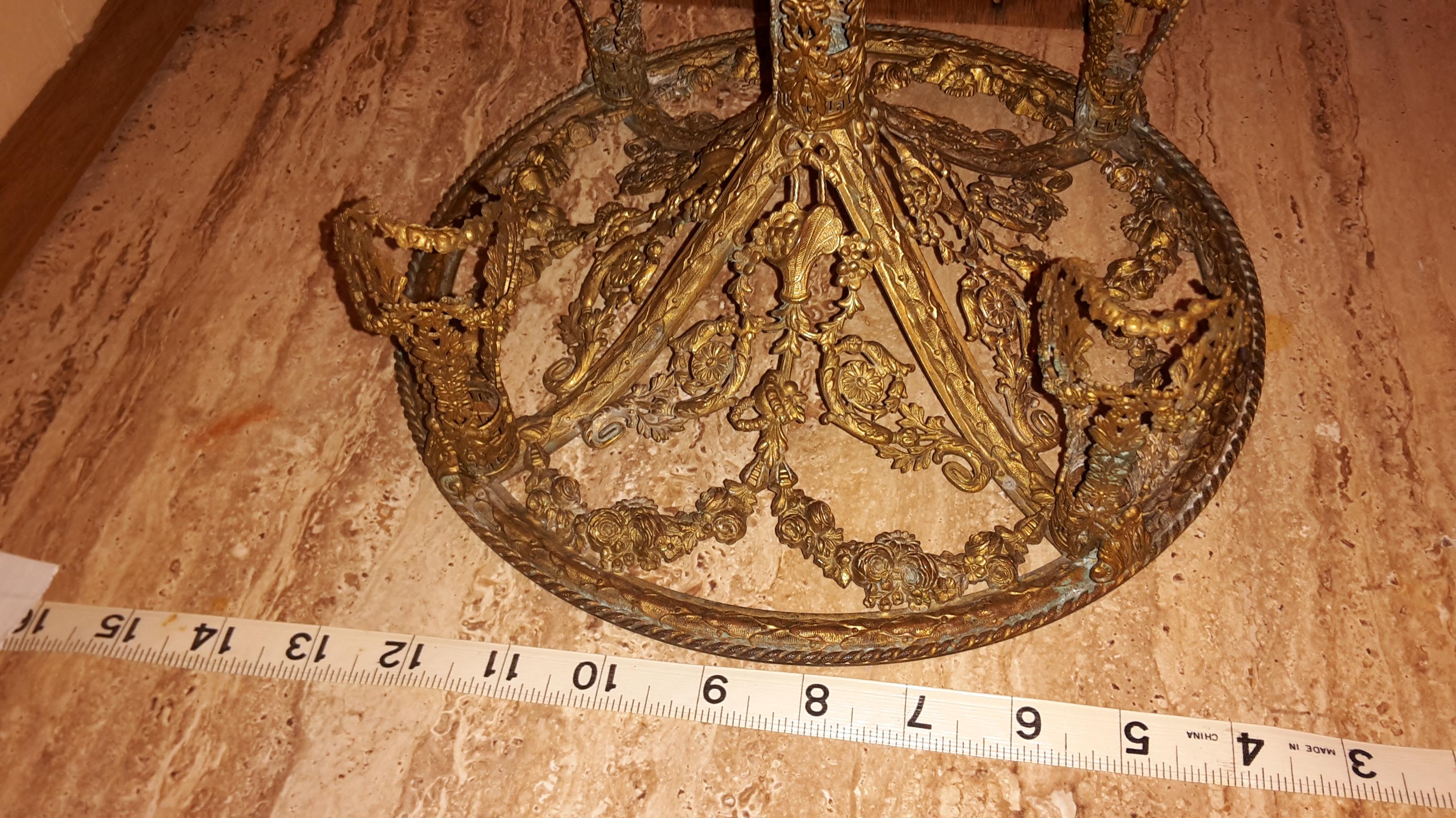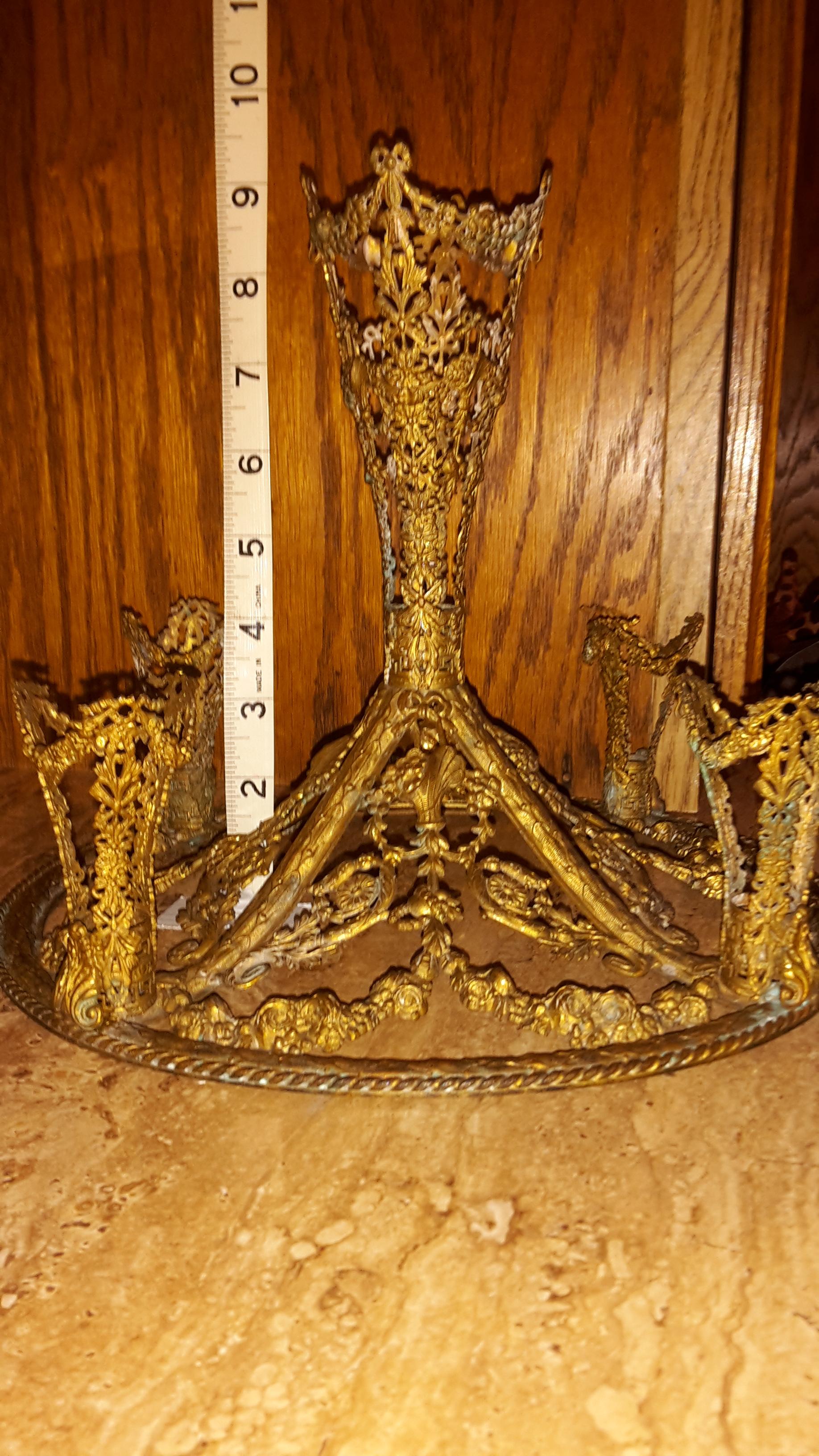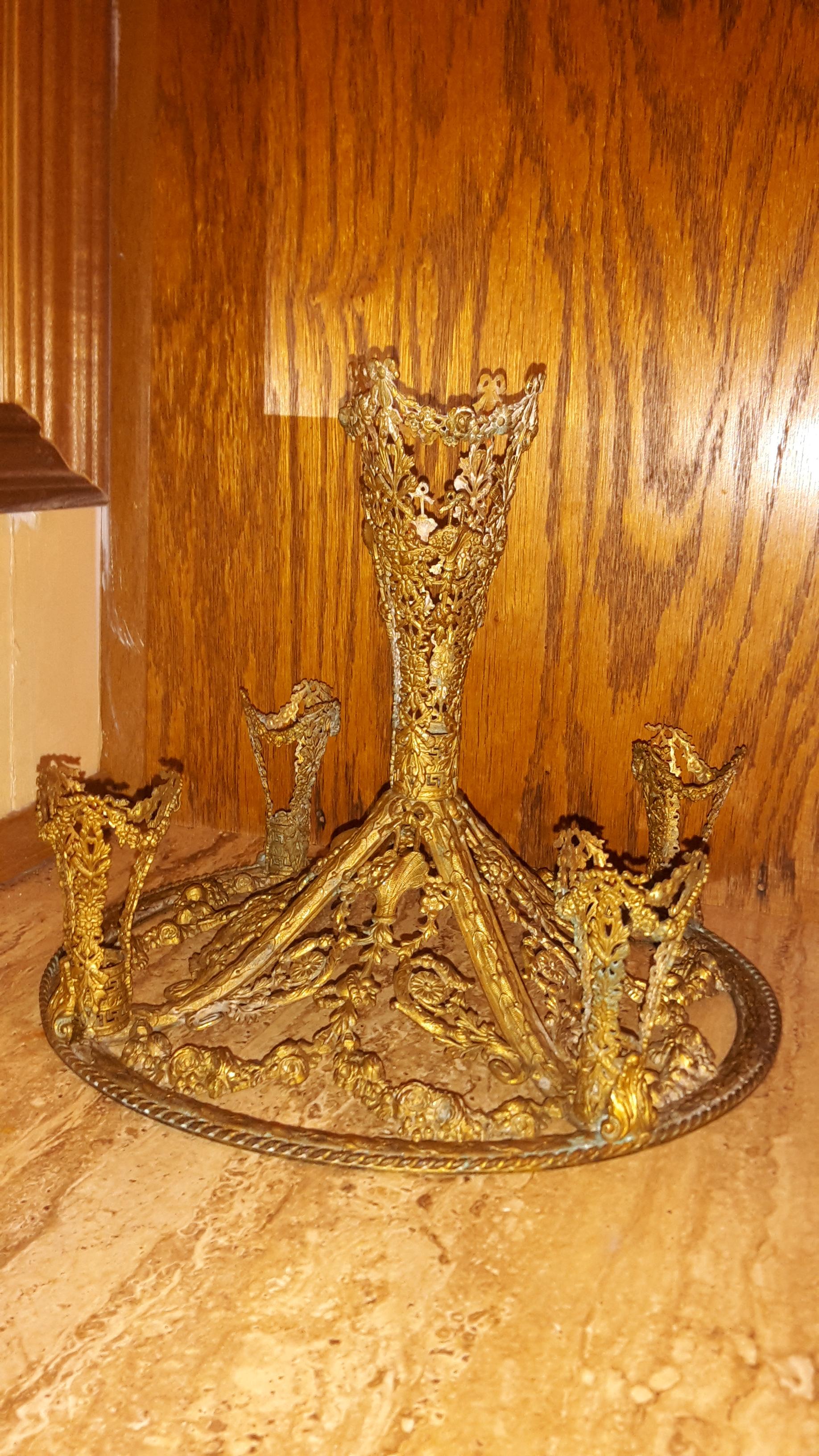 Unique brass flower epergne. 4 small glass etched flower vases and one large center etched vase. No makers marks that I can find. Very ornate. There are hooks on each vase holder, I imagine they may be for a decrotive chain of some sort. Approximately 11inches tall by 11 inches in diamiter. Two of the small vase have broken stems, but still hold water, one has been repaired. Very ornate. I did some research and many of the flowers and other items such as bows, arrows, etc... may indicate this was a wedding centerpiece or gift.