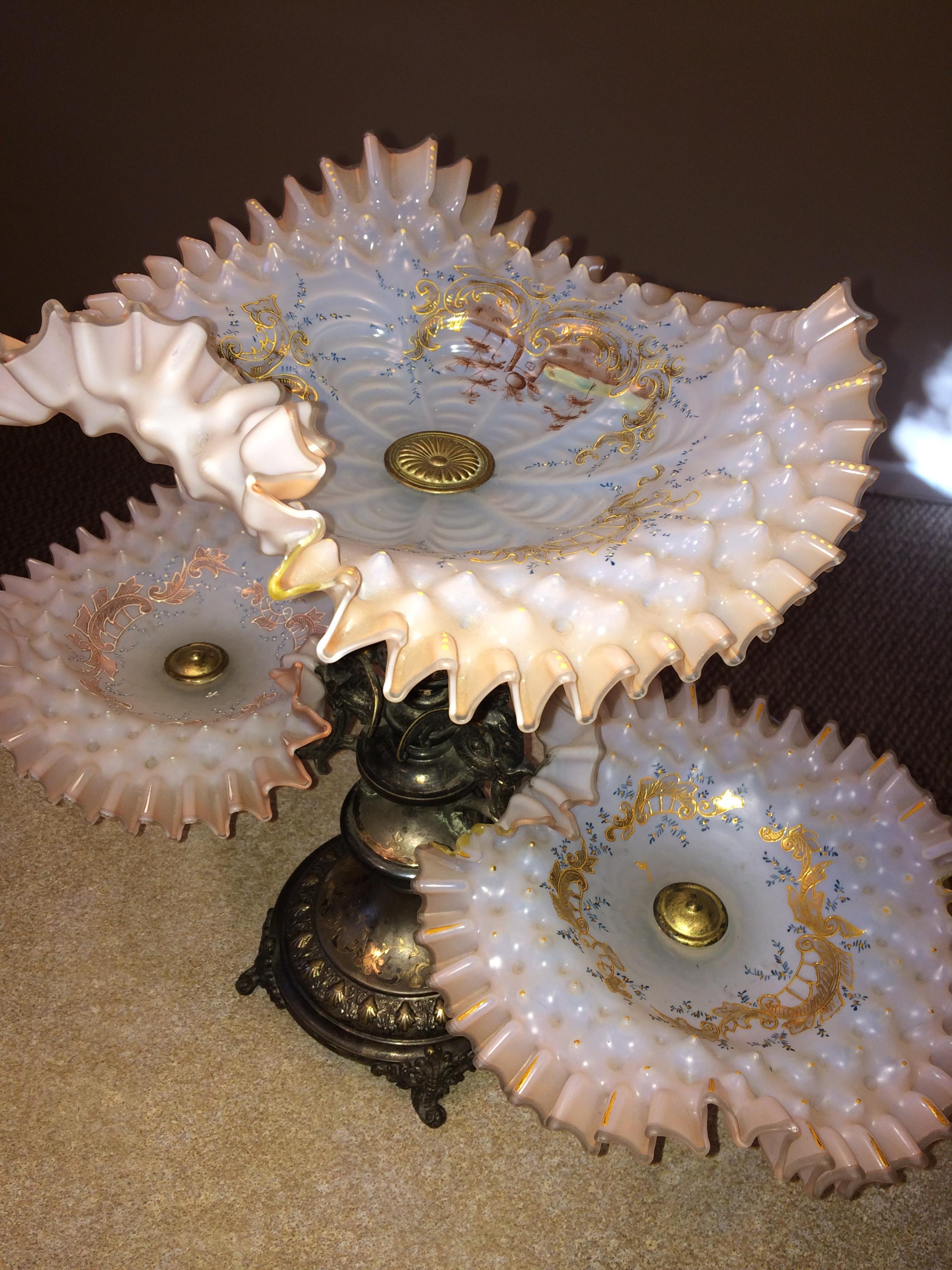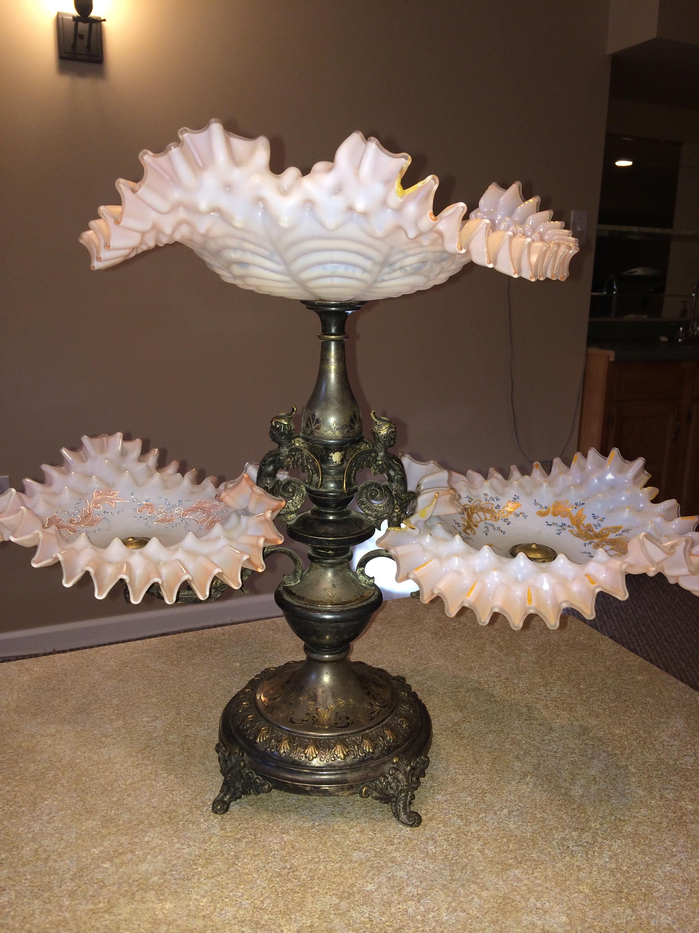 This is a 16 " high x 22" wide brass epergne. It has three light pink fluted glass bowls decorated with gold and blue accents which are raised so I think they are hand painted. I believe the piece is from Romania or somewhere in Eastern Europe. There are no markings under or on it that I can see. Would love to get some information about this and an approximate value. Thank you.