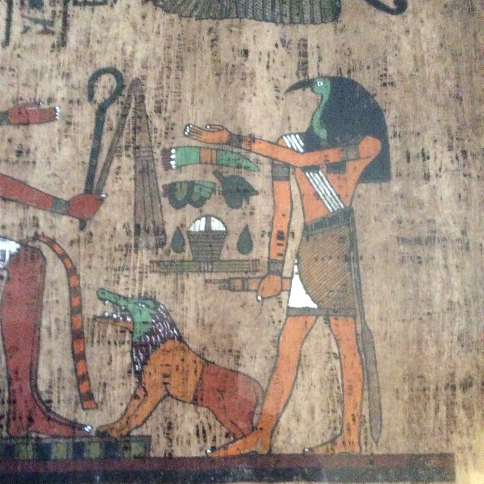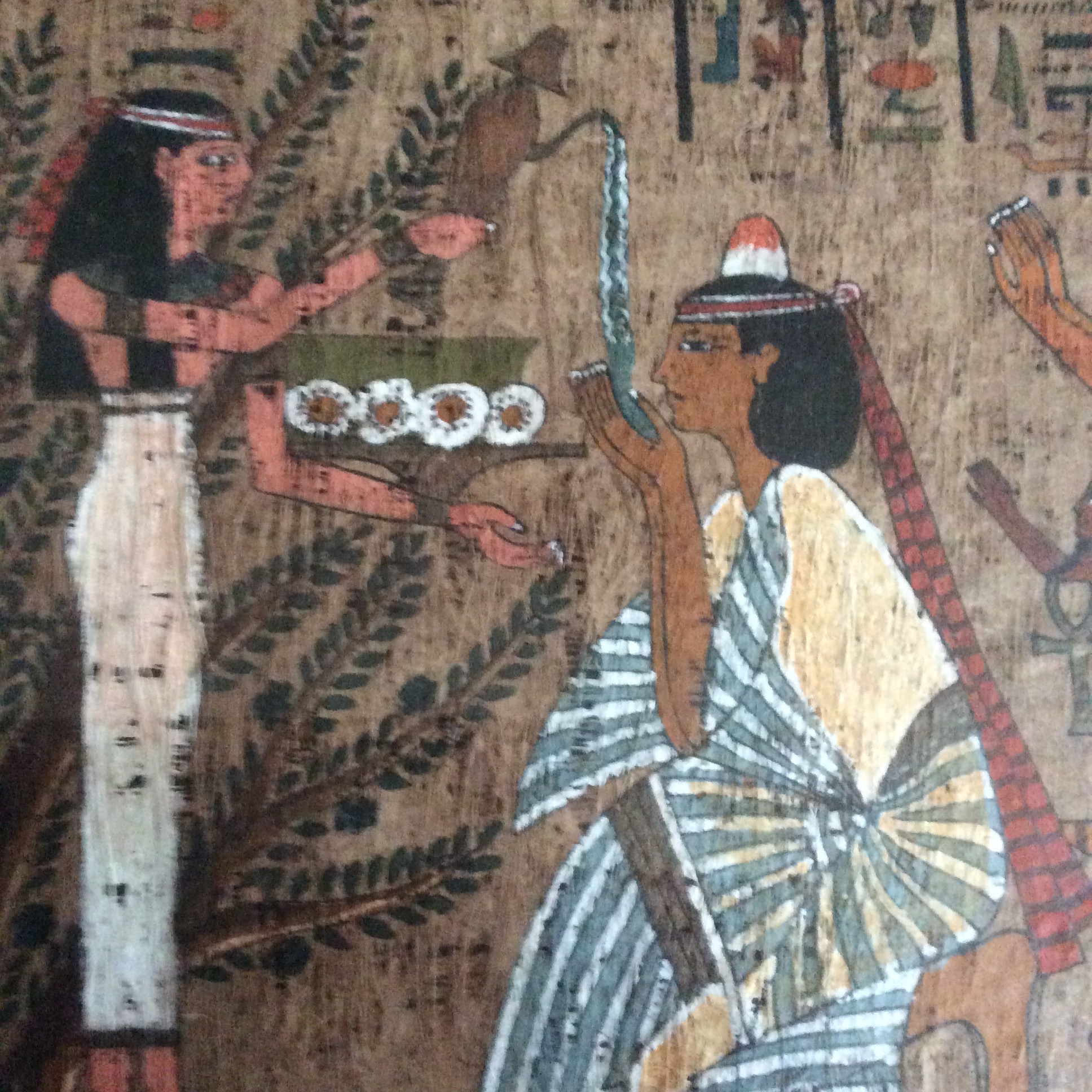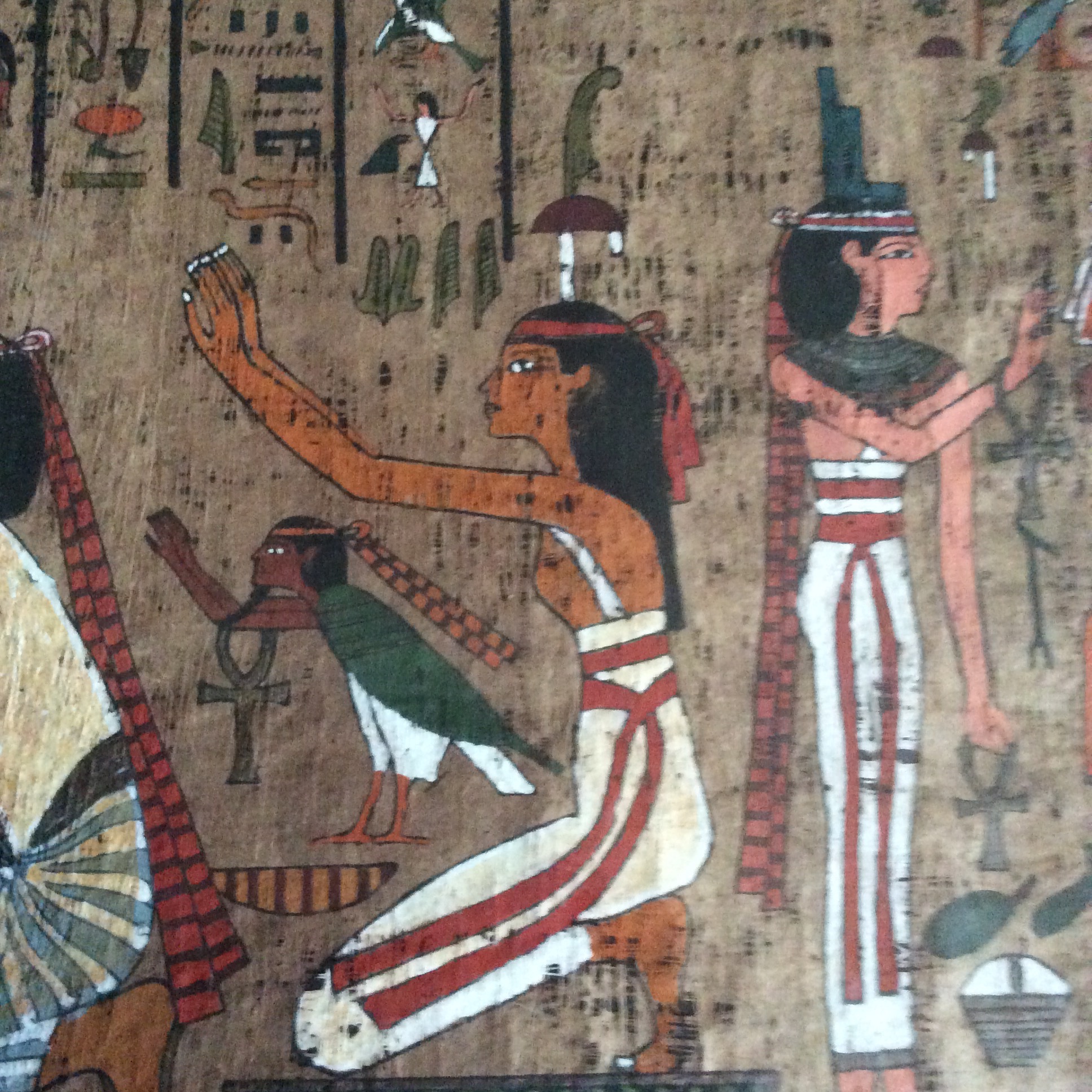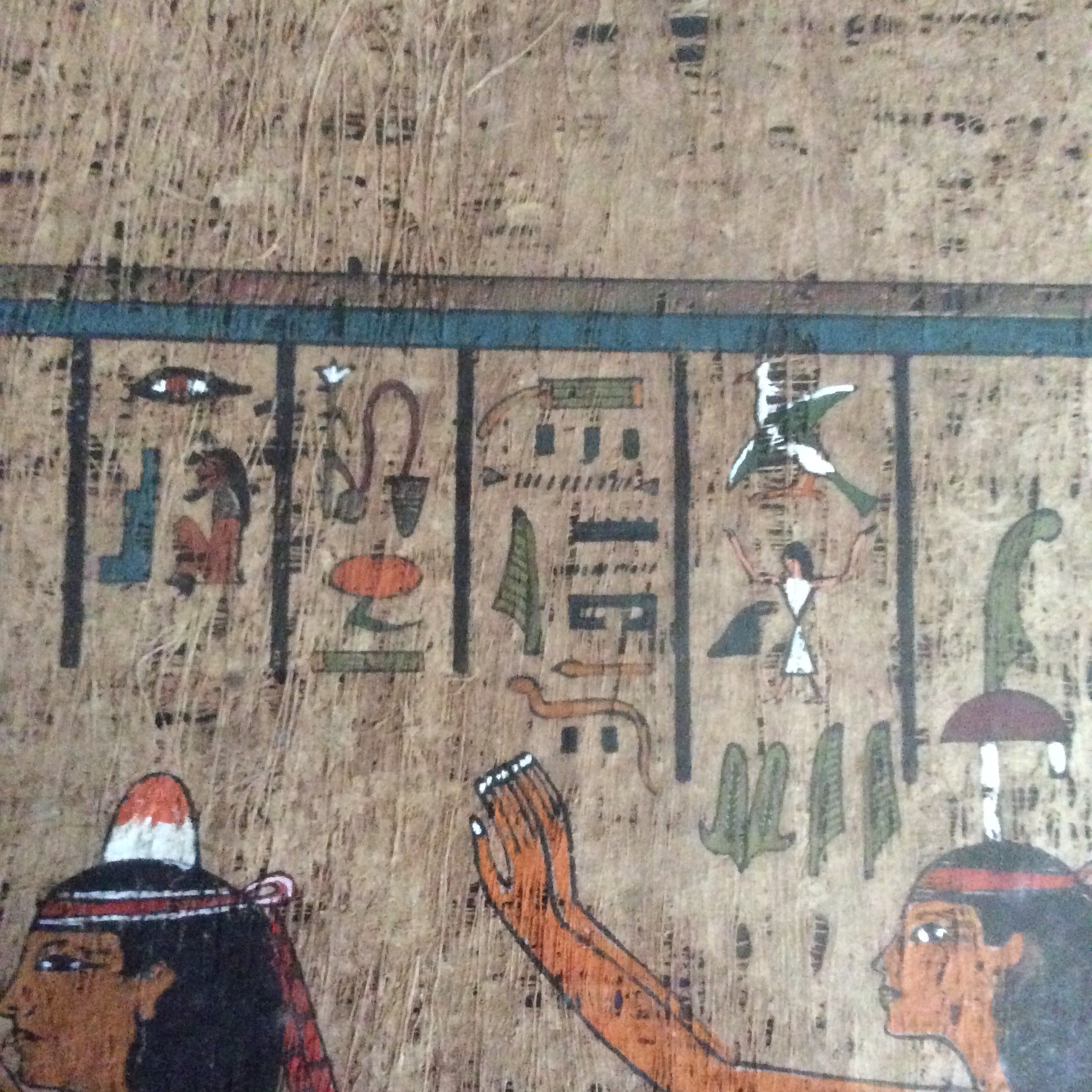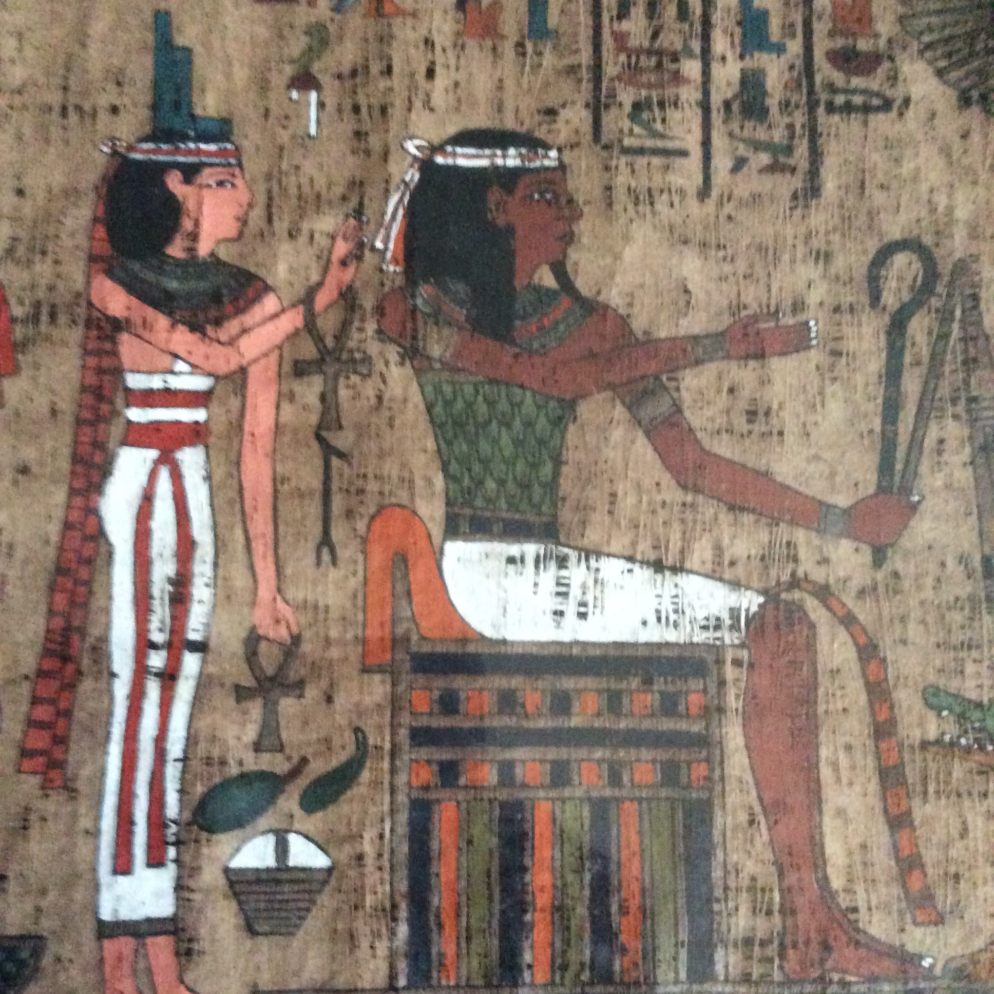 This papyrus was given to me, already professionally framed, by a friend who knew I enjoyed Egyptian history and artifacts. According to him, his father received it, from a dig supervisor, while he was working as a laborer. I am not sure if his memory is correct but my friend said the dig was in Thebes. The dig must have occurred prior to the mid 1970's as my friend and his family moved to the U.S. when he was just 3 years old and he's now in his mid 40's. The papyrus is 37"L x14.5"W. The cloudiness is glare not damage to the papyrus. I have attempted to research it but have never been able to find anything remotely like it on line, nor can I read hieroglyphics. There is a taped slip of paper with, what I am told, are the words,'Queen ___ prostrating.' The person that translated it could not decipher the name of the queen. I've taken close up photos of individual sections of the hieroglyphics as well as a broad photo of the entire piece. I need to sell this, but have no idea of it's value. Any help you can give would be greatly appreciated. Thank you.