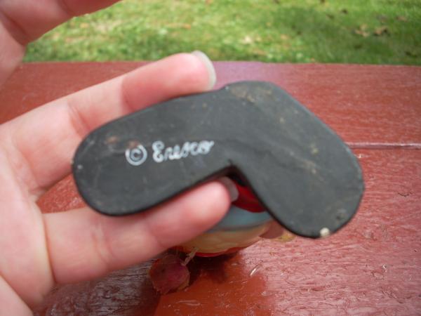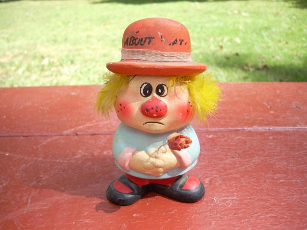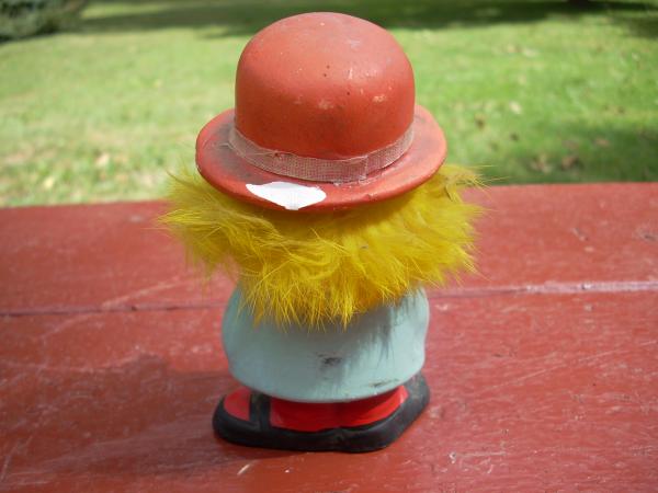This is a small clown statue that I believe is made out of ceramic. There is a small chip in it that is missing off of the back of the hat.