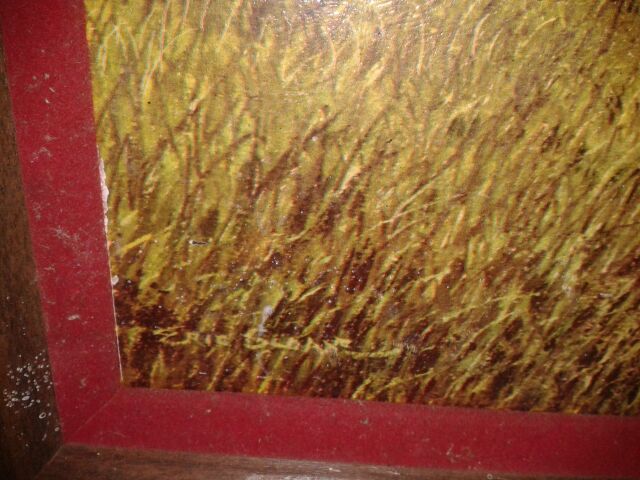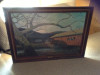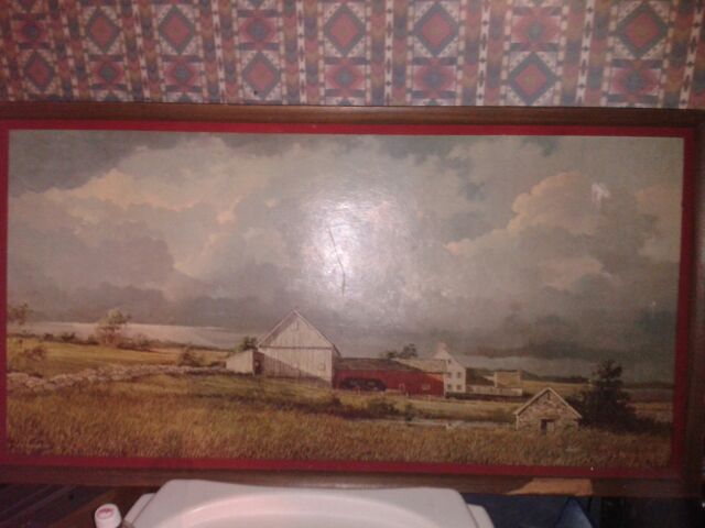 Painting of a white and red barn and a white house with landscape and rock wall, clouds in the sky.