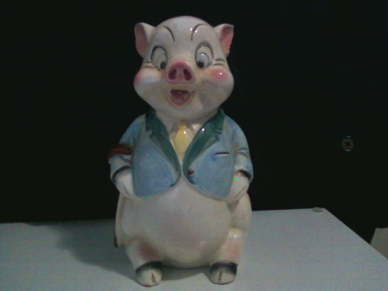 Pig is rather mature lookinmg with a very nice jacket(blue) wearing a yellow tie, also has a wooden cane which hangs off his right arm. Jacket has one button. The slot for coins is hidden and is at the back of pigs head, located between the ears sideways.
