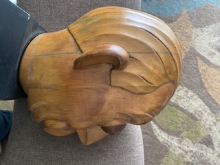Wood, mounted on wood base. Small metallic dedication plaque on base.