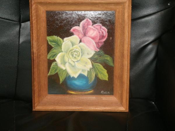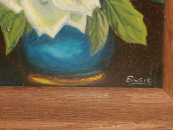 looks to be an oil painting in an old wood frame of flowers in a vase.down bottom on right hand corner is name essie but thats all it says so dont know if it was painted by a family member named essie long ago.was passed down to my mother n law but it was in her mothers home which would be my husbands mother n grandmother in west va.his mother recently passed at 74 n she had it hanging in a bedroom but everyone said it was ugly n no one wanted it so i took it for sentimental reasons.