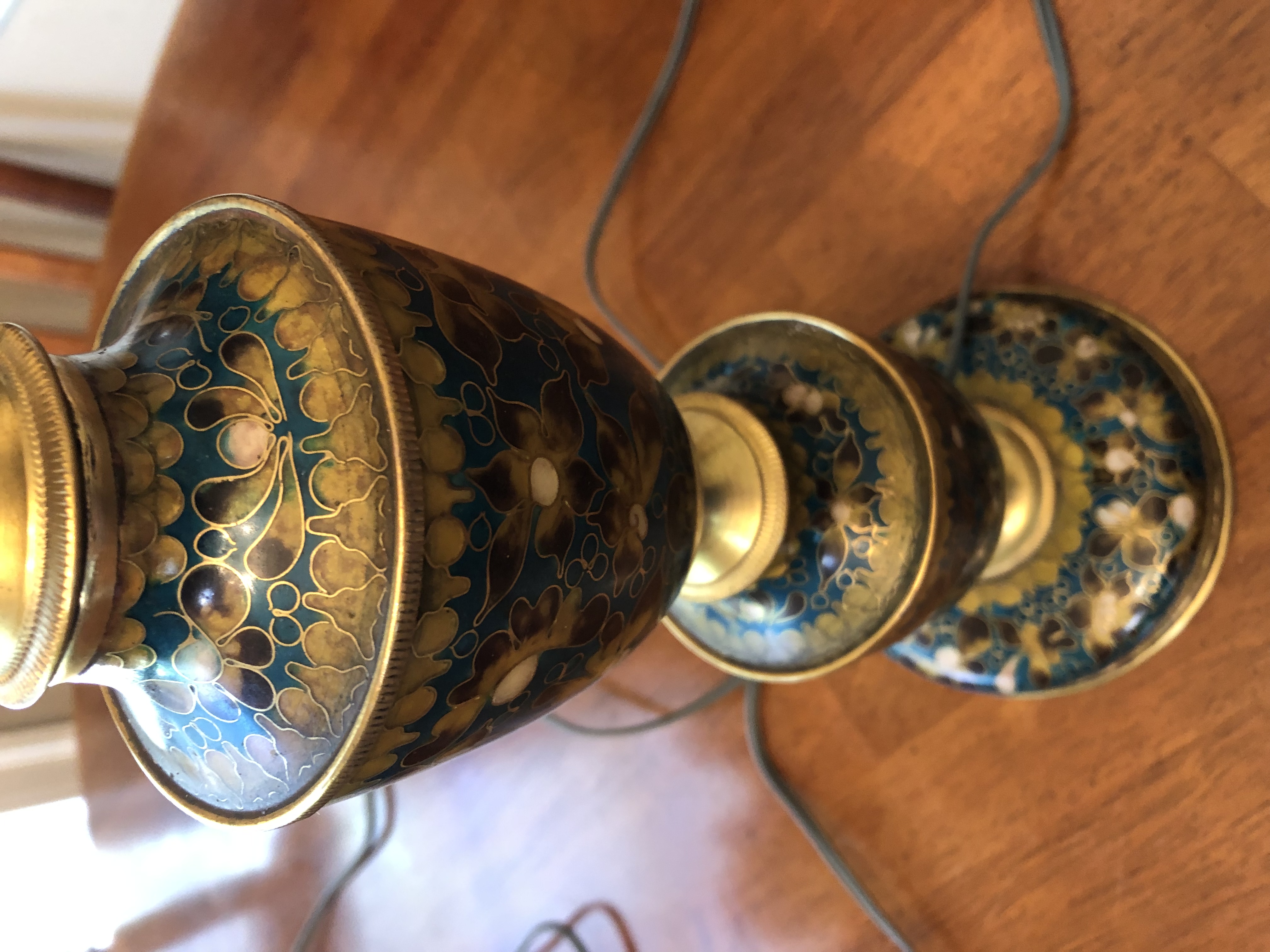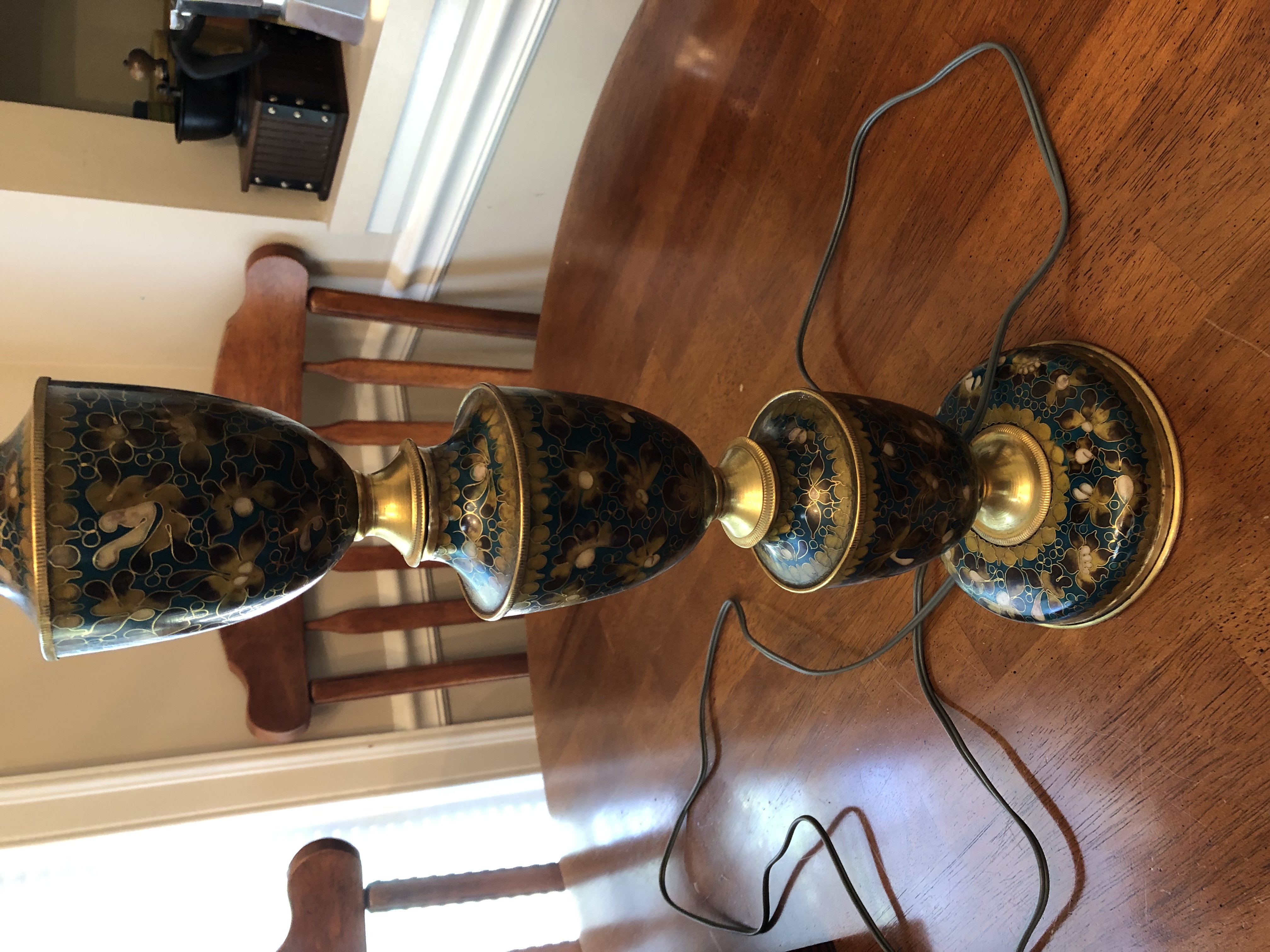 Found these at an estate sale. Love the look of the colored one, but have never seen anything like it before. Hoping to get some kind of information on it, if any? Very unique and beautiful. The brass lamp is very heavy and on a wood base. Any information would be appreciated!
