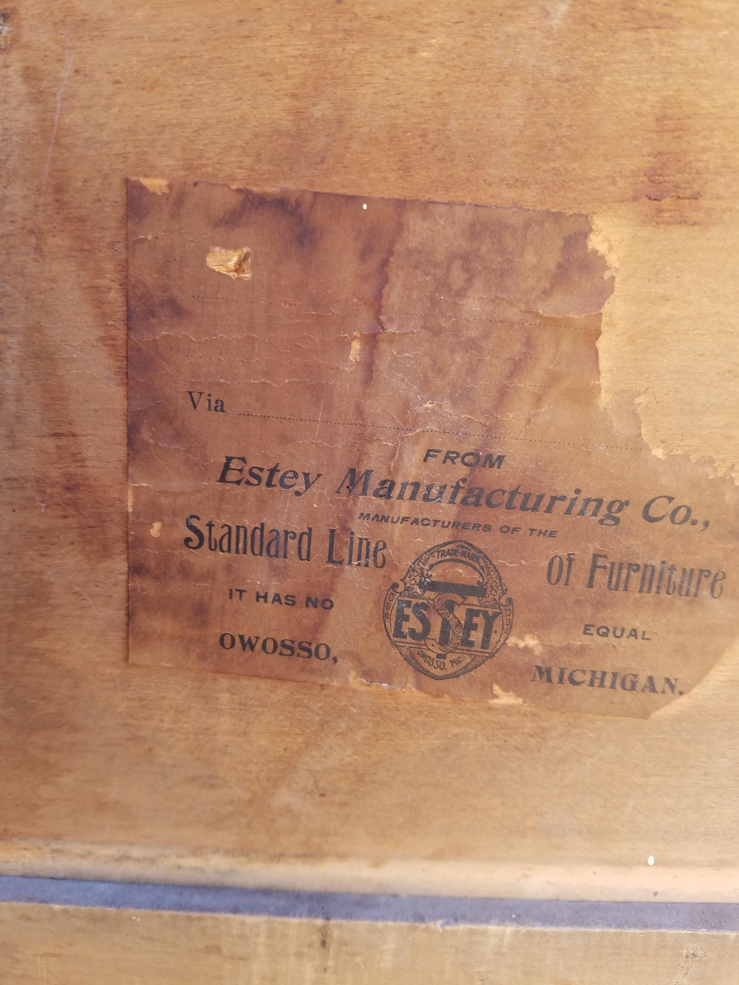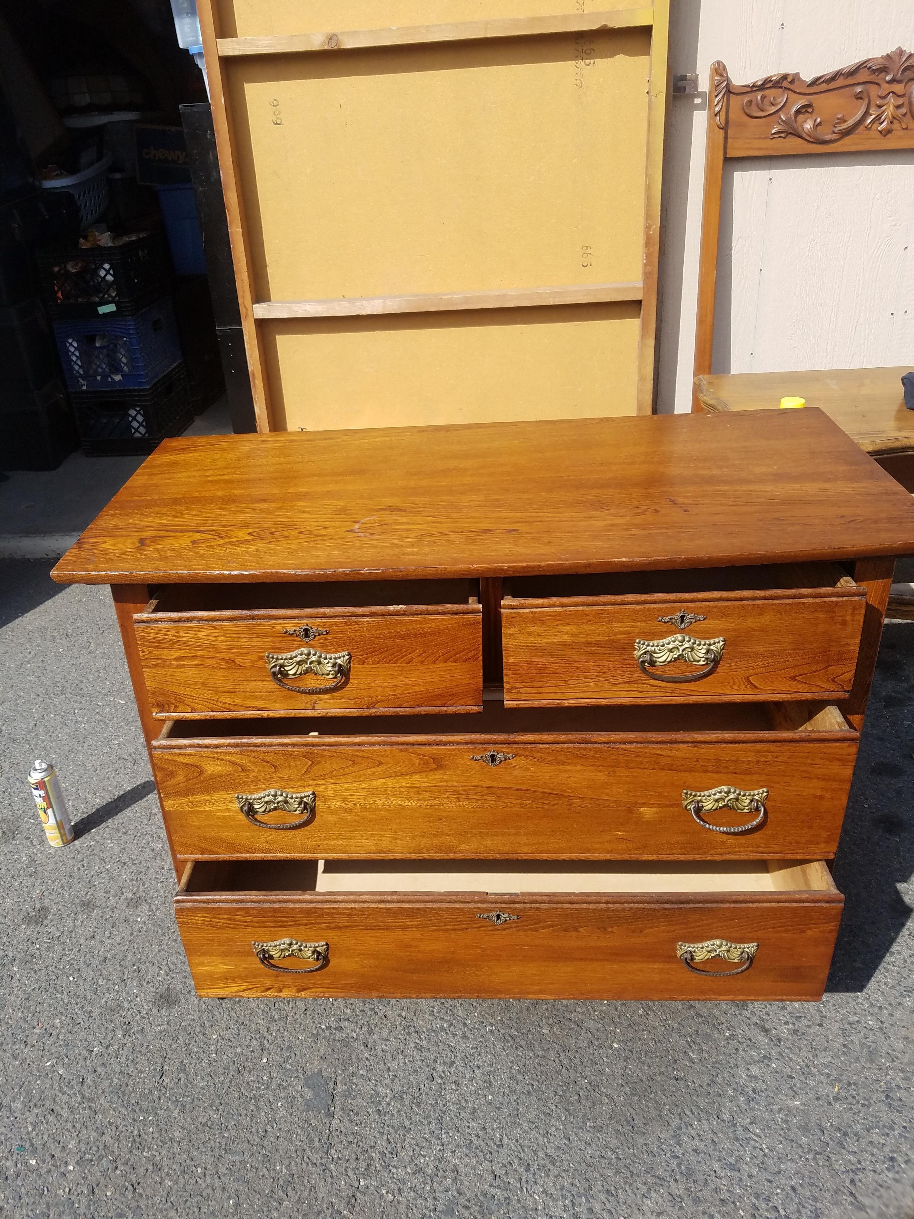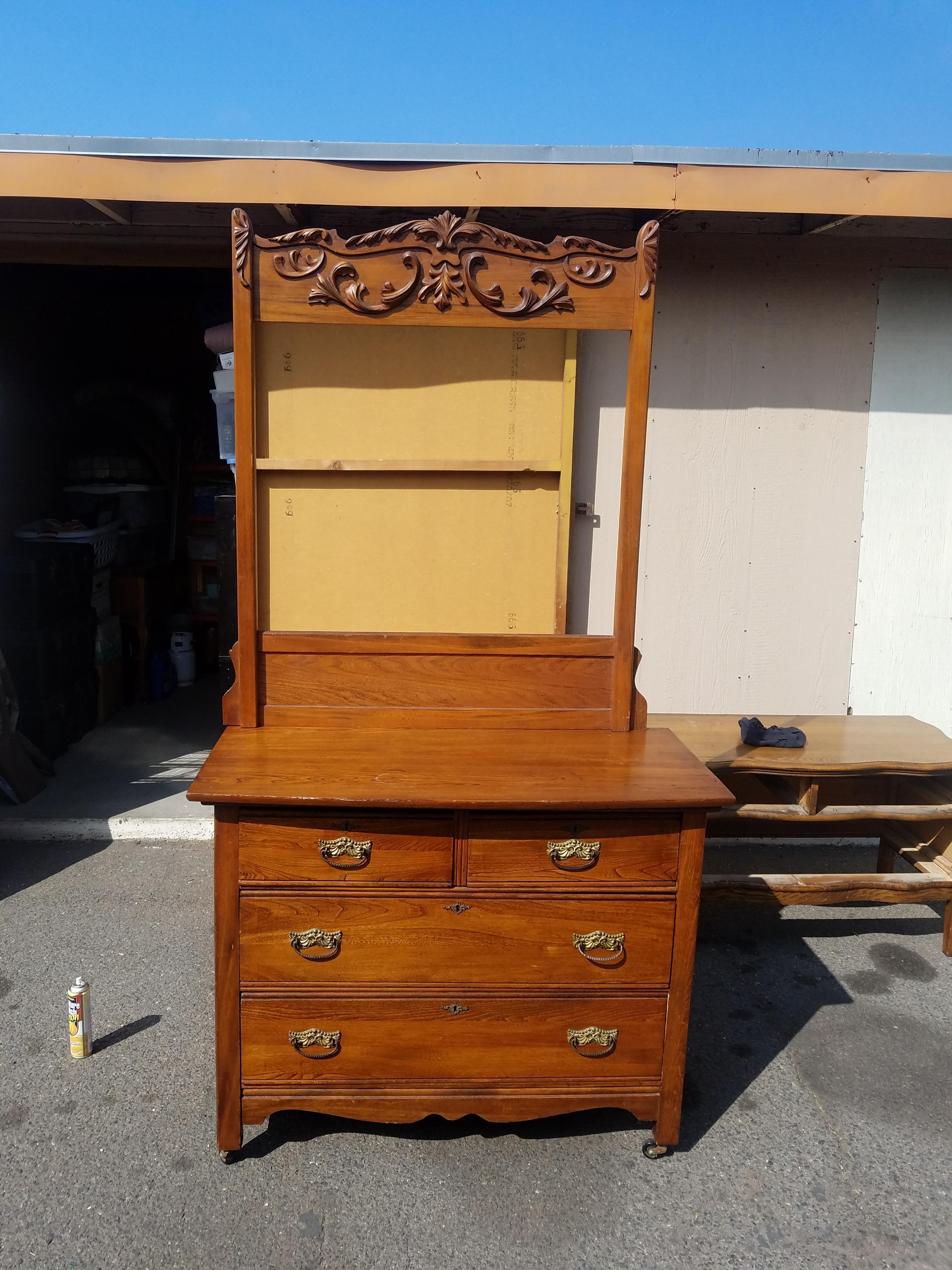This dresser is in good condition. All original casters, hardware - NO key. Could use some fixing or regluing on the back bottom right leg support. It seems to be pulling away. It does have the mirror frame, but mirror is missing. 42.5in x 21in x 35in high without mirror frame.