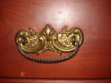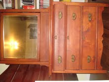 3 piece Estey Manufacturing Company bedroom set. The set includes a bed with a high headboard, dresser with swivel mirror, and a wash stand. It has brass handles with lock and key ( yes, we have the key). It is in good condition as you can see from the pictures. The mirror has the original wooden slats as a backer ( picture included). The original spring is included with the bed.