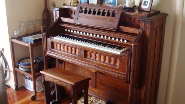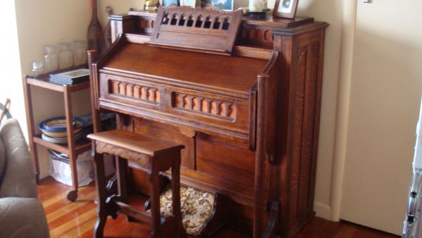 Well cared for, polished regularly and in good condition. Great sound and in great working order. Also has sloping organ stool.