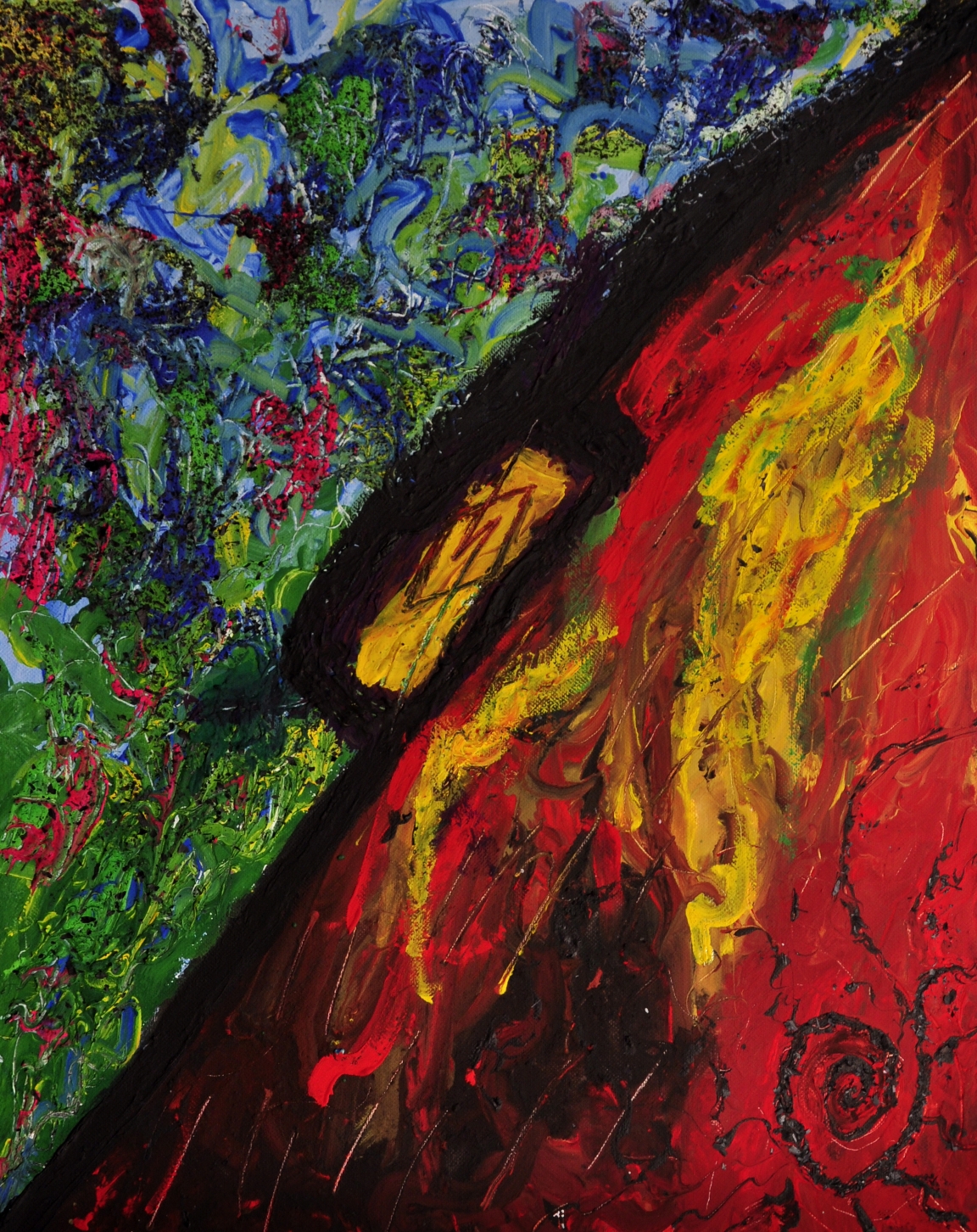 Heaven and Hell - Both sides are full of beauty and complement each other, yet are divided by the line of perception. Apparently, the piece has no depth or meaning, and that shows the meaninglessness of beauty and how beauty needs no meaning. It also highlights how nothing in the world has any meaning until we give it one.