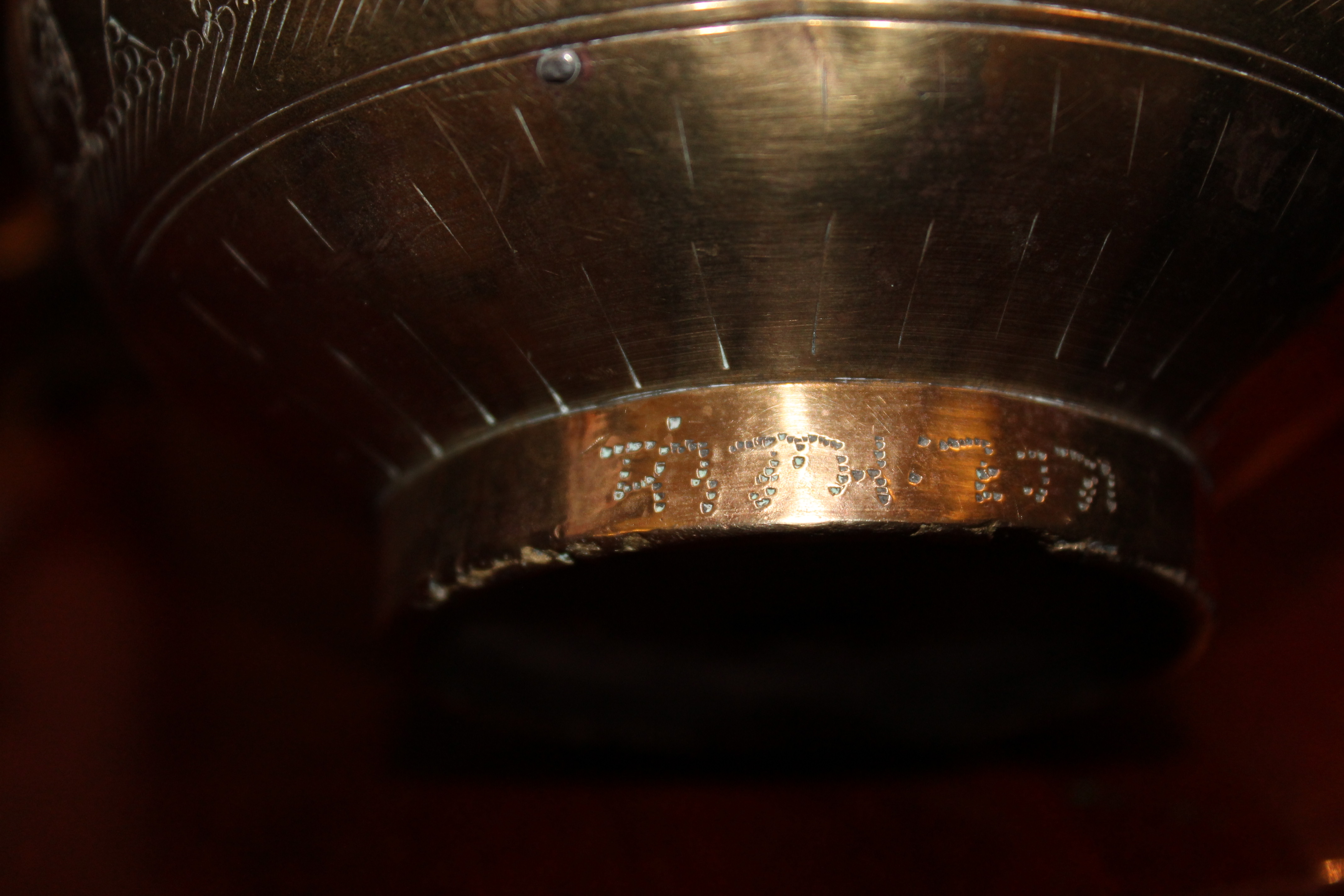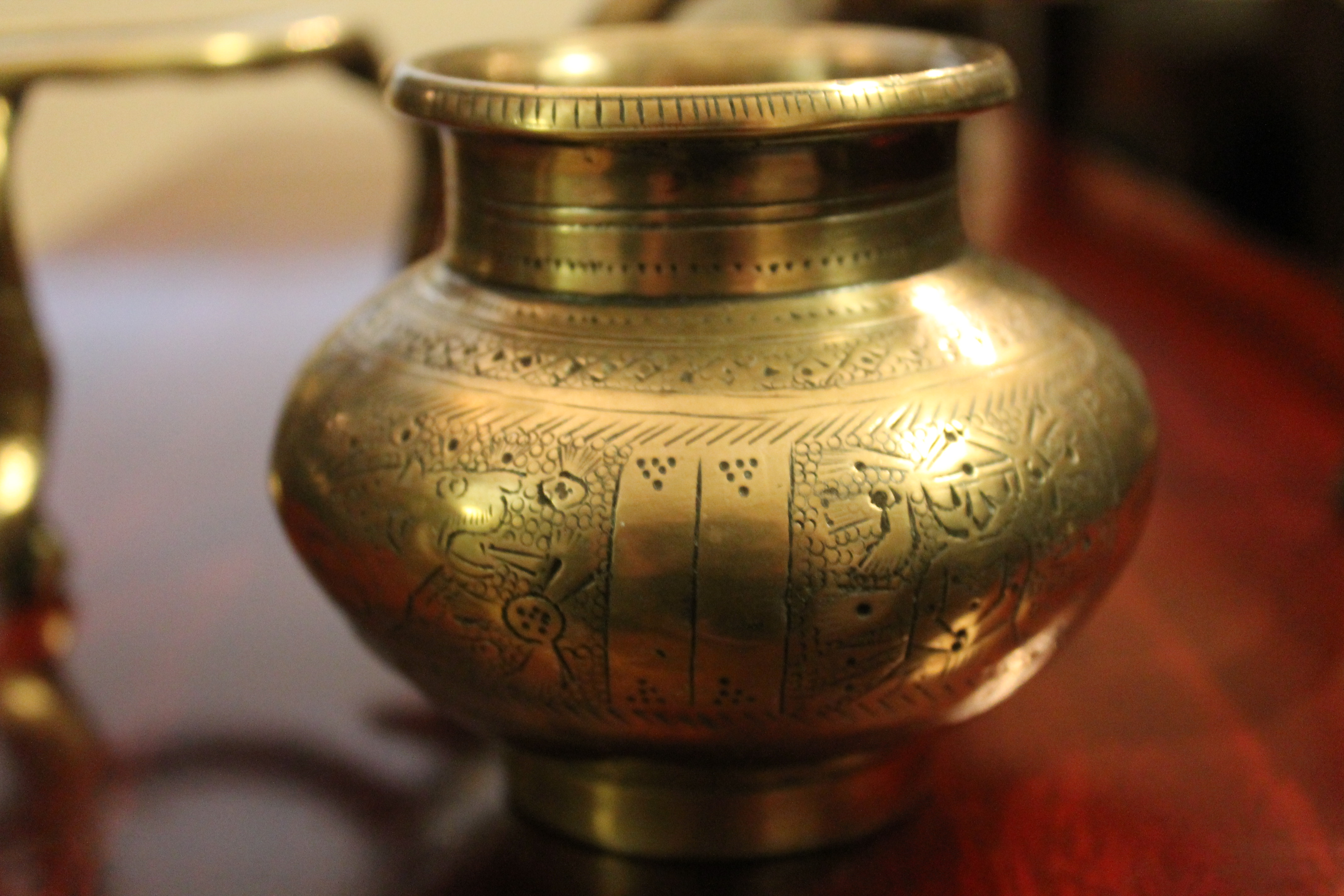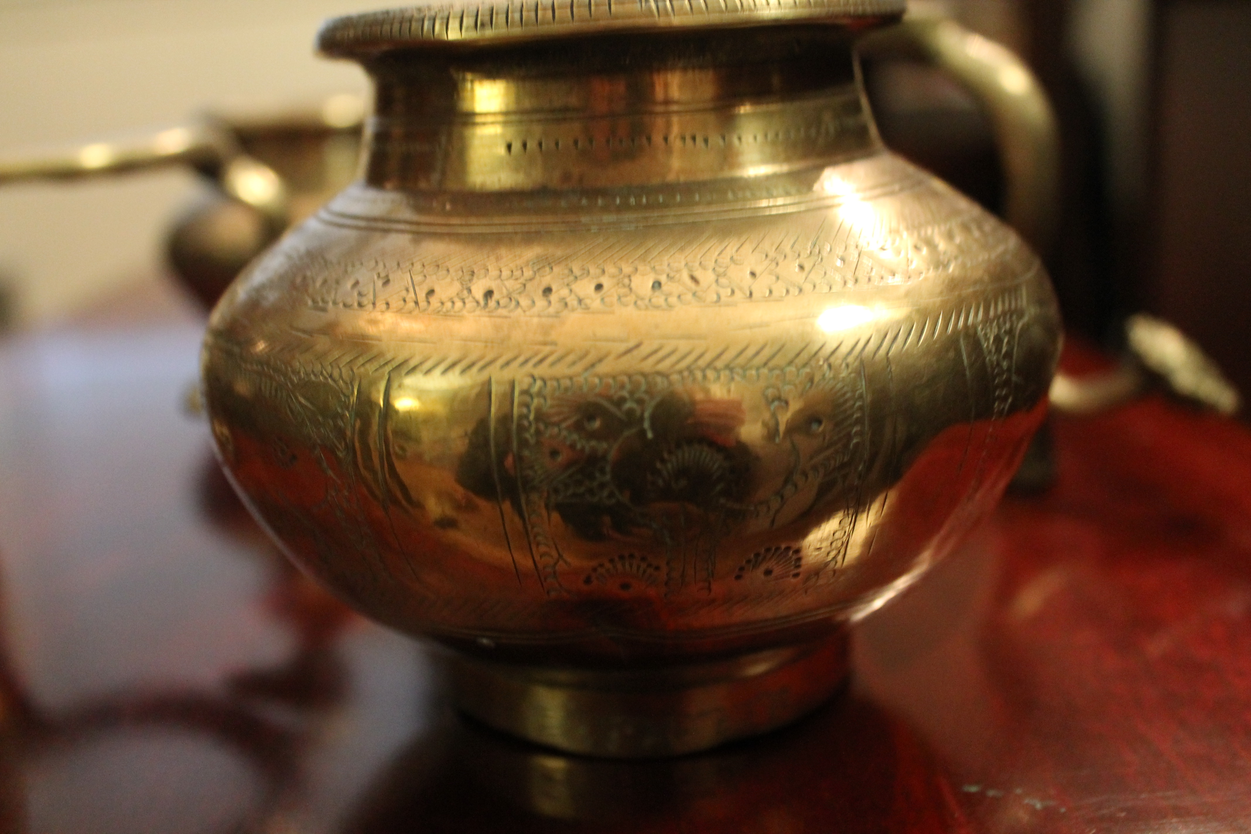 1850s Indian Antique Hand Crafted Engraved Brass Holy Water Panchpatra Pot