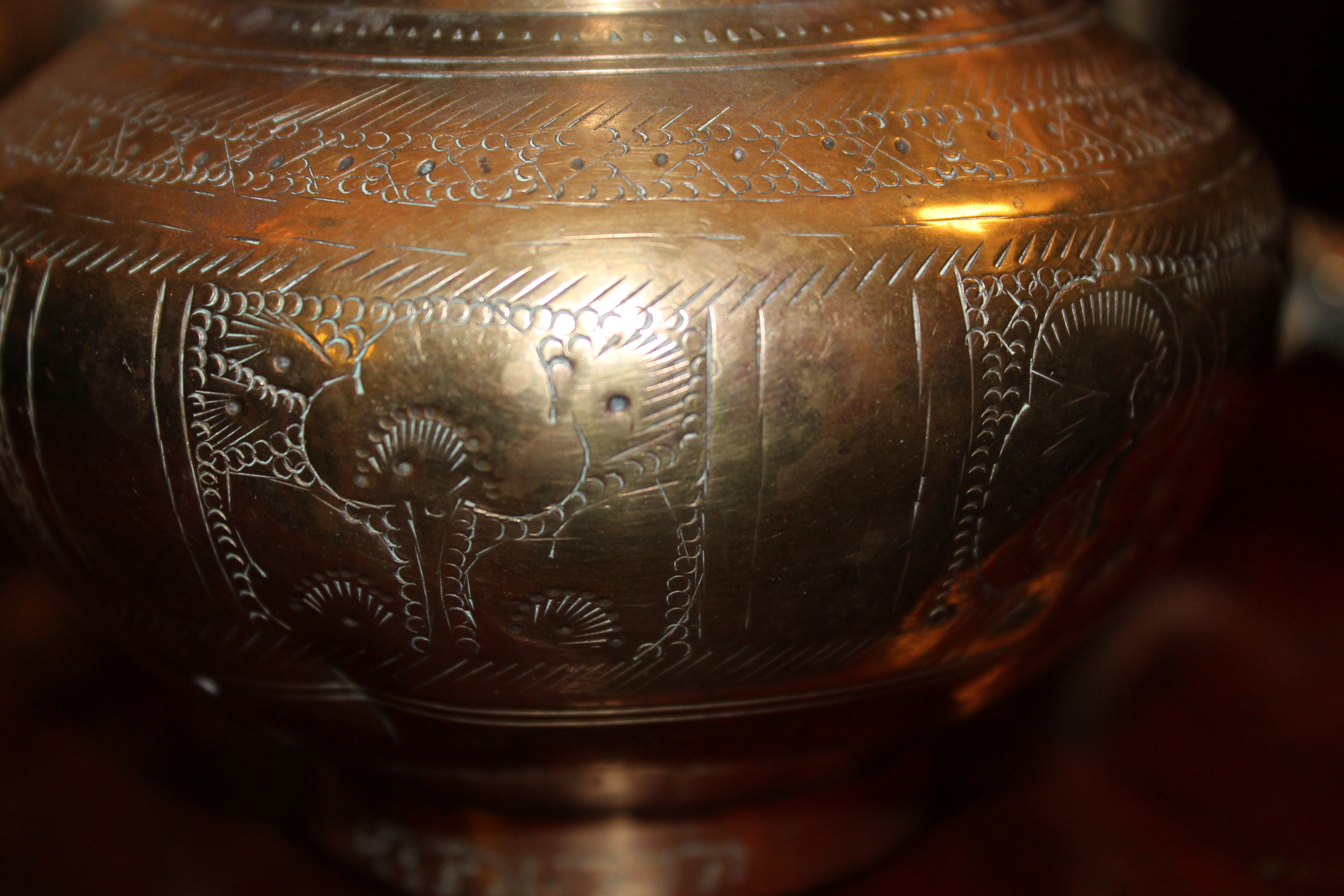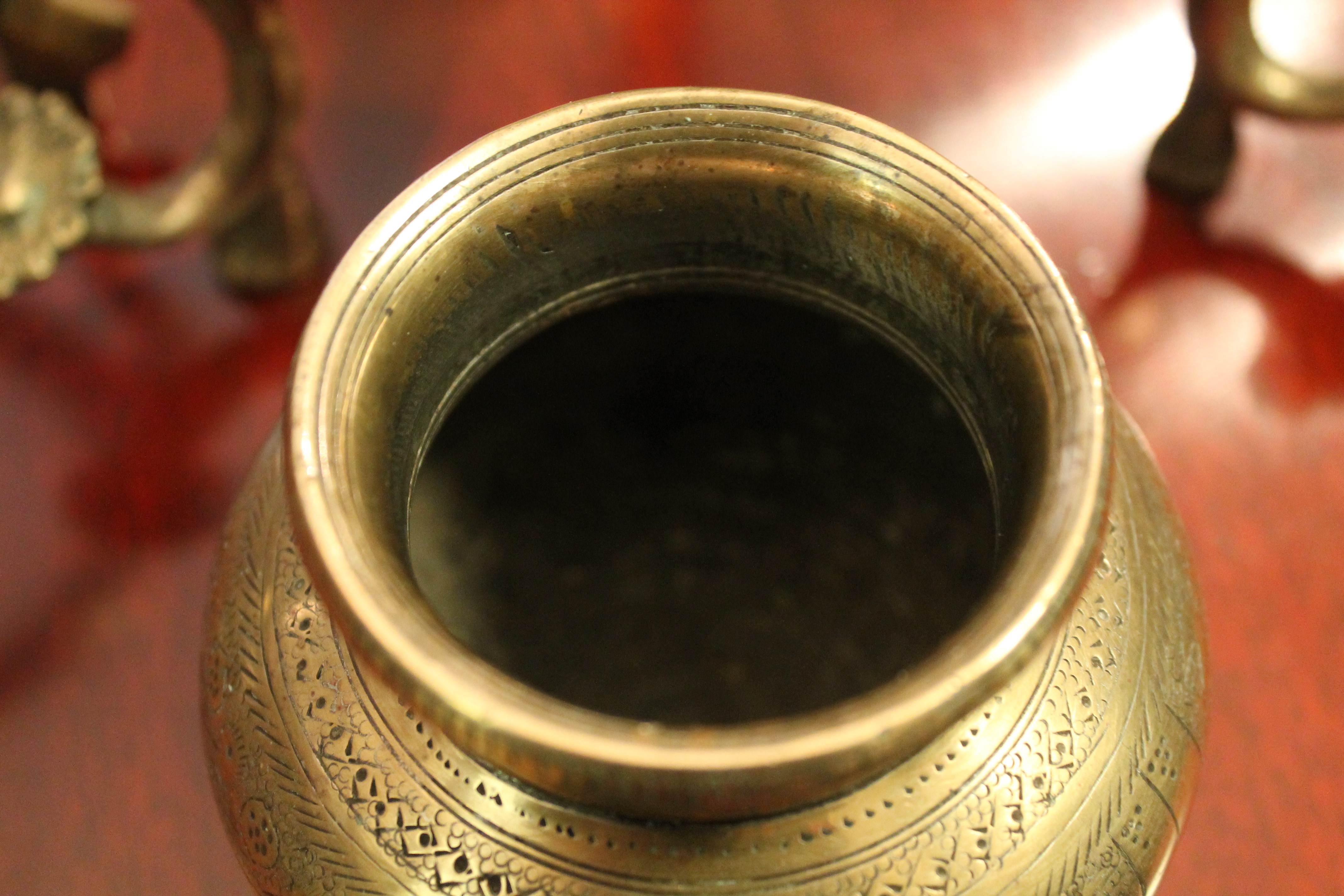 1850s Indian Antique Hand Crafted Engraved Brass Pot Matki Stand