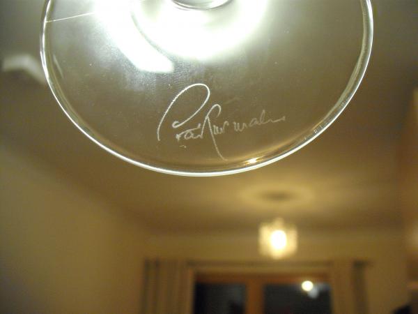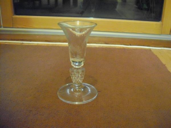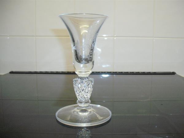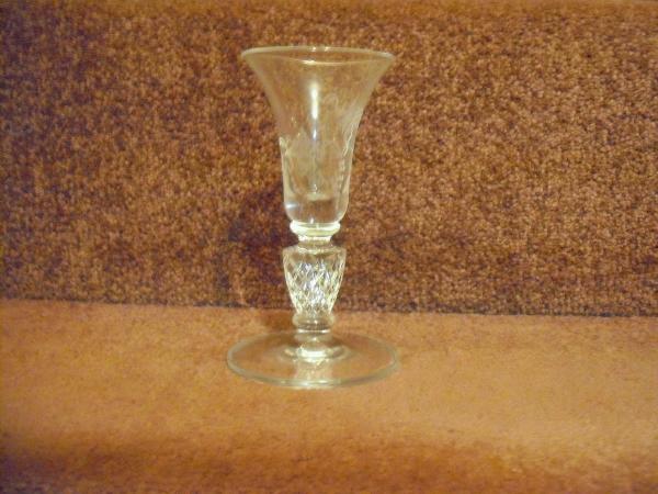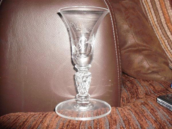 A small glass with pretty etching/engraving on the bowl of grapes and vine,bowl has a few horizontal ripples when looking at it closley,the stem has a diamond pattern and shows mold lines that extend to the foot,under the foot there is a slight ridge around the edge of he foot ,I cant see any wear on this glass .It has a name etched/engraved on the upper side of foot that looks like it begins with a p or d, and the base is larger than thee bowl ,,......thankyou .