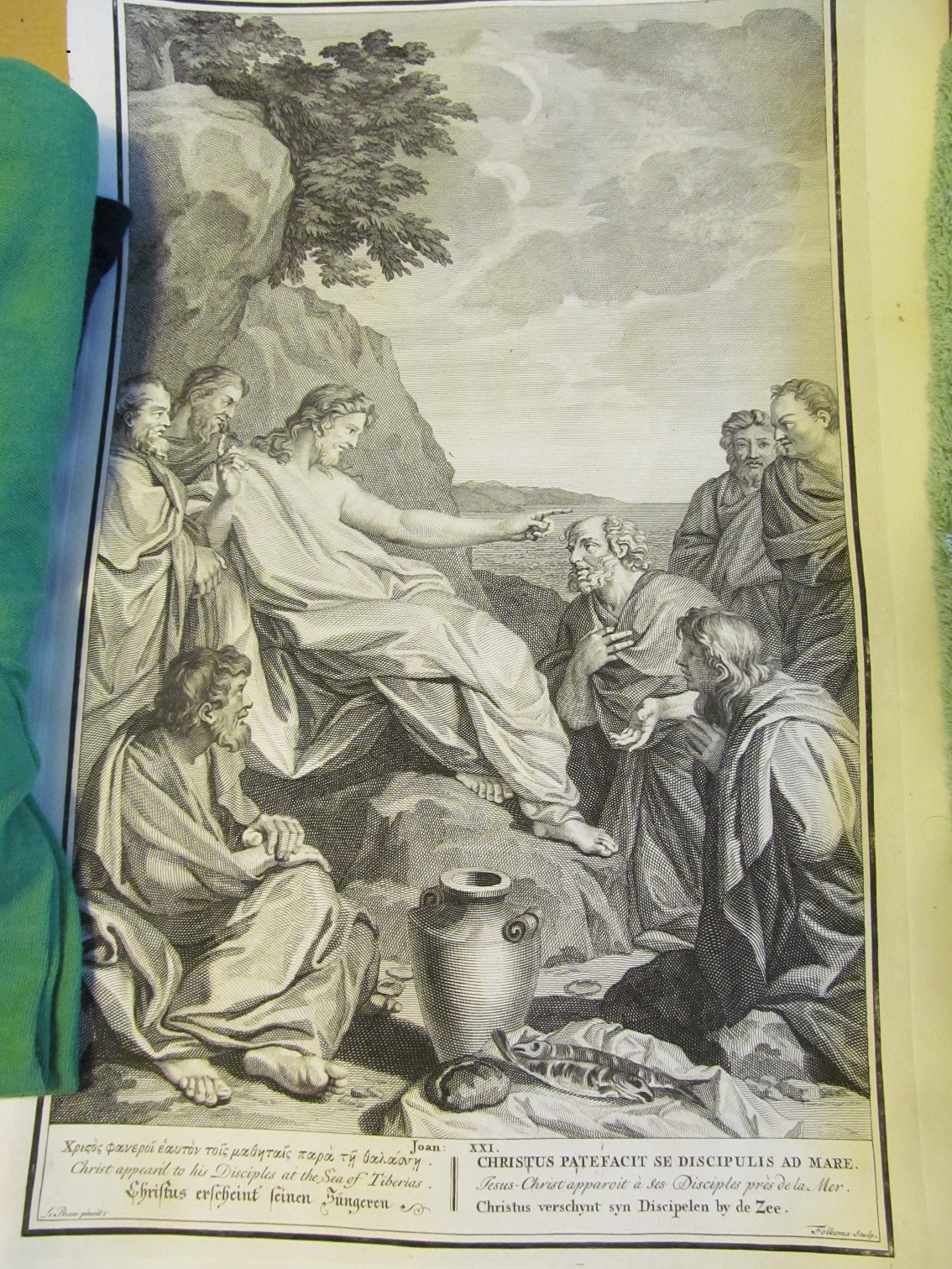 Etching of biblical scene from 1720 was probably cut from book (Bible?) The name le Brun appears on the bottom left which I assume refers to Charles le Brun. Etching is in very good shape, some aging around the edges of the paper, but otherwise, nice.