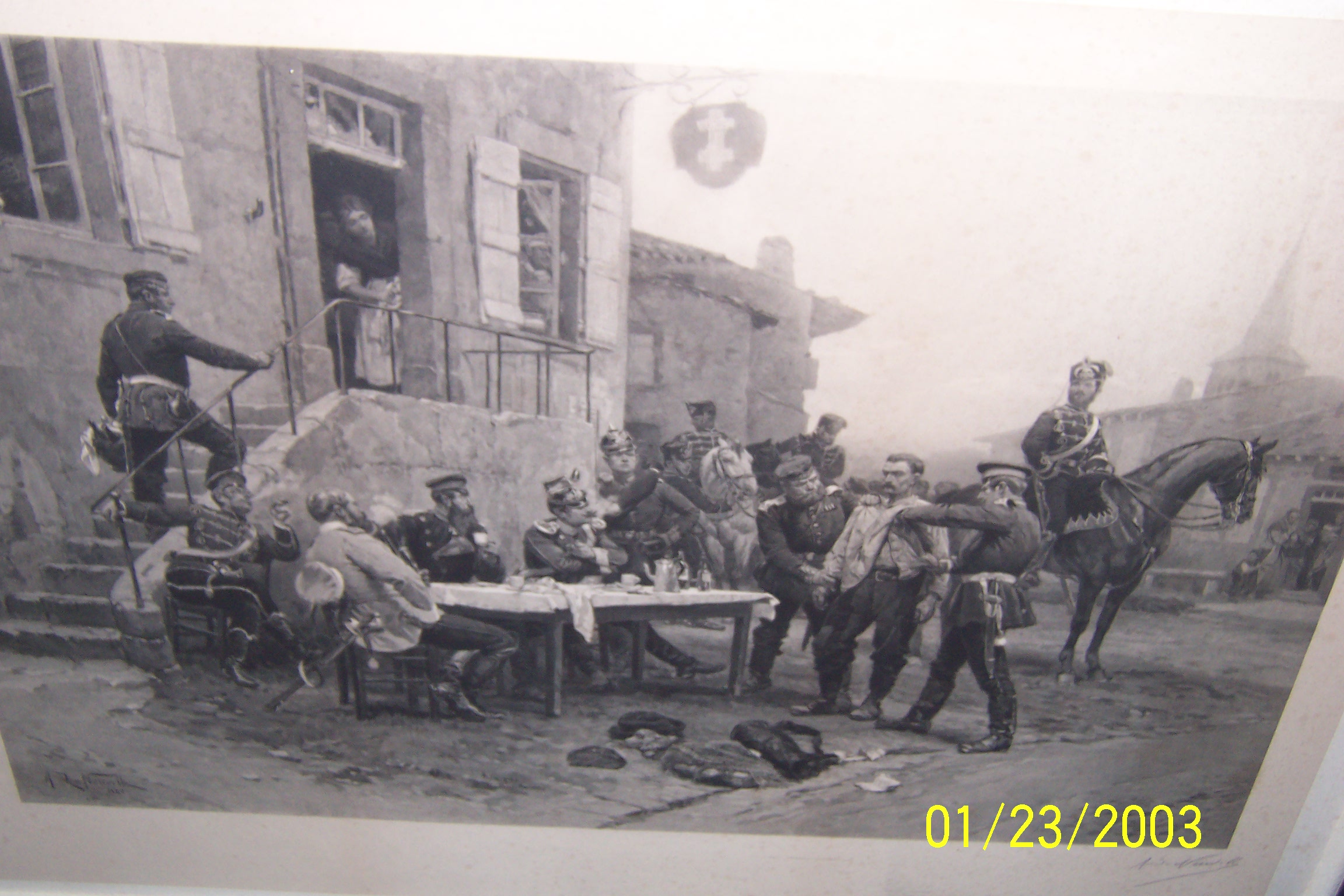 this etching ( as told it was )  is in exellent condition. the frame is , i'm presuming, is old because its a very large wooden frame ,the glass is thin and the tack/nails is holding on an old wood back. it  is of an european infentry scene. if anyone can give me a guess as to its worth, any information on this or where i can go to find this info would be greatly appreciated or even post it on another antique web site. i would get it appraised in person by hands on but lack the monitary means to do so