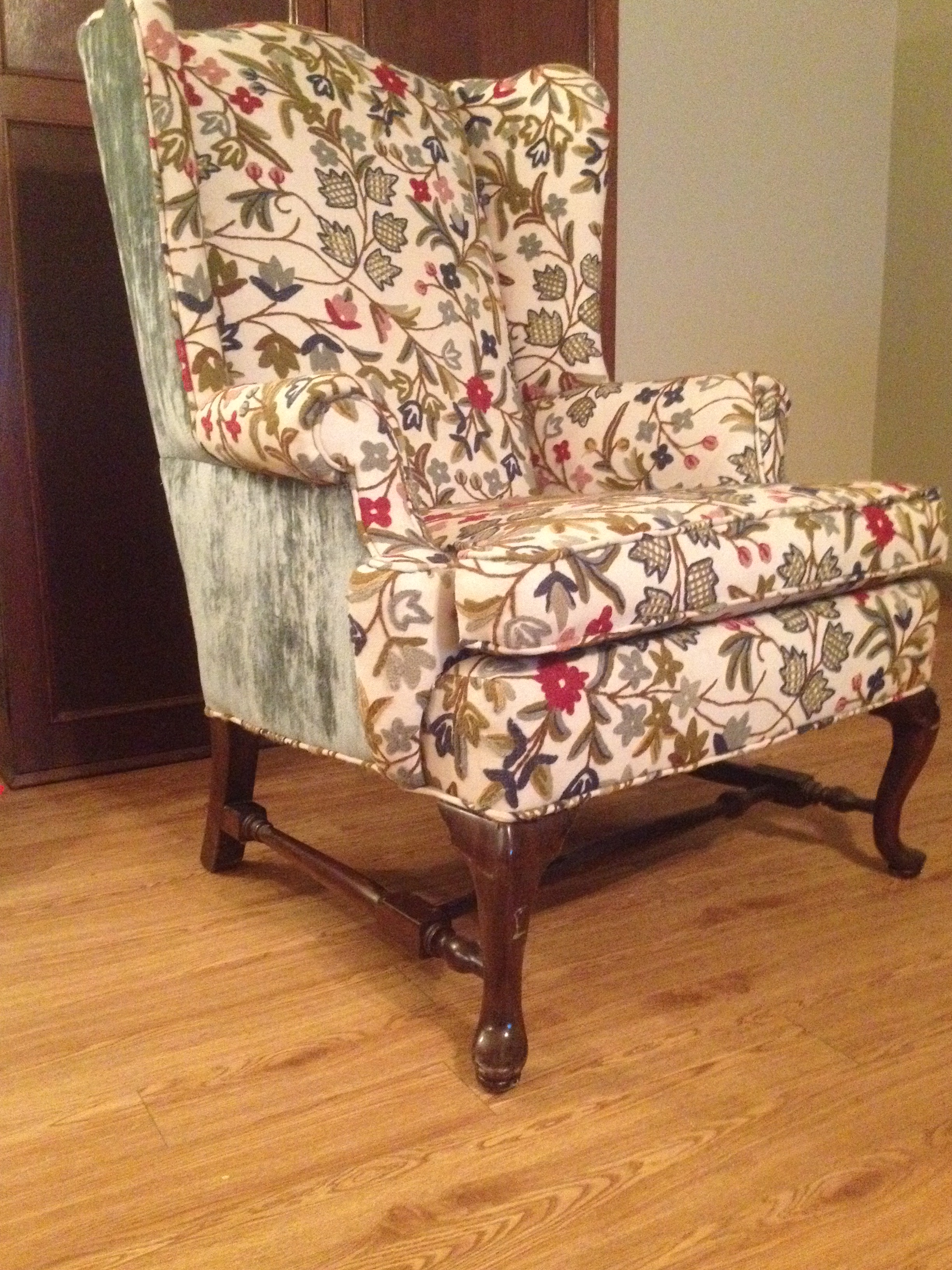 Ethan Allen Traditional Classics Wingback Crewelwork Chair. The back and sides are covered in blue felt.