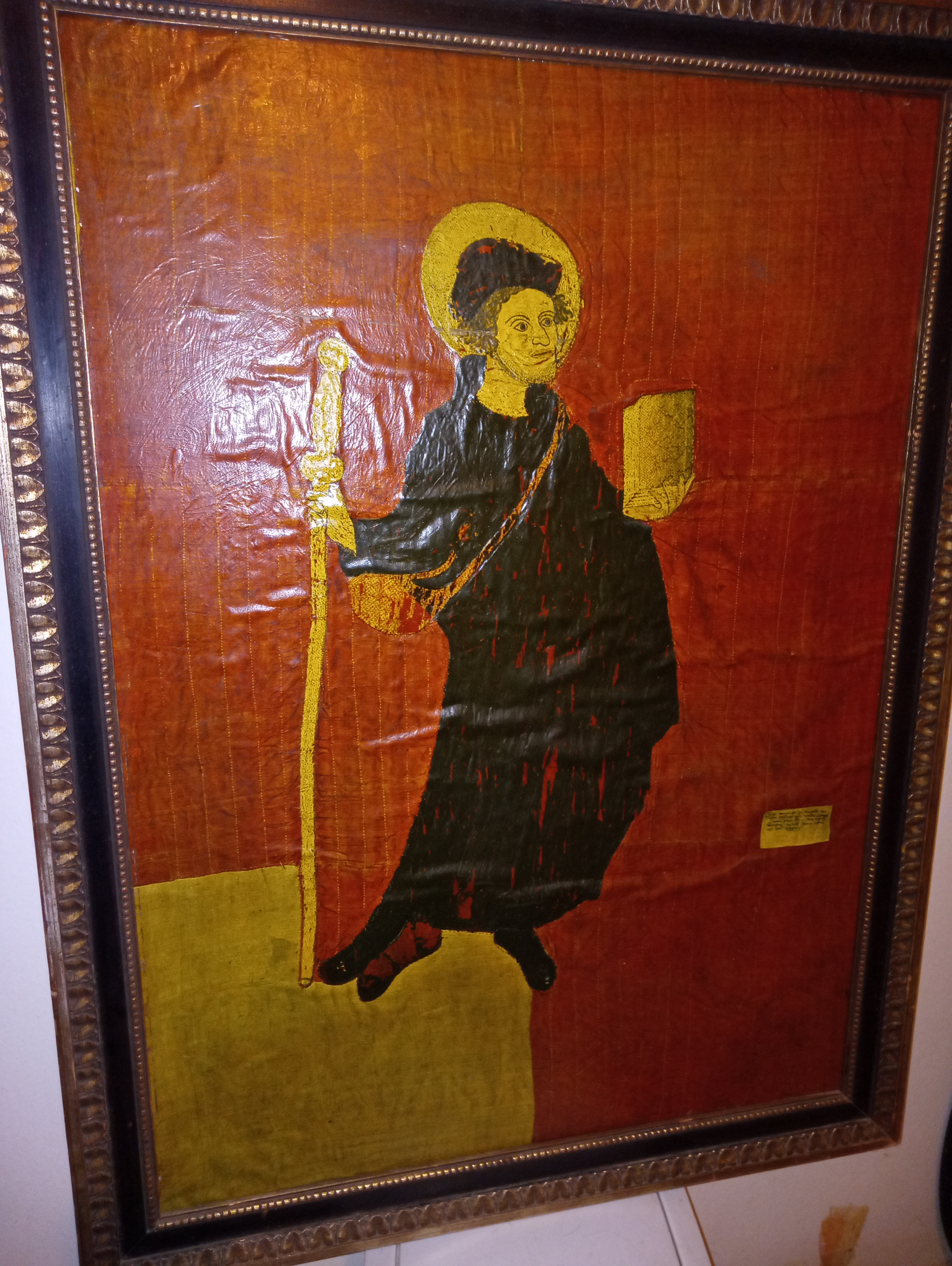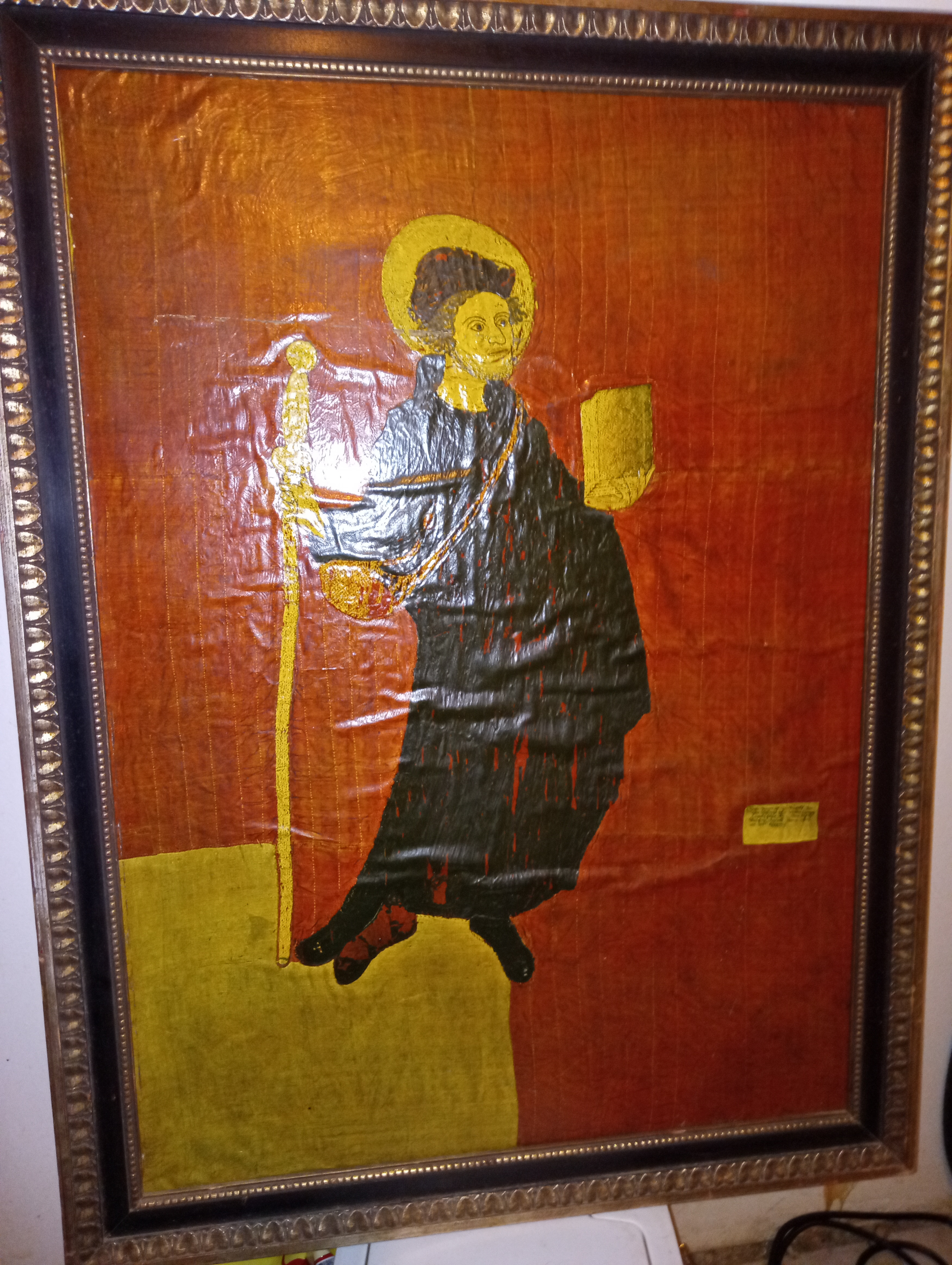 This piece seems to be painted on a fabric-like surface, which is a traditional method in Ethiopian religious iconography. The orange and gold tones, as well as the black robe, suggest it might be inspired by early Ethiopian Orthodox Christian manuscripts or church murals. The facial features and posture are typical of Ethiopian icon paintings, which have a long history dating back to the 4th century when Christianity was adopted in Ethiopia.