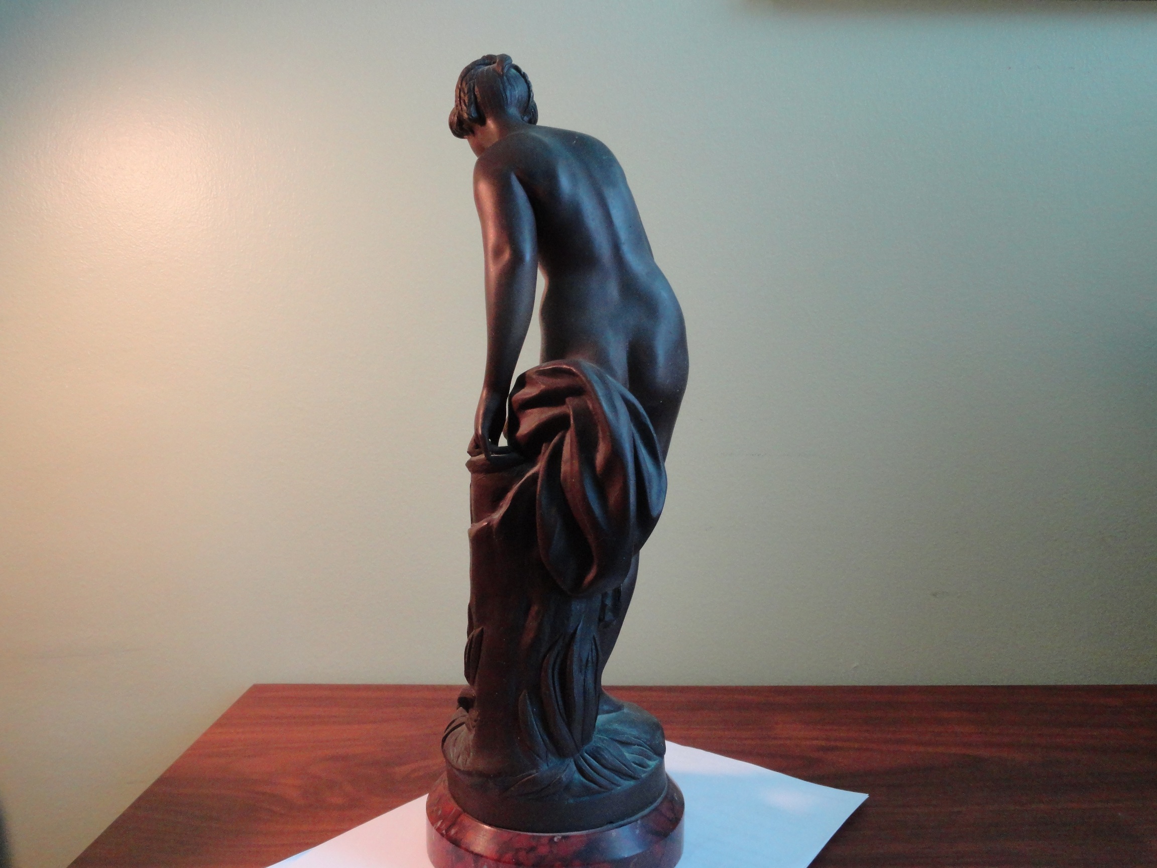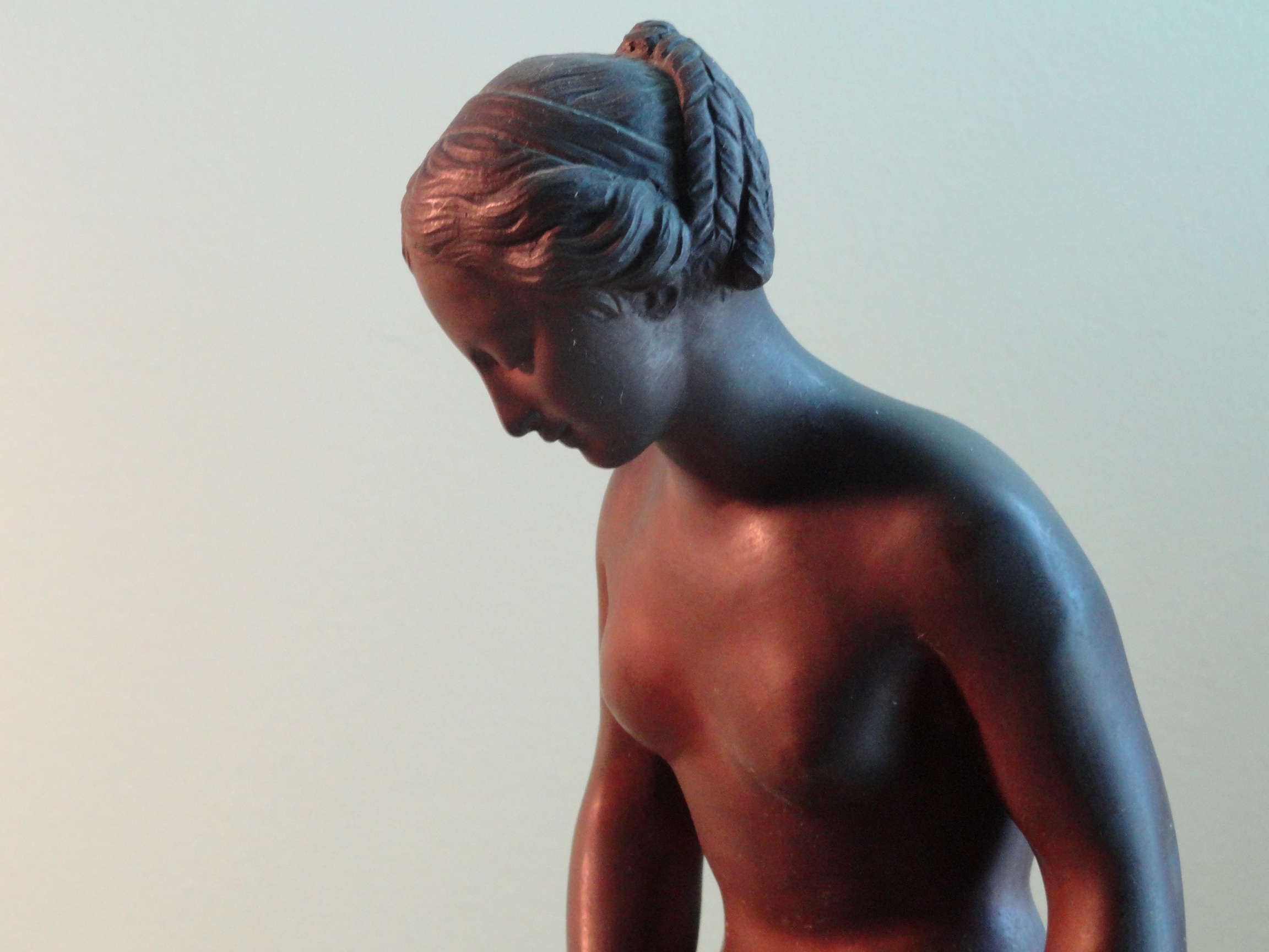 The sculptor has portrayed the moment just before the young girl's bath, as she puts her foot tentatively forward to test the temperature of the water.