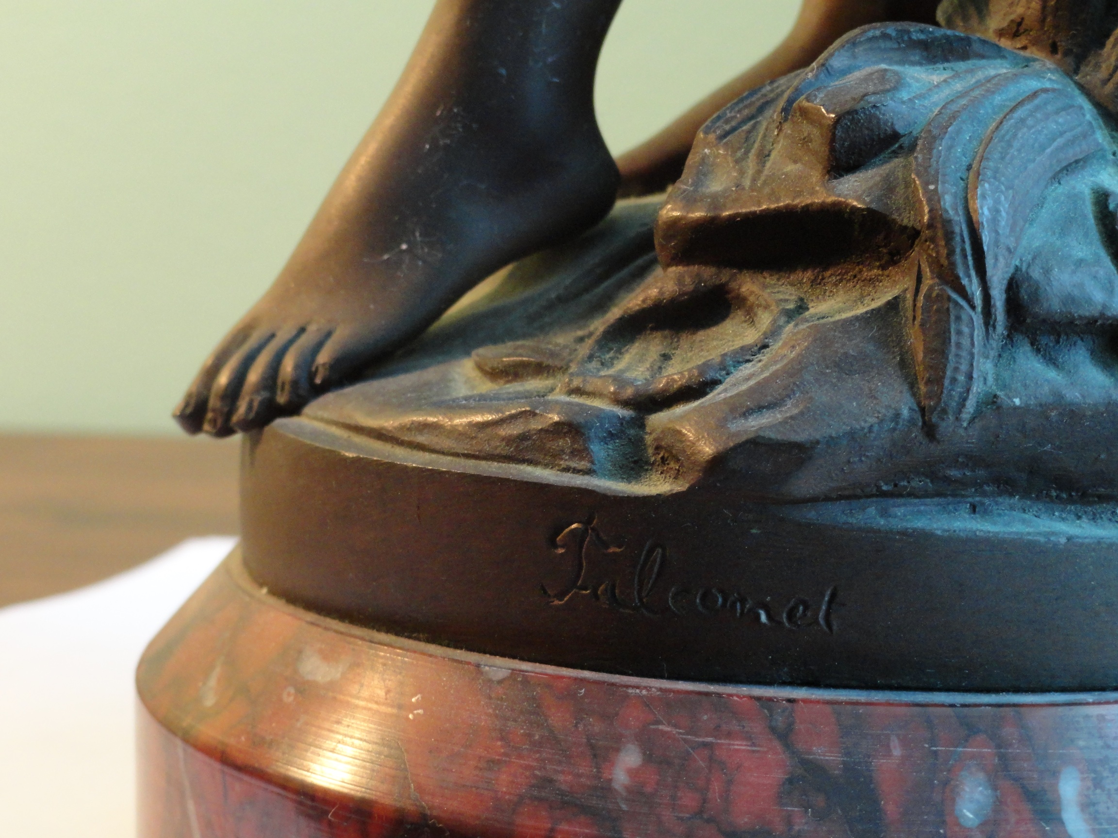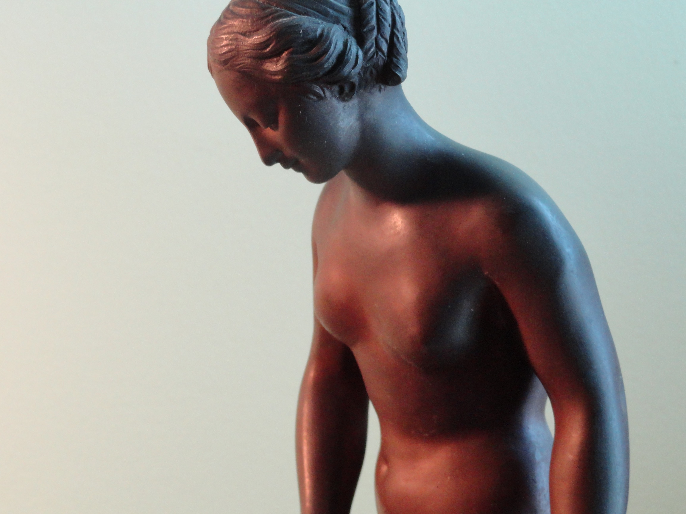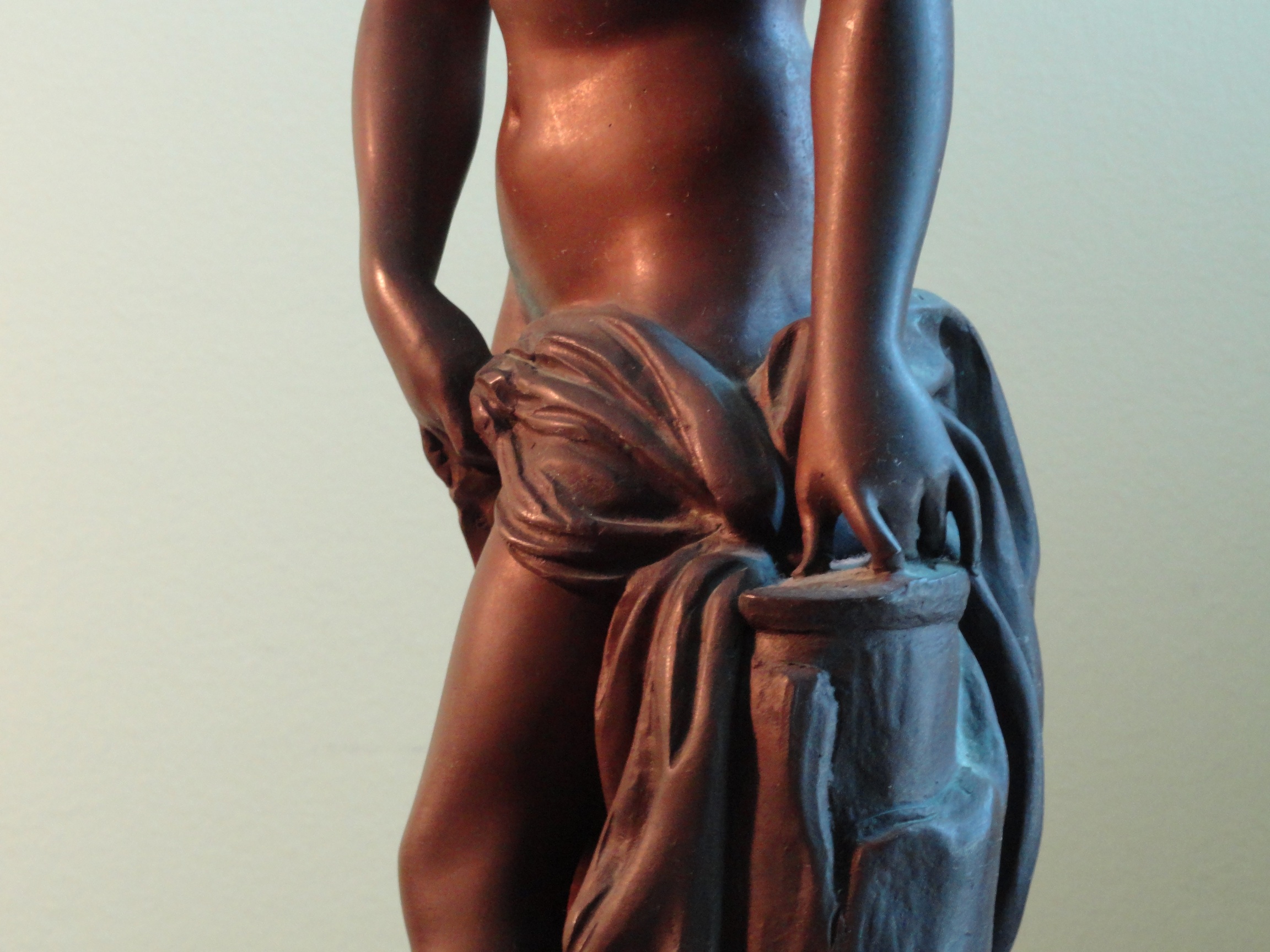Falconet captures the moment when a young girl becomes a women, thereby defining a new feminine aesthetic - long slender body, narrow hips, sloping shoulder, and small breast - which was to impregnate his future work and influence his contemporaries. The girls head is small and her oval face forms a triangle. Her hairstyle was inspred by antiquity; smooth on top, with a cetral parting.