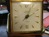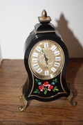 West German clock. Says Europa on the face. The numbers appear to be gold or brass. It is an alarm clock that haz the old style bell sound or can be set to play Edleweiss. It is painted black with flowers on it. Approx. 10" tall. No scratchs or chips in the paint. No scratchs on the face or the back. Has brass legs.