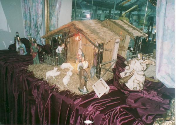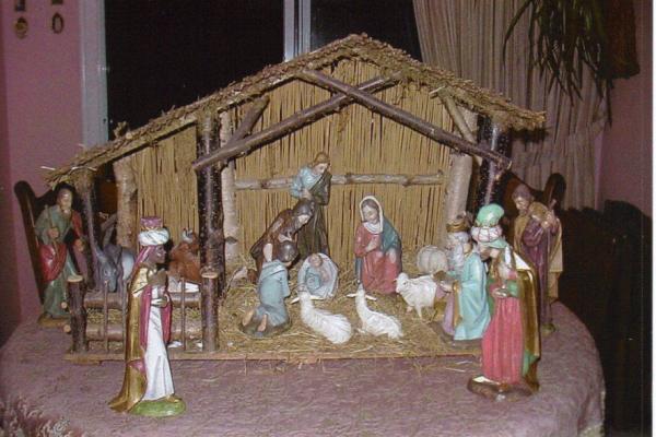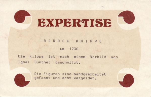 The creche is a reproduction based on a Ignaz Guenther painting circa 1780 with wooden hand carved and painted/gilded figures. It was purchased in Germany and is now located in Brampton,Canada.