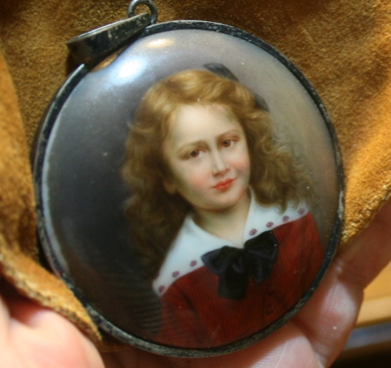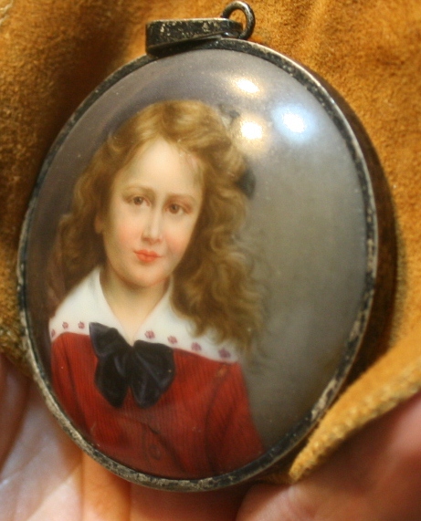 Hello, I purchased this amazingly lovely little pendant at a Bavarian German second hand store a few years back while stationed there with my husband. I couldn't have paid more than 20 euro for it, probably less, but I could tell there was somethng really unique about it and I didn't think it was a print. I have since kept it in a suede pouch and have plans to get it professionally framed, but would like to get some idea of its worth for insurance purposes if nothing else. It appears to be an enamel painting on porcelain. There is no signature that I can see and no information about who the child is. There is a little wear around one edge, a few scratches here and there, but nothing that distracts from the painting, and the silver frame is very tarnished. I would love to simply have someone tell me a little more about it or how I might go about getting it officially appraised. Mainly I just want to know what it really is. I love that the child is so unique. She is not stylized at all. It is definately a painting of a specific child. Any information you can offer me would be greatly appreciated. Thanks,